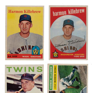 Collection of 54 cards (13 different) of Washington Senators and Minnesota Twins Hall of Famer Harmon Killebrew, each issued by Topps between 1956 and 1969. This collection consists of the following: 1) 1956 Topps (2 cards): Two #164 Killebrew/gray back (Vg-Ex and Vg). 2) 1958 Topps (7 cards): Seven #288 Killebrew (three Ex, Vg-Ex, two Vg, and Gd). 3) 1959 Topps (1 card): #515 Killebrew (Vg). 4) 1960 Topps (4 cards): Four #210 Killebrew (Ex, two Vg/Vg-Ex, and Vg). 5) 1961 Topps (4 cards): Four #80 Killebrew (Ex, Vg-Ex, Vg, and pen mark on reverse, otherwise Vg). 6) 1962 Topps (6 cards): Six #70 Killebrew (Ex+, two Vg-Ex, and three Vg). 7) 1963 Topps (3 cards): Three #500 Killebrew (two Vg-Ex and Vg). 8) 1964 Topps (6 cards): Six #177 Killebrew (two Ex-Mt due to centering, three Vg, and Gd+). 9) 1965 Topps (5 cards): Five #400 Killebrew (Vg-Ex+, two Vg, Gd+, and ink mark on bottom edge, otherwise Vg-Ex). 10) 1966 Topps (6 cards): Six #120 Killebrew (two Ex, two Vg-Ex, and two Vg). 11) 1967 Topps (1 card): #460 Killebrew (Vg-Ex). 12) 1968 Topps (5 cards): Five #220 Killebrew (Ex, two Vg-Ex, Vg, and Gd). 13) 1969 Topps (4 cards): Four #375 Killebrew (two Vg-Ex+, Vg+, and Vg). This is a very attractive mid-grade collection of vintage Harmon Killebrew cards. Total: 54 cards.