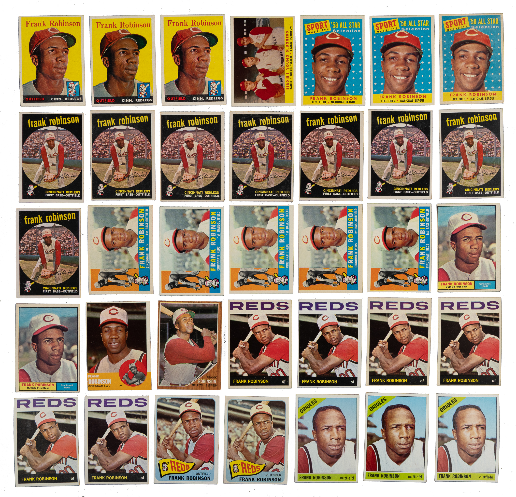 Collection of 49 cards (15 different) of Cincinnati Reds and Baltimore Orioles Hall of Famer Frank Robinson, each issued by Topps between 1958 and 1969. This collection consists of the following: 1) 1958 Topps (8 cards): Four #285 F. Robinson (three Ex and Vg-Ex+), 386 Birdie's Young Sluggers (Vg+), and three 484 F. Robinson AS (Ex, Vg-Ex, and Vg+). 2) 1959 Topps (9 cards): Nine #435 F. Robinson (Ex-Mt, Ex, three Vg-Ex, three Vg, and Pr-Fr due to pinhole). 3) 1960 Topps (5 cards): Five #490 F. Robinson (two Ex, two Vg-Ex, and Vg). 4) 1961 Topps (2 cards): Two #360 F. Robinson (both Gd). 5) 1962 Topps (1 card): #350 F. Robinson (Vg-Ex). 6) 1963 Topps (1 card): #400 F. Robinson (Vg). 7) 1964 Topps (6 cards): Six #260 F. Robinson (Ex-Mt, Ex, three Vg-Ex, and Pr-Fr due to mark on reverse). 8) 1965 Topps (3 cards): Three #120 F. Robinson (Vg, Pr-Fr due to ink marks on reverse, and miscut right edge, otherwise Vg). 9) 1966 Topps (3 cards): Three #310 F. Robinson (Ex, Vg-Ex, and Vg+). 10) 1967 Topps (6 cards): Two #1 The Champs (small ink marks on reverse, otherwise Ex and slightly miscut top edge, otherwise Vg-Ex+) and four 100 F. Robinson (three Vg-Ex and Vg). 11) 1968 Topps (2 cards): Two #500 F. Robinson (Vg-Ex and 100/0 T/B, otherwise Vg). 12) 1969 Topps (3 cards): Three #250 F. Robinson (two Vg-Ex and Vg+). This is a very attractive mid-grade collection of vintage Frank Robinson cards with many highlights. Total: 49 cards.