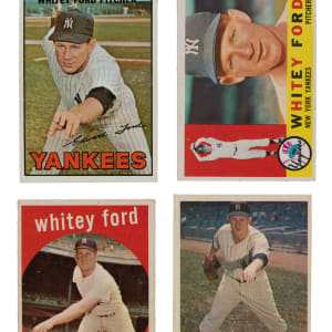 Collection of 40 cards (15 different) of New York Yankees Hall of Famer Whitey Ford, each issued by Topps (except for one Bowman) between 1953 and 1967. This collection consists of the following: 1) 1953 Topps (4 cards): Four #207 Ford (85/15 L/R, otherwise Ex-Mt+, two Vg, and Fr). 2) 1954 Topps (2 cards): Two #37 Ford (Gd and Pr-Fr). 3) 1955 Bowman (1 card): #59 Ford (Vg-Ex). 4) 1956 Topps (3 cards): Three #240 Ford (two Vg and Gd). 5) 1957 Topps (4 cards): Four #25 Ford (two Vg-Ex and two Vg). 6) 1958 Topps (3 cards): Three #320 Ford (two Ex and 10/90 L/R, otherwise Ex+). 7) 1959 Topps (5 cards): Five #430 Ford (Vg-Ex+ and four Vg). 8) 1960 Topps (4 cards): Four #35 Ford (two Ex and two Vg-Ex). 9) 1961 Topps (3 cards): Three #160 Ford (Ex, Vg-Ex, and Vg+). 10) 1962 Topps (1 card): #310 Ford (Gd+). 11) 1963 Topps (2 cards): Two #446 Ford (both Vg). 12) 1964 Topps (1 card): #380 Ford (Vg). 13) 1965 Topps (2 cards): Two #330 Ford (both Vg). 14) 1966 Topps (3 cards): Three #160 Ford (two Vg-Ex and Vg+). 15) 1967 Topps (2 cards): Two #5 Ford (Ex and Vg). This is a very attractive mid-grade collection of vintage Whitey Ford cards with many highlights. Total: 40 cards.