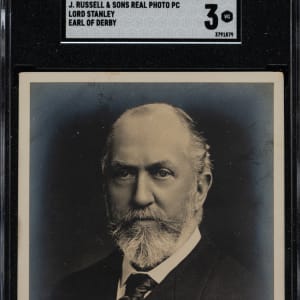 Graded VG 3 by SGC. One of only two examples of this postcard graded by SGC. While few hockey fans will recognize the gentleman pictured on this rare twentieth-century postcard, his name today is virtually synonymous with the game: Frederick Arthur Stanley, 16th Earl of Derby, or as he is succinctly titled here on this card: "Earl of Derby." It was Stanley, in 1893, who began the tradition of awarding a trophy cup to Canada's top-ranked amateur hockey team. Later, in 1915, it was awarded to the winner of the championship series between two professional leagues, the National Hockey League and the Pacific Coast Hockey Association. Finally, in 1926, "The Stanley Cup" became the official championship trophy of the NHL, with the tradition continuing to this day. The offered postcard was produced by the James Russell & Sons firm circa 1905. Frederick Arthur Stanley, 16th Earl of Derby, known as Lord Stanley of Preston after 1886, was an English politician who later served as the sixth Governor General of Canada, from 1888 to 1893. He was also an avid sportsman, and it was his love of the game of hockey that motivated him to present the Stanley Cup in 1893. In 1946, Stanley was elected to the Canadian Hockey Hall of Fame. The postcard displays remarkable clarity. This example has never been mailed and there is no writing on the postcard reverse. This is a very rare postcard relating to the history of hockey and the birth of the Stanley Cup.