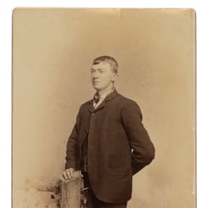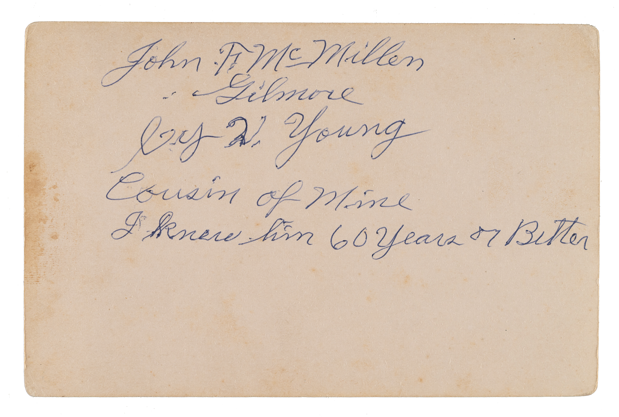 Remarkable and very early cabinet photograph featuring Hall of Fame pitcher Cy Young produced by R. Stevenson of Atchison, Kansas. According to our research, Richard Stevenson was a photographer located at 317 Commercial (the address stamped on the bottom mount of the offered cabinet) in Atchison between approximately March 1881 and October 1885. This would put Young between the ages of 14 and 18 in the offered studio photograph. The image, in which Young is dressed in formal attire, is one we have not seen previously and the timing of the photograph aligns with Young's overall appearance, especially when compared to his earliest known baseball cards, such as the circa 1890-1892 John H. Ryder cabinet and the 1893 Just So Tobacco. We presented the image to renowned photograph expert Mark Fimoff, co-chair of the Society for American Baseball Research’s Pictorial History Committee, who confirmed that it is indeed Cy Young pictured. This cabinet photograph comes to us with an interesting background, as highlighted by our consignor and also as noted on the reverse of the cabinet itself. Our consignor received this piece from her father-in-law, who obtained it, along with a shotgun said to belong to Young as well, in 1980 from one of Young's cousins. The cousin, John F. McMillen Gilmore, wrote his name on the back of the cabinet, along with Cy Young's, and "Cousin of Mine / I knew him 60 years or Better." The piece remained with the father-in-law for decades until recently, when our consignor began researching it and ultimately decided to place it up for auction. The photograph exhibits exceptional clarity and is particularly striking, especially considering Young's youthful innocence, unaware that he would go on to become one of the best pitchers the game of baseball has ever seen. A tiny, unobtrusive tear measuring less than a quarter of an inch is present along the top border and mentioned for accuracy, though it in no way detracts from the piece's overall appearance. The cabinet measures 4-1/8 x 6-3/8 inches in total dimensions. It should be noted that we submitted this piece to SGC for encapsulation, strictly hoping to preserve it, and SGC declined to encapsulate. This is an extremely fascinating and significant piece depicting legendary Hall of Famer Cy Young in perhaps his earliest known photograph!