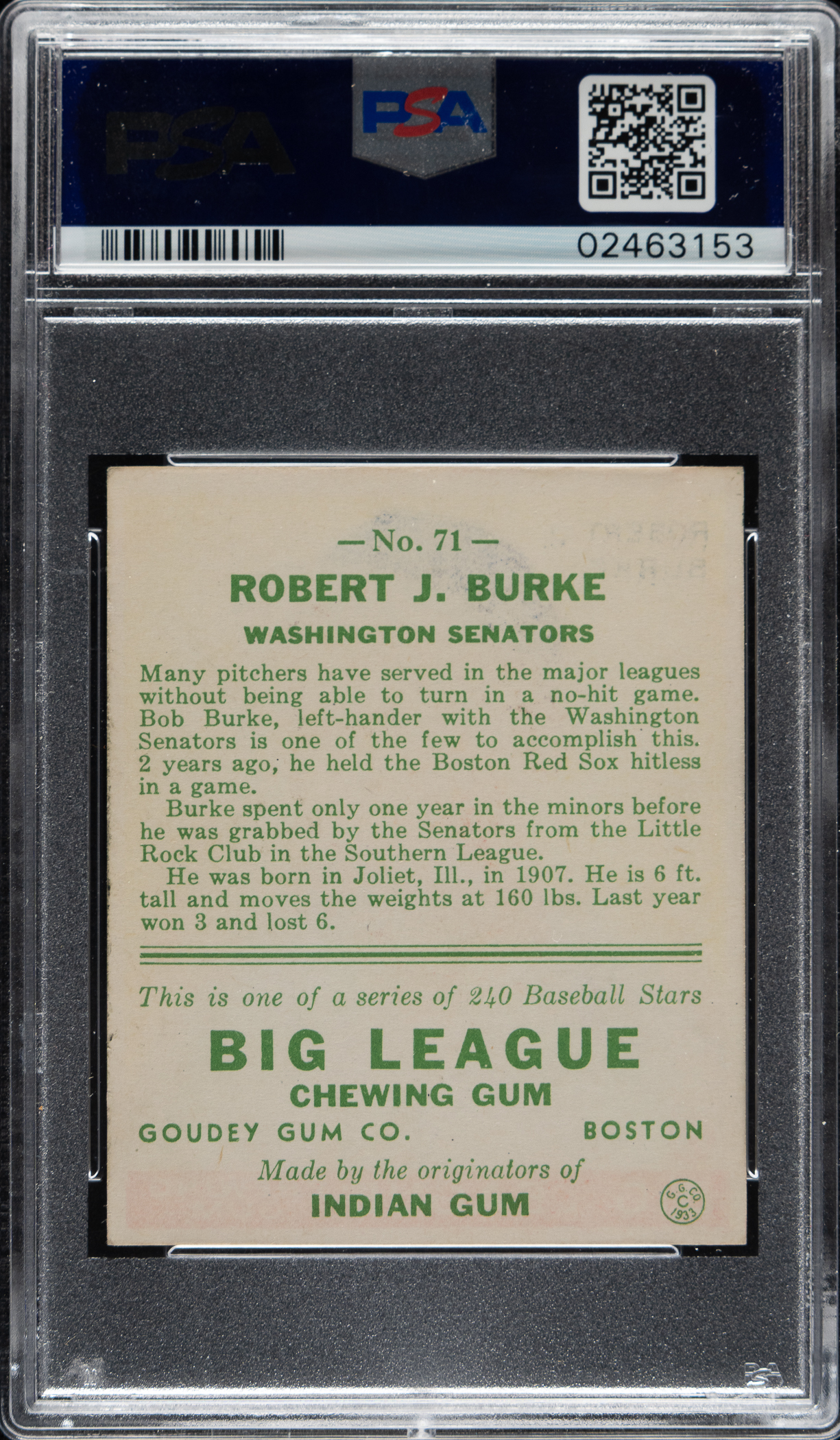 Graded NM 7 by PSA. Washington Senators.