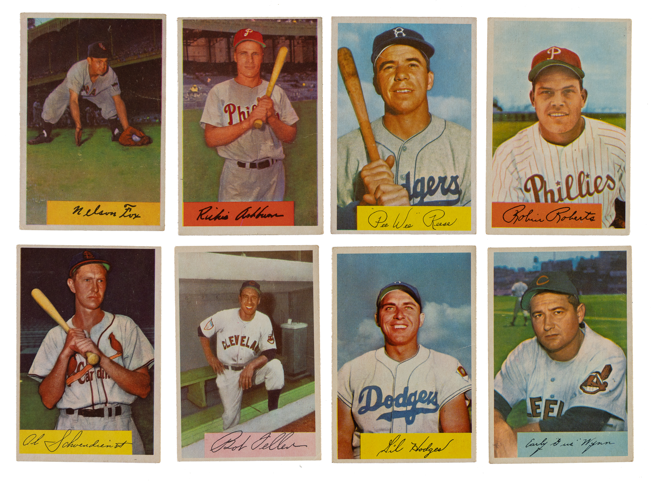 Presented is a near-complete set of 1954 Bowman consisting of 173 different cards (out of 225) from one of the most overlooked (and compared to many other sets, most reasonably valued) bubble-gum card issues from the 1950s. This near-complete set is highlighted by 12 Hall of Famers, including Campanella, Rizzuto, Feller and Reese. Condition is 10% Ex or slightly better, 73% Vg to Vg-Ex, and 17% lesser (including one with a slight miscut). Keys: #1 Rizzuto (Gd+), 6 Fox (Gd), 15 Ashburn (Gd), 57 Wilhelm (Vg), 58 Reese (Gd), 90 Campanella (Gd+), 95 Roberts (Gd), 101 Larsen RC (Vg-Ex), 110 Schoendienst (Vg-Ex+), 132 Feller (Vg), 138 Hodges (Vg), and 164 Wynn (Vg). Missing the following fifty-one cards for completion: #2, 11, 22, 23, 30, 32, 33, 44, 45 Kiner, 46, 48, 50, 52, 53, 54, 62 Slaughter, 64 Mathews, 65 Mantle, 66 Piersall, 84 Doby, 89 Mays, 91, 97, 106, 111, 113, 122, 126, 127, 128, 129, 141, 145 Martin, 154, 157, 161 Berra, 167, 168, 170 Snider, 177 Ford, 187, 193, 195, 196 Lemon, 199, 203, 204, 207, 217, 218, and 224. Very presentable, mostly mid-grade near-complete set. Total: 173 cards.