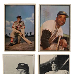 Presented is an attractive pair of 1953 Bowman Black and White and Color partial sets. Several Hall of Famers and stars highlight this collection of 125 different cards, including Casey Stengel, Johnny Mize, Monte Irvin, and Leo Durocher. This collection consists of the following: 1) 1953 Bowman Black and White (38/64): Condition is 68% Gd to Vg and 32% Pr to Fr (including some due to marks on the reverse). Missing the following 26 cards for completion: #2, 6, 7, 8, 10, 17, 19, 21, 23, 24, 25 Sain, 27 Lemon, 28 Wilhelm, 30, 31 Woodling, 32, 37, 38, 43, 44, 46 Harris, 49, 52 Branca, 53, 54, and 59. Keys: #1 Bell (Gd+), 15 Mize (Fr), 26 Roe (Fr), 36 Piersall (Pr), 39 Stengel (Fr), 51 Burdette (Vg+), 60 Cox (Vg), and 64 Hansen (Pr). 2) 1953 Bowman Color (87/160): Condition is 73% Vg (including some Vg-Ex) and 27% lesser (including a few that measure small and one with a possible slight trim). Two cards have been professionally graded and encapsulated by PSA. Keys: #1 Williams (Vg), 51 Irvin (ink marks on reverse, otherwise ), 55 Durocher (ink marks on reverse, otherwise Vg-Ex), 81 Slaughter (Vg), 113 (VG-EX 4), and 149 (VG-EX 4). Missing the following 73 cards for completion: #3, 6, 7, 8, 9 Rizzuto, 10 Ashburn, 12, 18 Fox, 21, 26, 27, 28, 32 Musial, 33 Reese, 40 Doby, 44 Bauer/Berra/Mantle, 45, 46 Campanella, 48, 49, 53, 54, 57, 58, 59 Mantle, 60, 61, 62 Kluszewski, 63, 65 Roberts, 66, 70, 71, 73, 77, 78, 80 Kiner, 83, 84, 91, 92 Hodges, 93 Rizzuto/Martin, 95, 97 Mathews, 99 Spahn, 101 Schoendienst, 105, 106, 108, 109, 110, 111, 114 Feller, 116, 117 Snider, 118 Martin, 121 Berra, 122, 125, 126, 130, 131, 132, 133, 134, 141, 143, 146 Wynn, 148, 151, 153 Ford, 158, and 160 Abrams. This is a very presentable medium- to lower-grade collection of 1953 Bowman baseball, consisting of cards from both the B&W and Color series. Total: 125 cards.