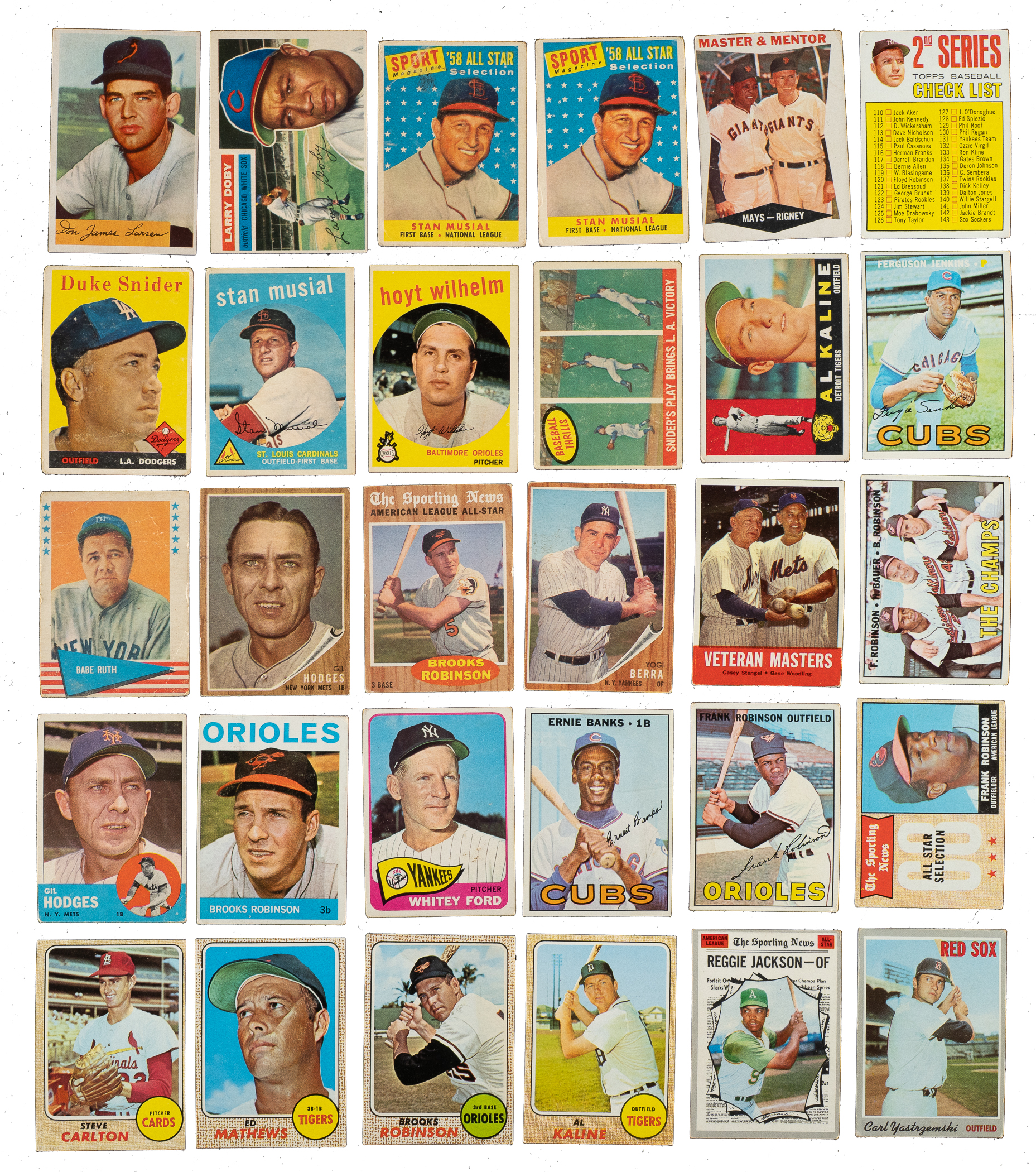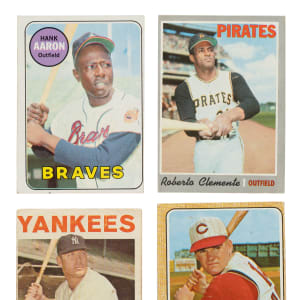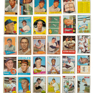 Shoebox collection of 837 baseball cards, including Bowman, Fleer, Post Cereal, and Topps issues, spanning the years 1953 to 1971. The collection is highlighted by 113 Hall of Famers, including Mickey Mantle, Hank Aaron, Roberto Clemente, and Sandy Koufax. This collection consists of the following: 1) 1951 Topps Red Backs (1 card): #25 (Vg-Ex). 2) 1953 Bowman Black and White (3 cards): All Pr to Fr due to marks on the reverse. Includes the following: #40, 63, and 64 Hansen. 3) 1953 Bowman Color (11 cards): Condition is three Vg/Vg-Ex, Fr, and eight Pr-Fr (due to pen writing on reverse). Includes: #16, 17, 19, 20, 24, 38, 47, 55 Durocher (Fr), 64, 69, and 127. 4) 1954 Bowman (12 cards): Condition ranges from Fr to Vg-Ex (averaging Gd-Vg). Includes: #16, 28, 41, 47, 68, 79, 101 Larsen RC (Vg), 102, 110 Schoendienst (Vg+), 185, 191, and 223. 5) 1954 Topps (3 cards): #49 (Gd), 61 (Vg), and 233 (Vg-Ex+). 6) 1955 Topps (46 cards): Condition ranges from Pr to Ex (averaging Vg/Vg-Ex), with one better. Does not include any cards from the high-number series (#161-210). Keys: Two #1 Rhodes (Gd and Pr due to back damage). 7) 1956 Topps (166 cards): Includes 48 significant gray backs (#1-100). Condition ranges from Pr to Ex (averaging Gd-Vg), with a couple better. Key: #250 Doby (85/15 T/B, otherwise Vg-Ex). 8) 1957 Topps (45 cards): Condition ranges from Vg to Ex (averaging Vg-Ex), with a couple higher and lower. 9) 1958 Topps (66 cards): Condition ranges from Gd to Ex (averaging Vg/Vg-Ex), with a couple lesser. Keys: #88 Snider (Gd), 400 Fox (Vg), and two 476 Musial AS (Gd+ and Fr). 10) 1959 Topps (66 cards): Condition ranges from Vg to Ex (averaging Vg-Ex), with 15% lesser. Keys: #150 Musial (Gd), 155 Slaughter (100/0 L/R, otherwise Ex), two 156 Ace Hurlers (Ex and Gd), 163 Koufax (Gd), 262 Hitters' Foes, 349 Wilhelm, 383 Words of Wisdom (Fr), 390 Cepeda (Ex+), 408 Keystone Combo, and 468 Snider's Play (Gd). 11) 1959 Fleer Ted Williams (6 cards): Includes: #1 Early Years (Gd), 21 (Vg+), 51 (Vg-Ex), 56 (slightly miscut bottom edge, otherwise Nr/Mt), 70 Williams/Thorpe (Ex+), and 71 (slightly miscut bottom edge, otherwise Ex-Mt). 12) 1960 Topps (20 cards): Condition ranges from Fr to Ex (averaging Vg). Includes: Two #1 Wynn (both Vg), 4, 7 Mays/Rigney (Fr), 32, two 50 Kaline (both Vg), 100 Fox, two 240 Aparicio, 295 Hodges (Vg), 302, 366, 370 Skowron, 426, 427, 459, 462, 530, and 539. 13) 1961 Topps (22 cards): Condition ranges from Vg to Ex (averaging Vg-Ex). Keys: #63 Kaat (Vg-Ex), 65 Kluszewski, 136 Alston, and 404 Hornsby Tops N.L. (Vg-Ex). 14) 1961 Post (4 cards): Allfour cards are "box" versions (hand-cut from cereal boxes). Includes: #86 D. Williams (Vg+), 108 (Pr), 114 (Ex-Mt), and 140 (Ex). 15) 1961 Fleer Baseball Greats (2 cards): #75 Ruth (Pr) and 89 Sisler/Traynor (pencil-marked checklist, otherwise Vg+). 16) 1961 Nu-Card Baseball Scoops (3 cards): #441 Hodges (Vg), 468 Colavito (Vg-Ex), and 472 Fox (Vg+). 17) 1962 Topps (100 cards): Condition ranges from Vg to Ex (averaging Vg-Ex), with a few better and approximately 10% lesser. Keys: Two #85 Hodges (Vg-Ex and pen mark on reverse, otherwise Vg-Ex), 174a Willey/with cap (Vg), 190a Moon/with cap (Ex), 310 Ford (Vg-Ex+), 314 Colavito's Power, 360 Berra (Fr), 382 D. Williams, 462b Tasby/plain cap (Ex-Mt), 468 B. Robinson AS (Vg), 469 Aparicio AS, and 513 Herzog. 18) 1962 Post (17 cards): Condition ranges from Vg to Ex (averaging Vg-Ex), with three lesser. Includes: #27, 51 Minoso (Vg), 56, 74, 76, 80, 81, 100, 102, 106, 121, 118, 121, 134, 146, and two 155. 19) 1963 Topps (32 cards): Condition ranges from Vg to Ex-Mt (averaging Vg-Ex/Ex), with a couple lesser. Keys: #43 Stengel/Woodling (Vg), 165 Kaat (Ex), 245 Hodges (Gd), and 458 Lopez (Vg-Ex). 20) 1963 Post (4 cards): Condition is Ex, Vg-Ex, and two Vg. Includes: #35, 98, 149, and 154 (1963 Jell-O). 21) 1963 Fleer (8 cards): Includes: #1 Barber (color added, otherwise Vg), two 47 (Nr/Mt and Ex-Mt), 53 (Ex), three 64 Cepeda (two Ex and Vg-Ex), and Checklist (tiny stray ink marks, otherwise Vg-Ex). 22) 1964 Topps Stand-Ups (3 cards): Cash (color added, otherwise Gd+), Culp (Fr), and White (Vg). 23) 1964 Topps (80 cards): Condition ranges from Vg to Ex-Mt (averaging Vg-Ex+), with a few lesser. Approximately 50% display coin-rubbed reverses. Keys: #11 NL RBI Ldrs (Ex), 50 Mantle (Fr-Gd), 101 Alston, four 128 Lolich RC (two Vg-Ex, Vg, and slightly miscut right edge, otherwise Vg-Ex), three 136 WS Gm. 1 - Koufax (all Vg), 230 B. Robinson (Vg), and 285 Roberts (Vg-Ex+). 24) 1965 Topps (25 cards): Condition ranges from Vg to Ex-Mt (averaging Vg-Ex+), with a couple lesser and one Nr/Mt. Keys: #1 AL Batting Ldrs (Vg), 99 Hodges, 330 Ford (Gd), and 556 Schoendienst. 25) 1965 Topps Embossed (7 cards): #13 Kaline (Vg), 16 B. Robinson (Gd+), 22 F. Robinson (Vg), 26 Mathews (Vg), 46 Colavito (Vg-Ex+), 52 (Vg), and 69 Gibson (Gd). 26) 1966 Topps (7 cards): #28 P. Niekro (Vg), 92 Yankees (Vg), 160 Ford (Vg-Ex), 221 NL ERA Ldrs w/ Koufax and Marichal, 528 (Vg), 545 (Vg+), and 564 (Vg-Ex+). 27) 1967 Topps (31 cards): Condition ranges from Gd to Vg-Ex (averaging Vg), with one Fr. Includes: #1 The Champs (Vg+), 60 Aparicio, 75, 88, 93, 100 F. Robinson (Gd), 102, 103a Checklist - Mantle (Vg), 103b Checklist - Mantle (Vg+), 215 Banks (Gd), 216 Cash/Kaline, 228 Hodges, 237. 238, 239, 242 NL RBI Ldrs (Vg-Ex), 243, 244 NL HR Ldrs (Vg), 245, two 294 Alston, 333 Jenkins (Vg-Ex+), two 361 Checklist - Clemente, two 422 Wilhelm, two 445 Sutton (Vg-Ex+ and Vg+), 485, 536 J. Niekro RC, and 609 John (Gd). 28) 1968 Topps (19 cards): Condition ranges from Gd to Ex-Mt (averaging Vg-Ex), with one Fr. Includes: #1 NL Batting Ldrs (Ex-Mt), 2, 4, 5 NL HR Ldrs, 6, 19, 20 B. Robinson (Gd), 58 Mathews (Vg-Ex), 154 WS Gm. 4 - Gibson, 230 Rose (slightly miscut left edge, otherwise Vg), 240 Kaline (Vg-Ex+), two 310 Aparicio (both Vg-Ex), 350 Wilhelm, two 373 F. Robinson AS (Ex and Vg), 378 Gibson AS, 408 Carlton (Vg+), and 454. 29) 1
