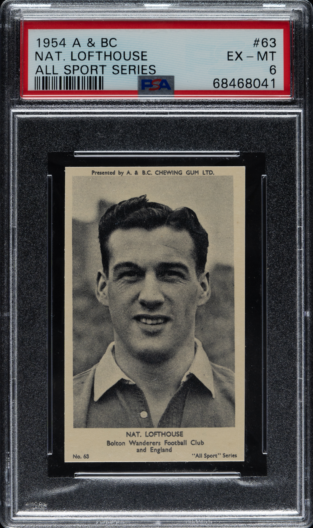 Lot # 3281: 1954 A & BC All Sport Series Soccer #63 Nat Lofthouse PSA EX-MT 6