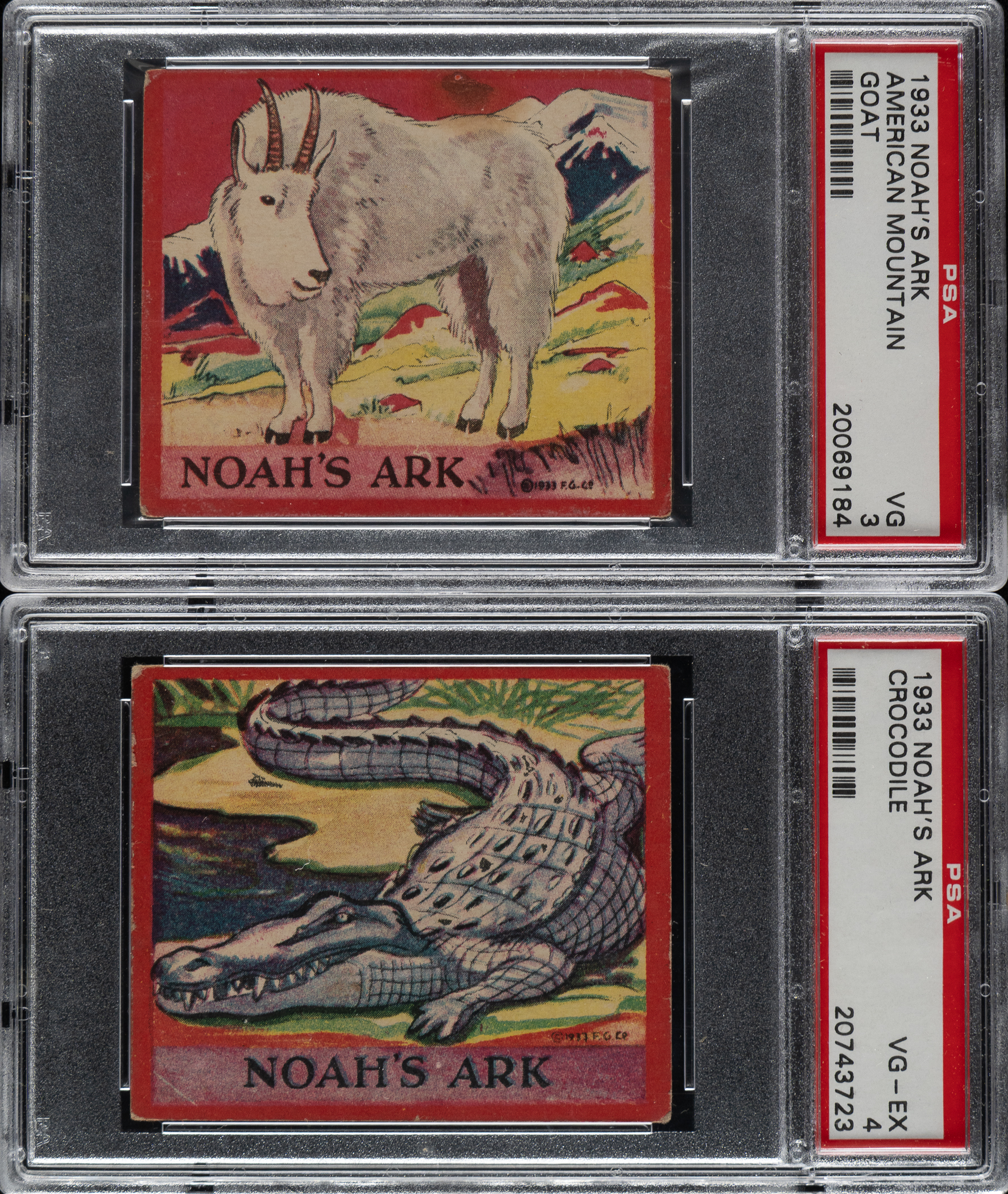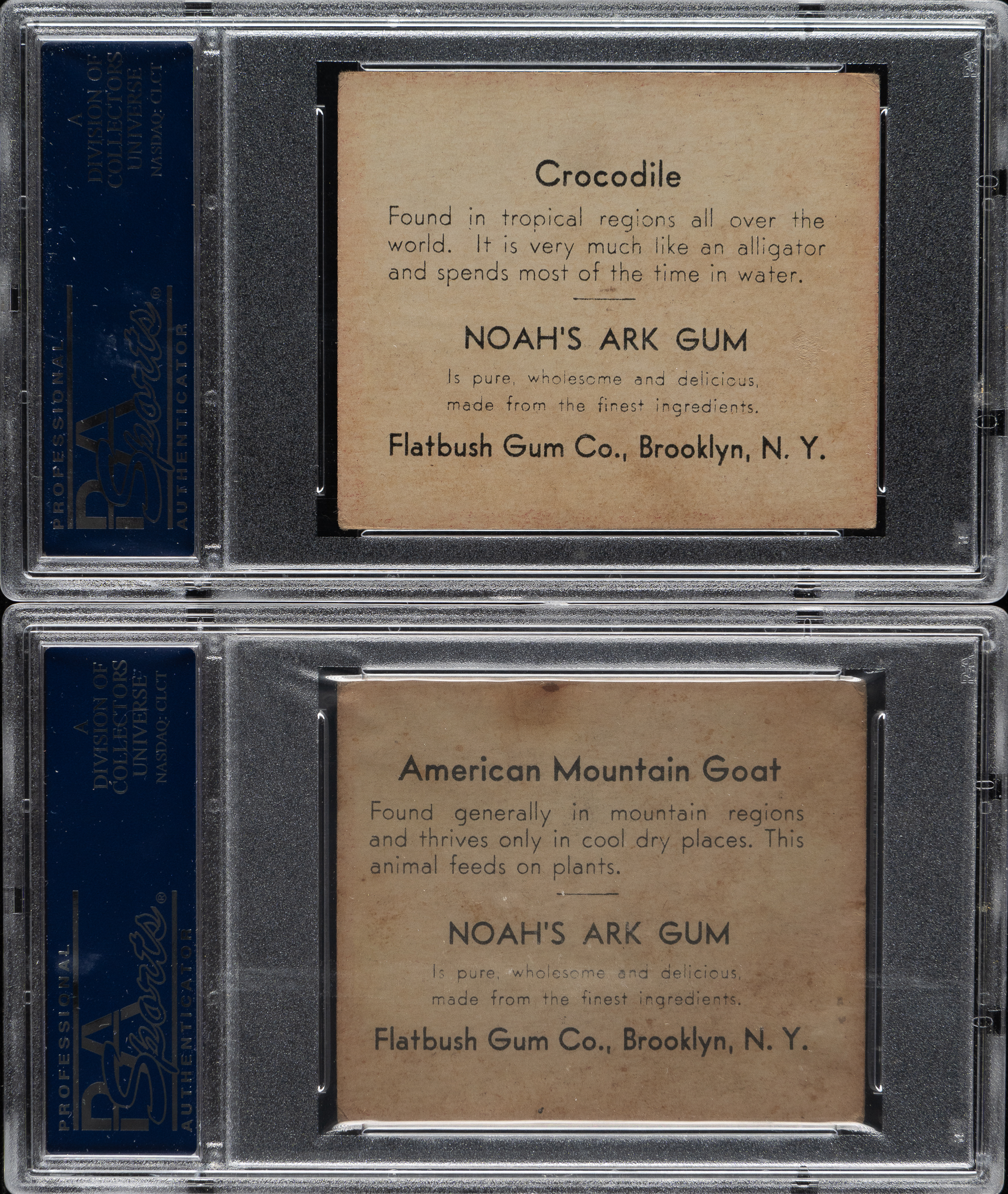 Pair of 1933 R100 Flatbush Gum Co. "Noah's Ark" cards, both graded and encapsulated by PSA. This pair consists of the following: American Mountain Goat (VG 3) and Crocodile (VG-EX 4). Total: 2 cards.