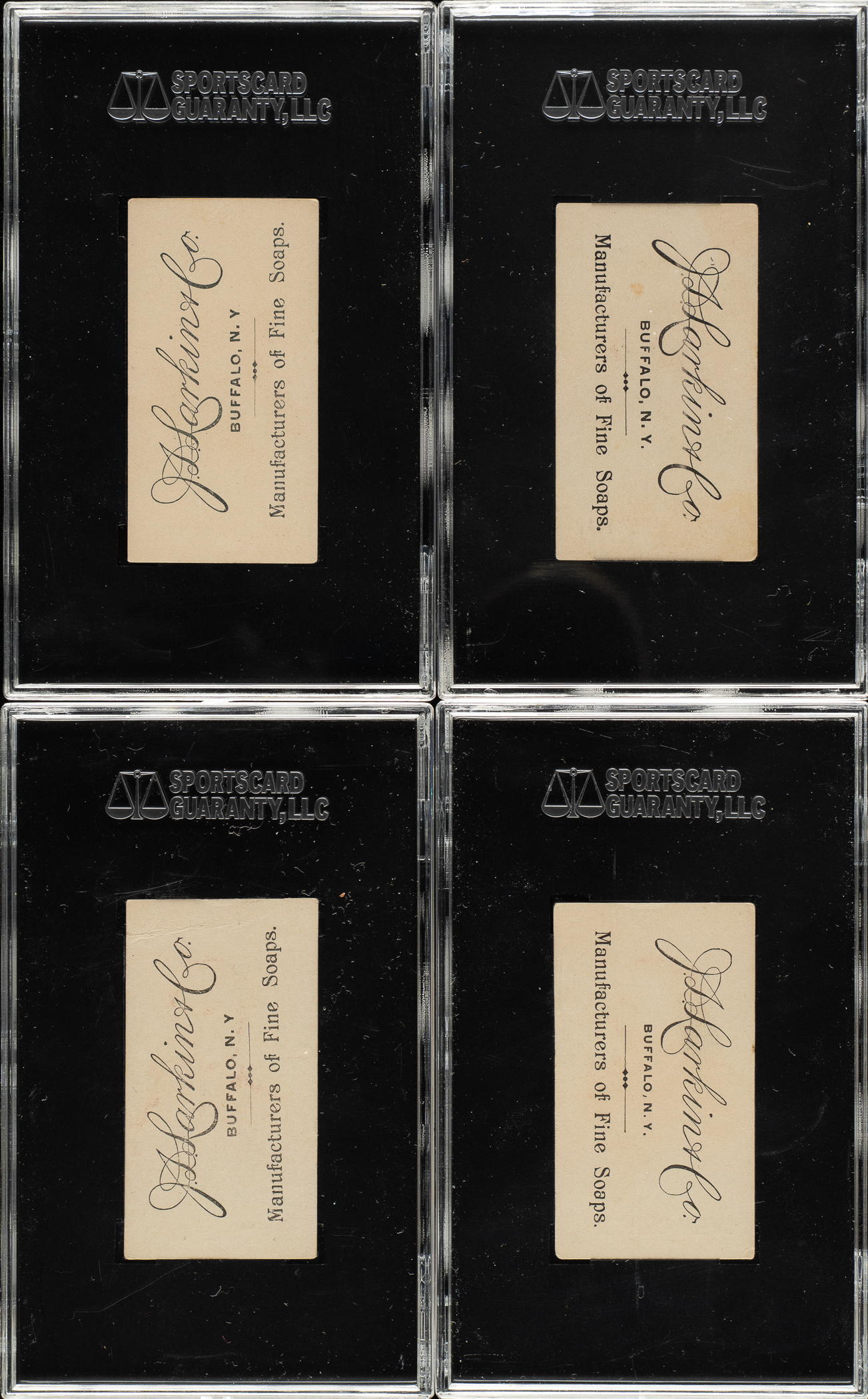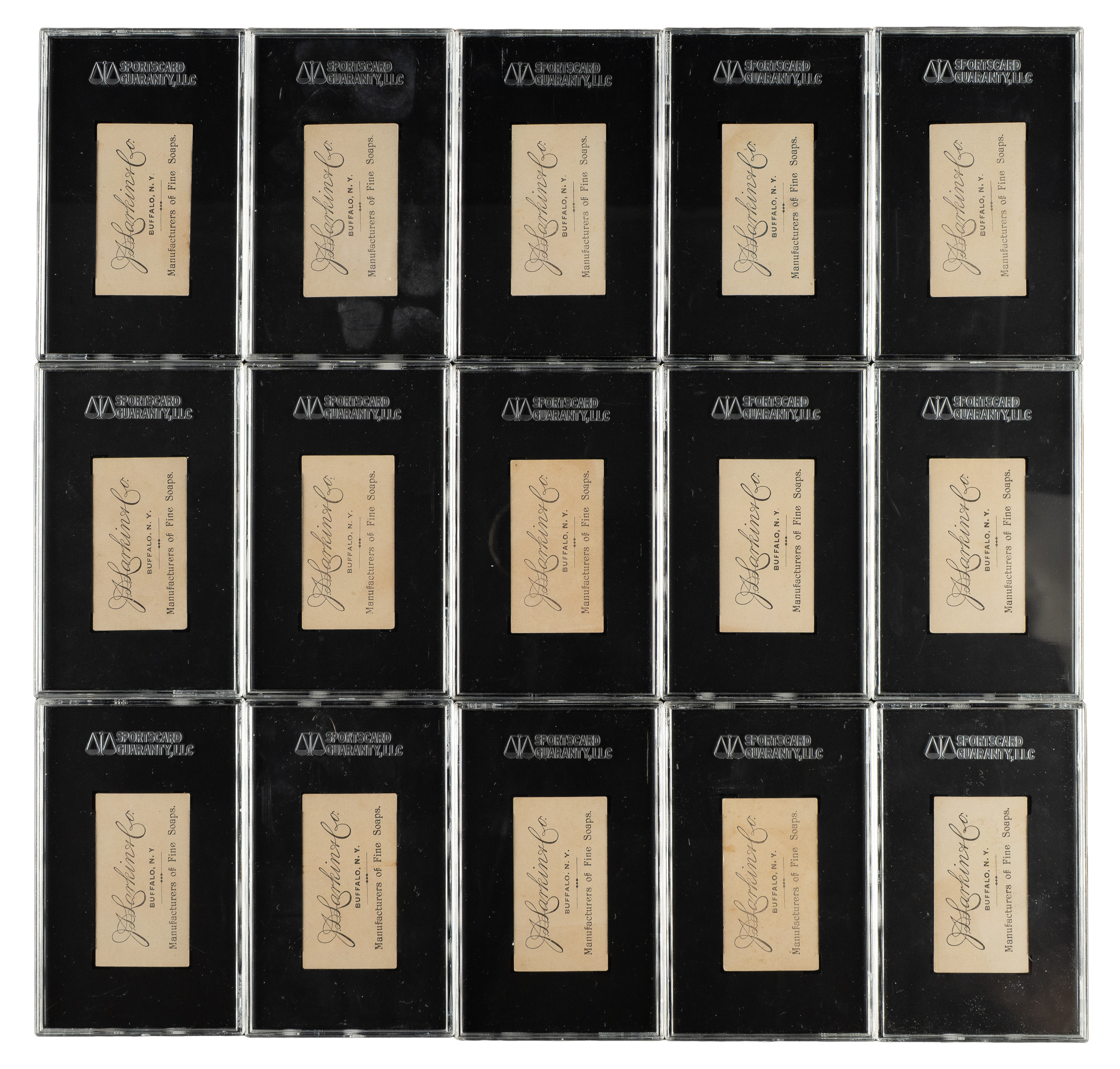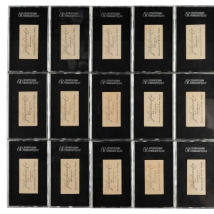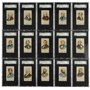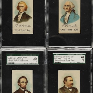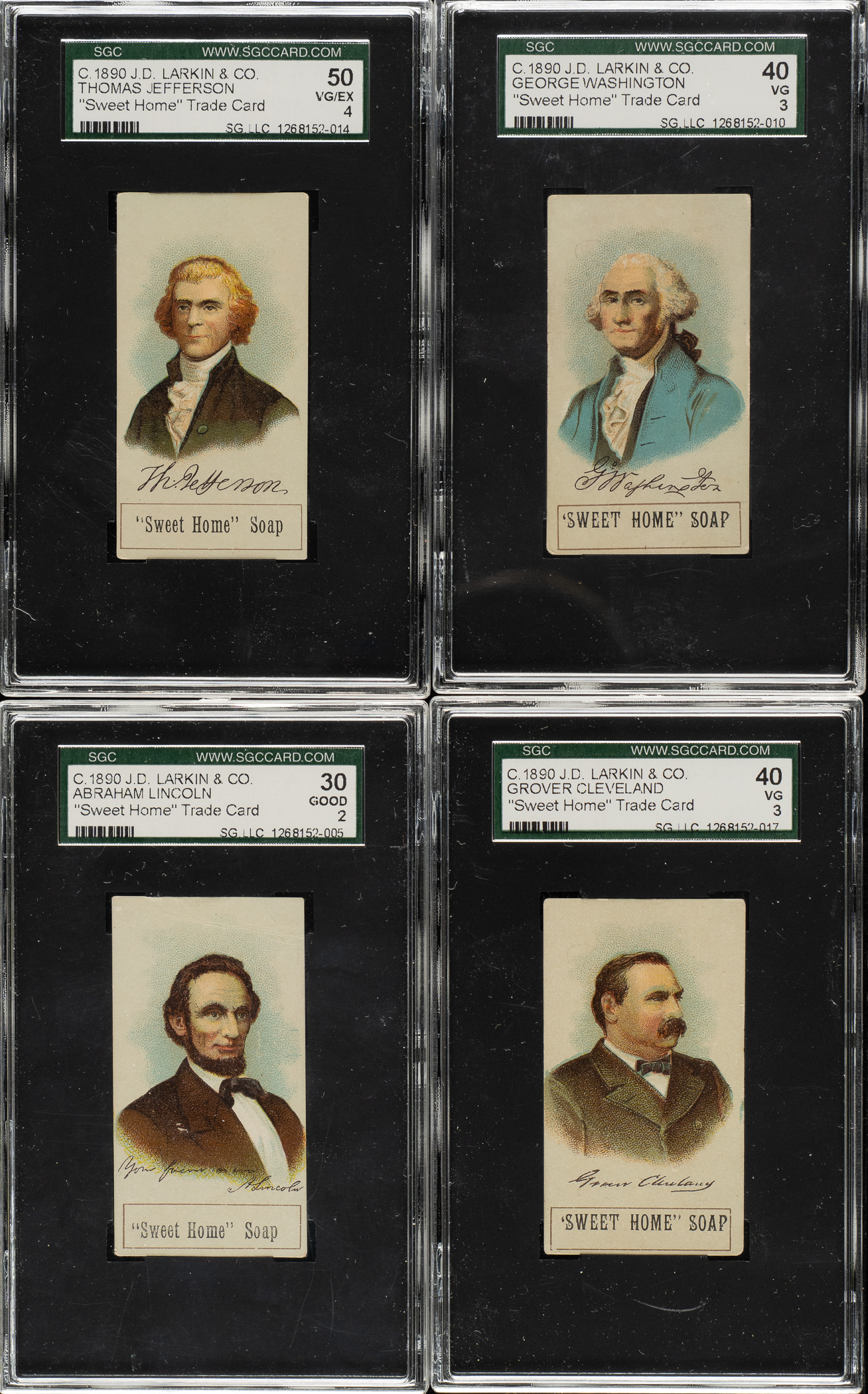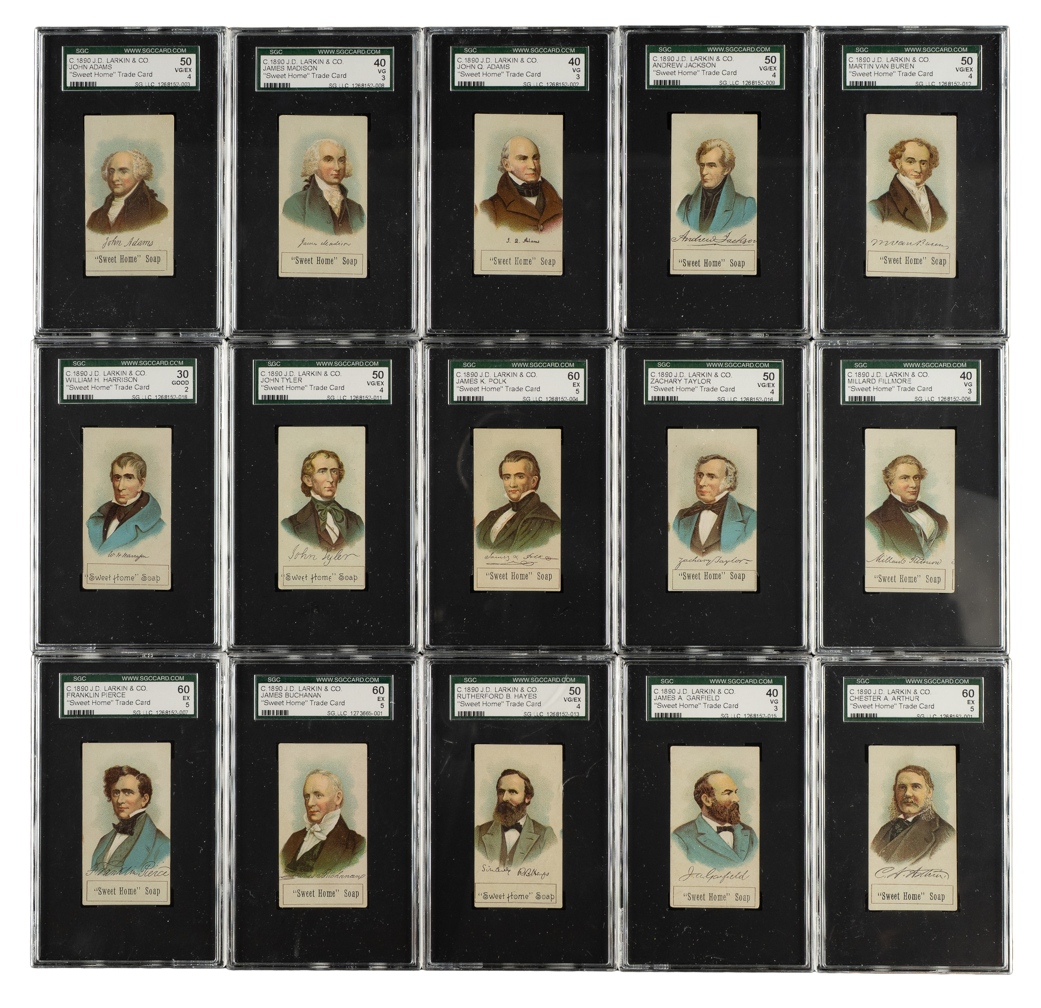 Near-complete set of nineteen cards (out of twenty-three) featuring various U.S. Presidents from the 1889 H600 J. D. Larkin series. This colorful set of cards features a portrait of each President above a facsimile signature and an advertisement for "Sweet Home" soap, Larkin's primary product. Each card has been professionally graded and encapsulated by SGC. Missing the following four cards for completion: Monroe, Johnson, Grant, and B. Harrison. SGC Grading Composite: EX 60 (4 cards): Arthur, Buchanan, Pierce, and Polk. VG/EX 50 (7 cards): John Adams, Hayes, Jackson, Jefferson, Taylor, Tyler, and Van Buren. VG 40 (6 cards): John Q Adams, Cleveland, Garfield, Madison, Washington, and Filmore. GOOD 30 (2 cards): W. Harrison and Lincoln. Sets featuring all U.S. Presidents to date have always been very popular with card manufacturers (including Topps, Bowman, U.S. Caramel etc.), although most card sets of this type date from more recent years than this 1889 issue. This is a very attractive and rare near-complete set of this nineteenth-century nonsport "Presidents" set. Total: 19 cards. The size/weight of this item requires that there will be an additional shipping charge for this lot.