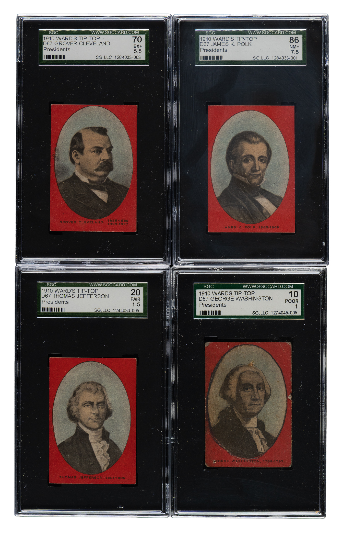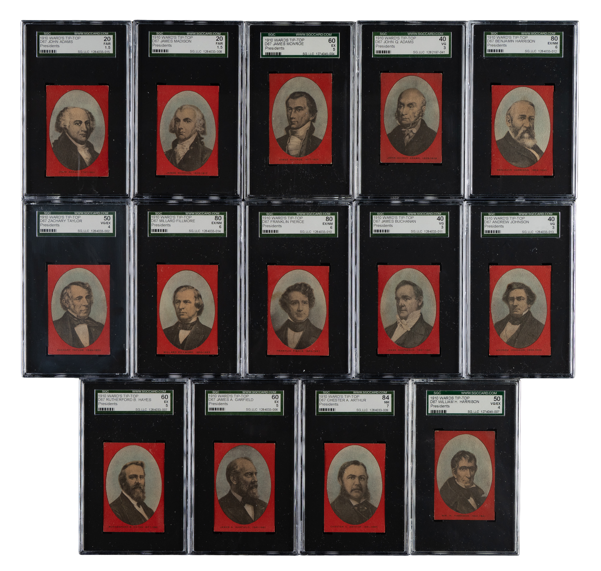 Presented is a partial set of 18 different cards (out of 26 in the set) from the 1910 D67 Ward's Tip Top Bread "Presidents" series. Each card is graded and encapsulated by SGC. Missing the following eight cards for completion: Jackson, Van Buren, Tyler, Lincoln, Grant, McKinley, T. Roosevelt, and Taft. Issued by the Ward Baking Company in their loaves of Tip Top Bread, this is a very rare issue, with each card having just a handful of copies graded between SGC and PSA. SGC Grading Composite: NM+ 86 (1 card): Polk. NM 84 (1 card): Arthur. EX/NM 80 (3 cards): W. Harrison, Fillmore, and Pierce. EX+ 70 (1 card): Cleveland. EX 60 (3 cards): Monroe, Hayes, and Garfield. VG/EX 50 (2 cards): Taylor and B. Harrison. VG 40 (3 cards): John Q. Adams, Buchanan, and Johnson. FAIR 20 (3 cards): John Adams, Jefferson, and Madison. POOR 10 (1 card): Washington.Total: 18 cards.