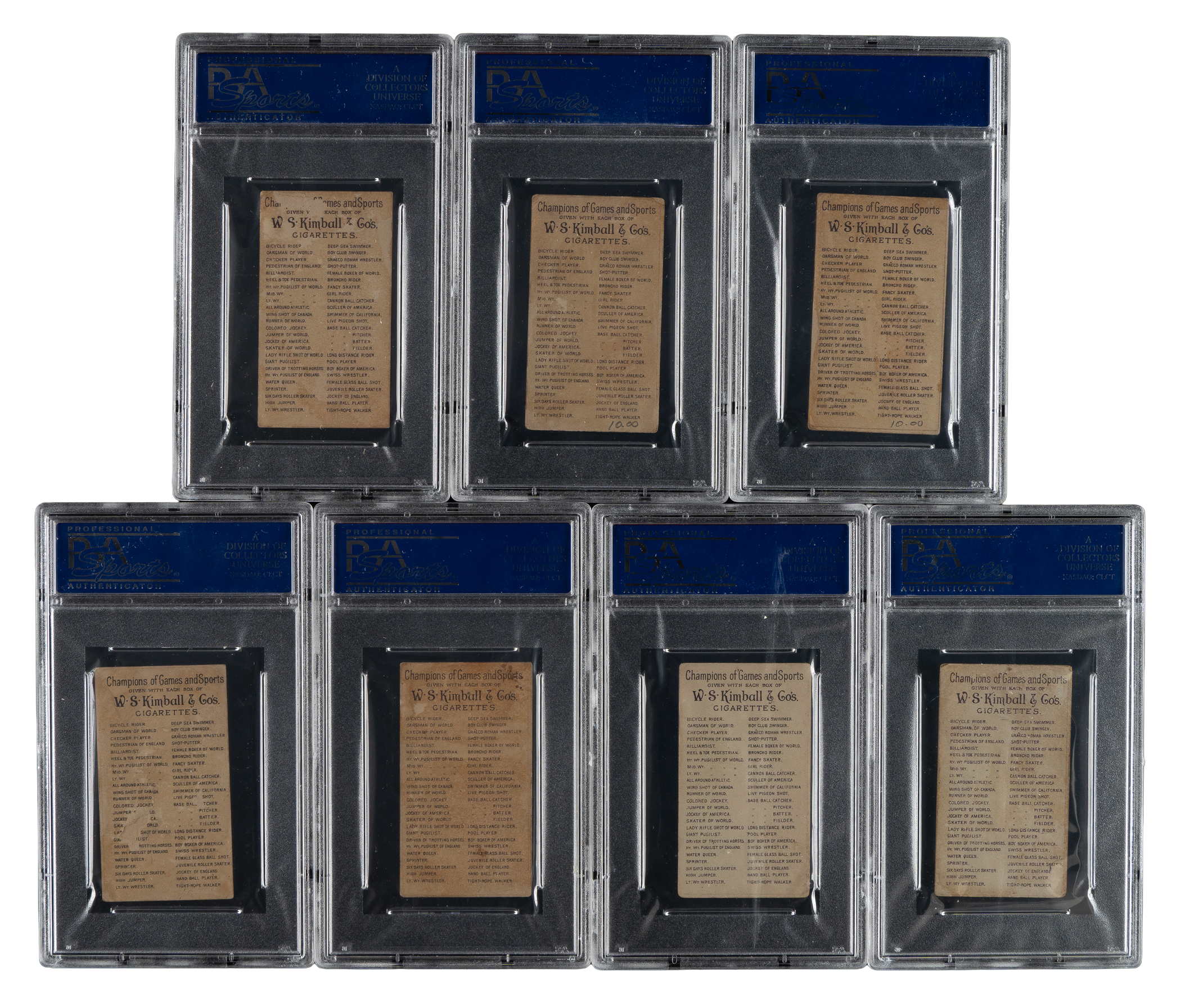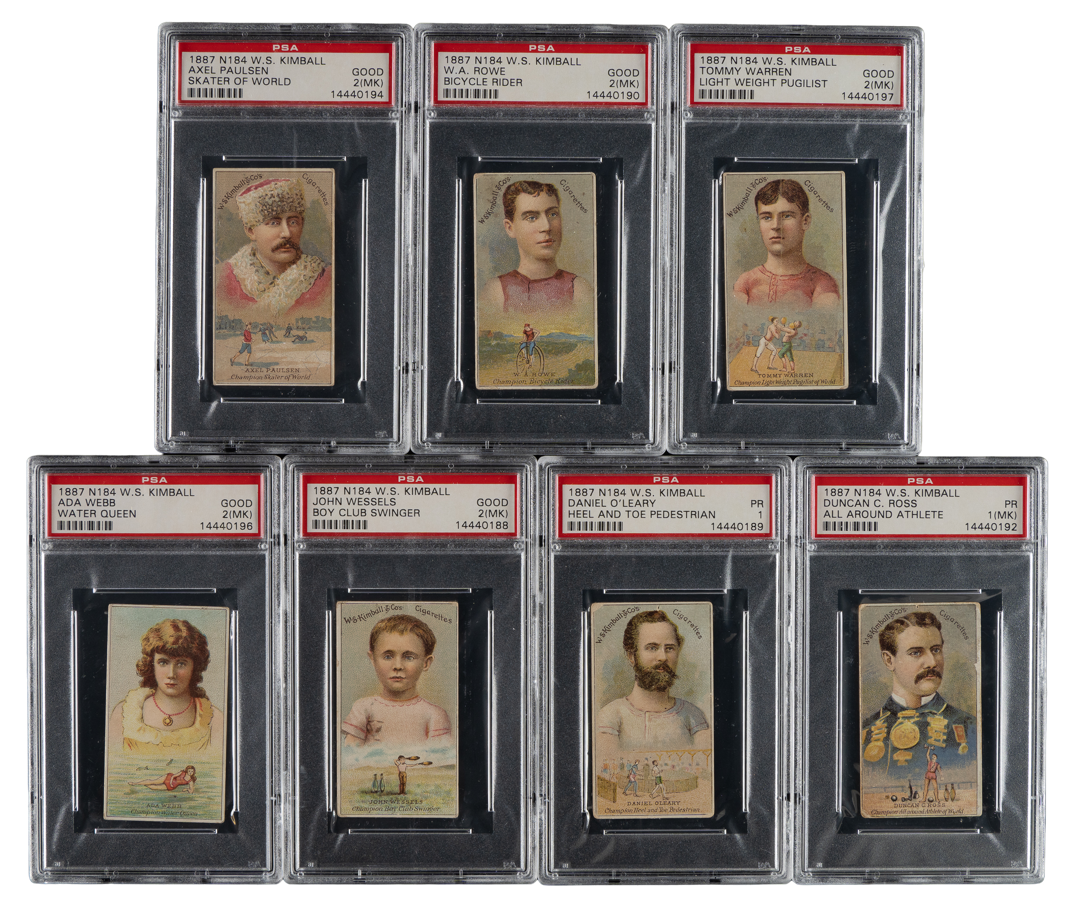 Collection of seven 1887 N184 W. S. Kimball Champions cards, each graded and encapsulated by PSA. PSA Grading Composite: GOOD 2 (5 cards): Paulsen (MK), Rowe (MK), Warren (MK), Webb (MK), and Wessels (MK). POOR 1 (2 cards): O'Leary and Ross (MK). Total: 7 cards.