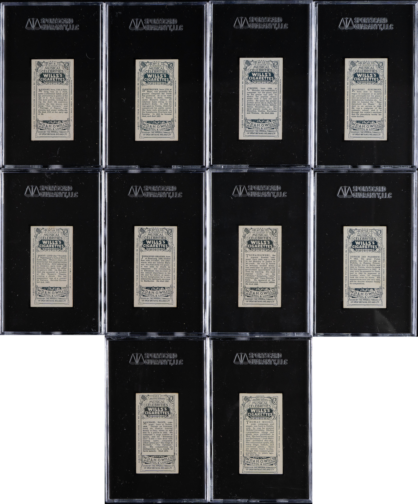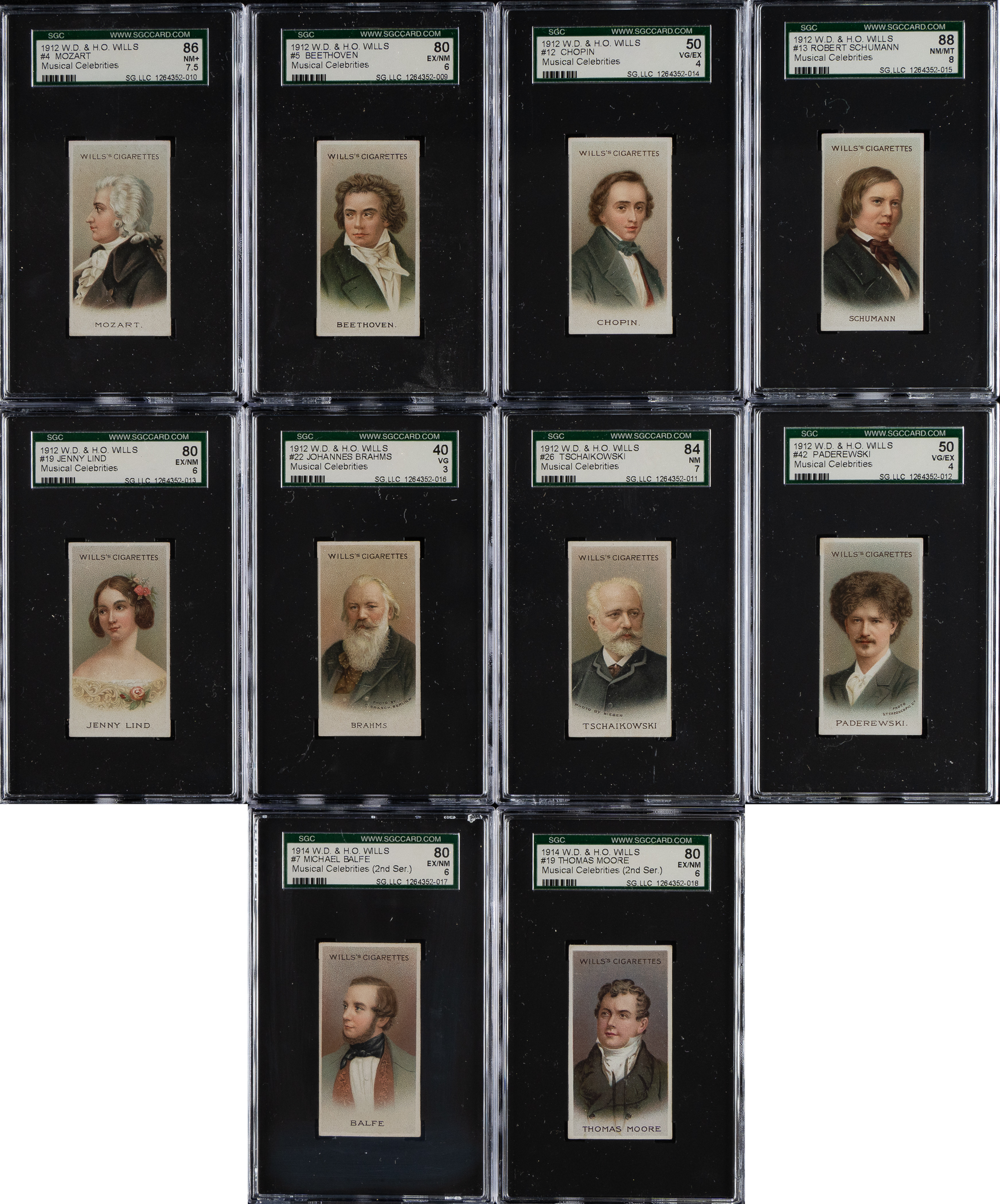 Collection of ten 1912 and 1914 W. D. & H. O. Wills "Musical Celebrities" First and Second Series cards, each graded and encapsulated by SGC. This collection consists of the following: 1) 1912 W. D. & H. O. Wills "Musical Celebrities" (8 cards): #4 (NM+ 86), 5 (EX/NM 80), 12 (VG/EX 50), 13 (NM/MT 88), 19 (EX/NM 80), 22 (VG 40), 26 (NM 84), and 42 (VG/EX 50). 2) 1914 W. D. & H. O. Wills "Musical Celebrities" Second Series (2 cards): #7 (EX/NM 80) and 19 (EX/NM 80). Total: 10 cards. The size/weight of this item requires that there will be an additional shipping charge for this lot.
