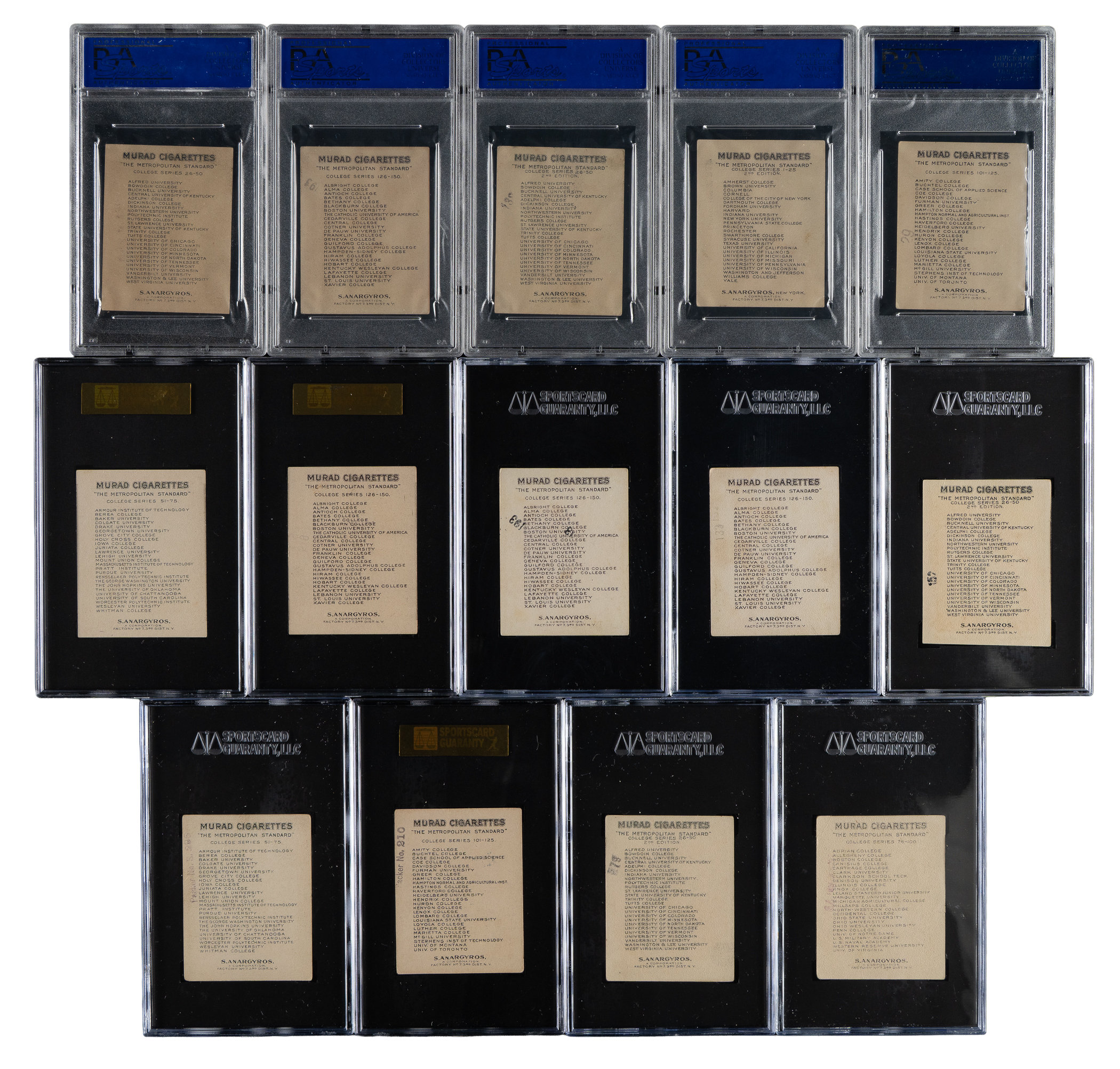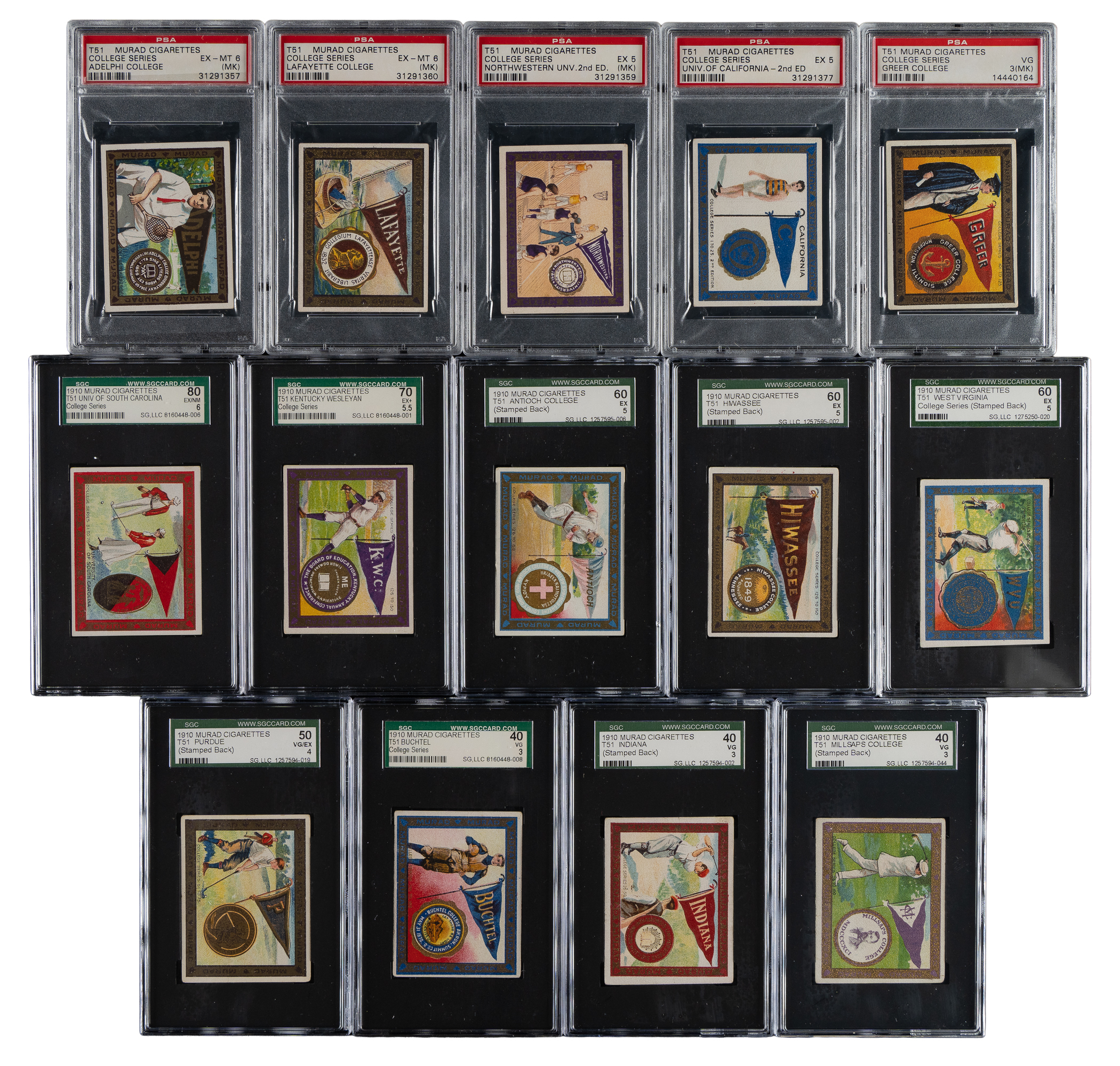 Collection of fourteen 1909-1910 T51 Murad "College Series" cards, each graded and encapsulated by PSA or SGC. SGC Grading Composite: EX/NM 80 (3 cards): Adelphia College (PSA MK), Layfette College (PSA MK), and University of South Caroline. EX+ 70 (1 card): Kentucky Wesleyan. EX 60 (5 cards): Antioch College/stamped back, Hiwassee/stamped back, Northwestern University/second edition (PSA MK), University of Carolina/second edition (PSA), and West Virginia/stamped back. VG/EX 50 (1 card): Purdue/stamped back. VG 40 (4 cards): Butchel, Greer College (PSA MK), Indiana/stamped back, and Millsaps/stamped back. Total: 14 cards. The size/weight of this item requires that there will be an additional shipping charge for this lot.
