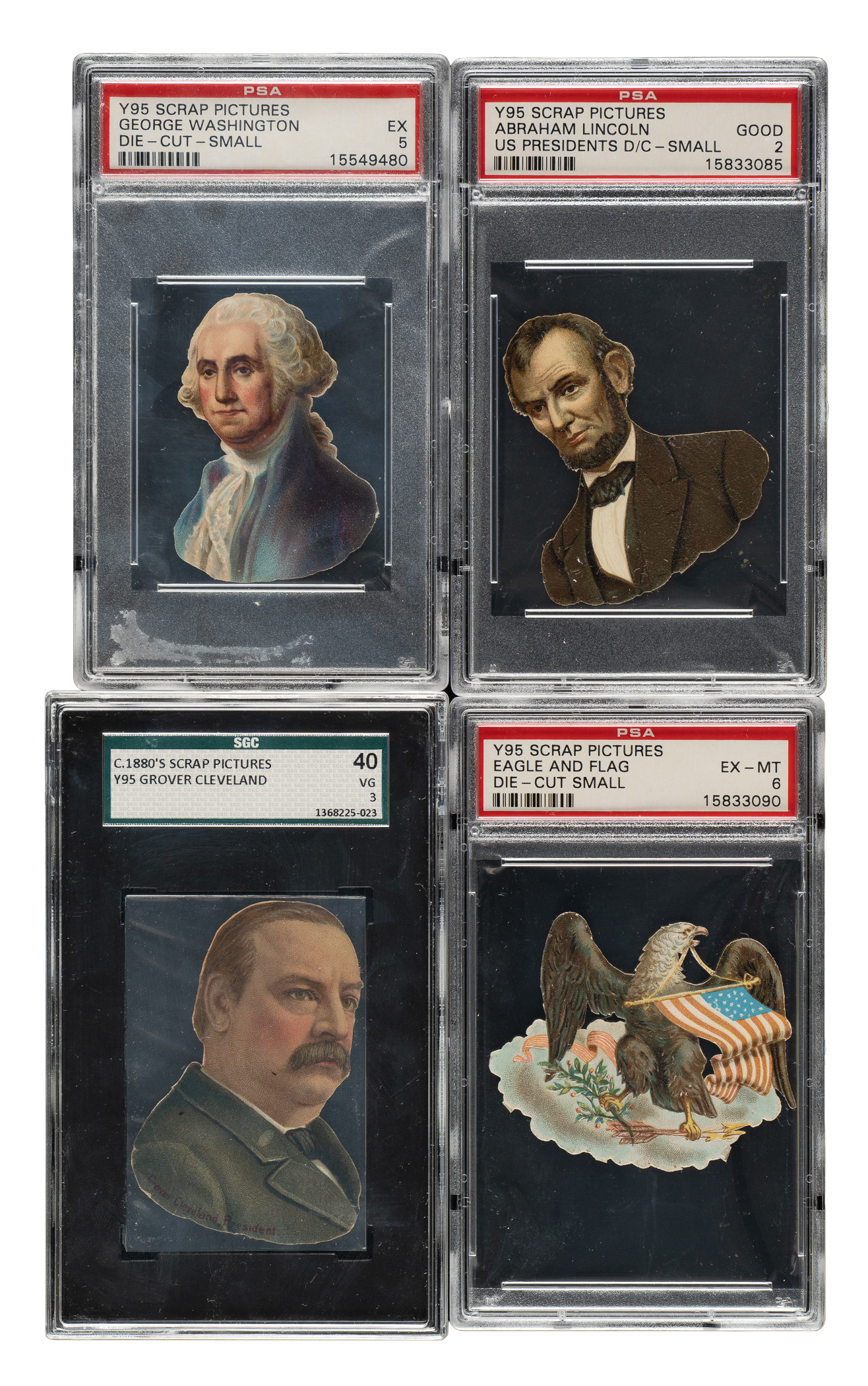 Extremely impressive collection of 50 die-cut lithographic cards (three different size variations) from the 1880s featuring, respectively, illustrated portrait images of the first 22 United States Presidents, plus Civil War generals and other historical figures. Designated Y95 Scrap Pictures "U.S. Presidents," these cards have long appealed to both Presidential and nonsports card collectors. The 22 Presidents featured in this grouping are George Washington, John Adams, Thomas Jefferson, James Madison, James Monroe, John Quincy Adams, Andrew Jackson, Martin Van Buren, William H. Harrison, John Tyler, James K. Polk, Zachary Taylor, Millard Fillmore, Franklin Pierce, James Buchanan, Abraham Lincoln, Andrew Johnson, Ulysses S. Grant, Rutherford Hayes, James Garfield, Chester Arthur, and Grover Cleveland. Each card is professionally graded and encapsulated by PSA (45) and SGC (5). PSA Grading Composite: MINT 9 (1 card): Grant (small, MK). NM-MT 8 (7 cards): John Q. Adams (small), Buchanan (small), Fillmore (small, MK), Madison (small), Monroe (small, MK), Taylor (small, MK), and Tyler (small, MK). NM 7 (4 cards): Arthur, Jackson (small), Polk (small, MK), and Van Buren (small). EX-MT 6 (6 cards): Eagle and Flag, Hayes (small, MK), Johnson (small), Pierce (small), Whitney (SGC 80), and Wreath/Flag. EX 5 (4 cards): Fairchild (SGC 60), Garfield, Harrison (small, MK), and Washington (facing right). VG-EX 4 (1 card): Jefferson (small). VG 3 (1 card): Cleveland (SGC 40). GOOD+ 2.5 (11 cards): John Q. Adams (micro), Bayard (SGC 35), Hancock/With Fond Greetings, Harrison (micro), Jackson (micro), Lincoln (small), Madison (micro), Monroe (micro), Pierce (micro), Polk (micro), and Van Buren (micro). GOOD 2 (13 cards): John Adams, Blaine (small), Butler (small), Endicott (SGC 30), Garfield/Yours Forever, Grant, Grant/Remember Me, Lincoln, Lincoln/Forget Me Not, Randall (small), Sherman (small), Van Buren (small), and Washington (facing left). FAIR 1.5 (1 card): Logan/With Fond Greetings. POOR 1 (1 card): Flag Shield/Cowboy. Total: 50 cards. The size/weight of this item requires that there will be an additional shipping charge for this lot.