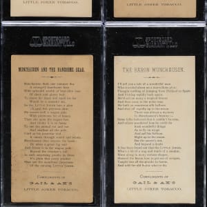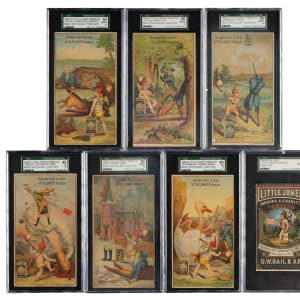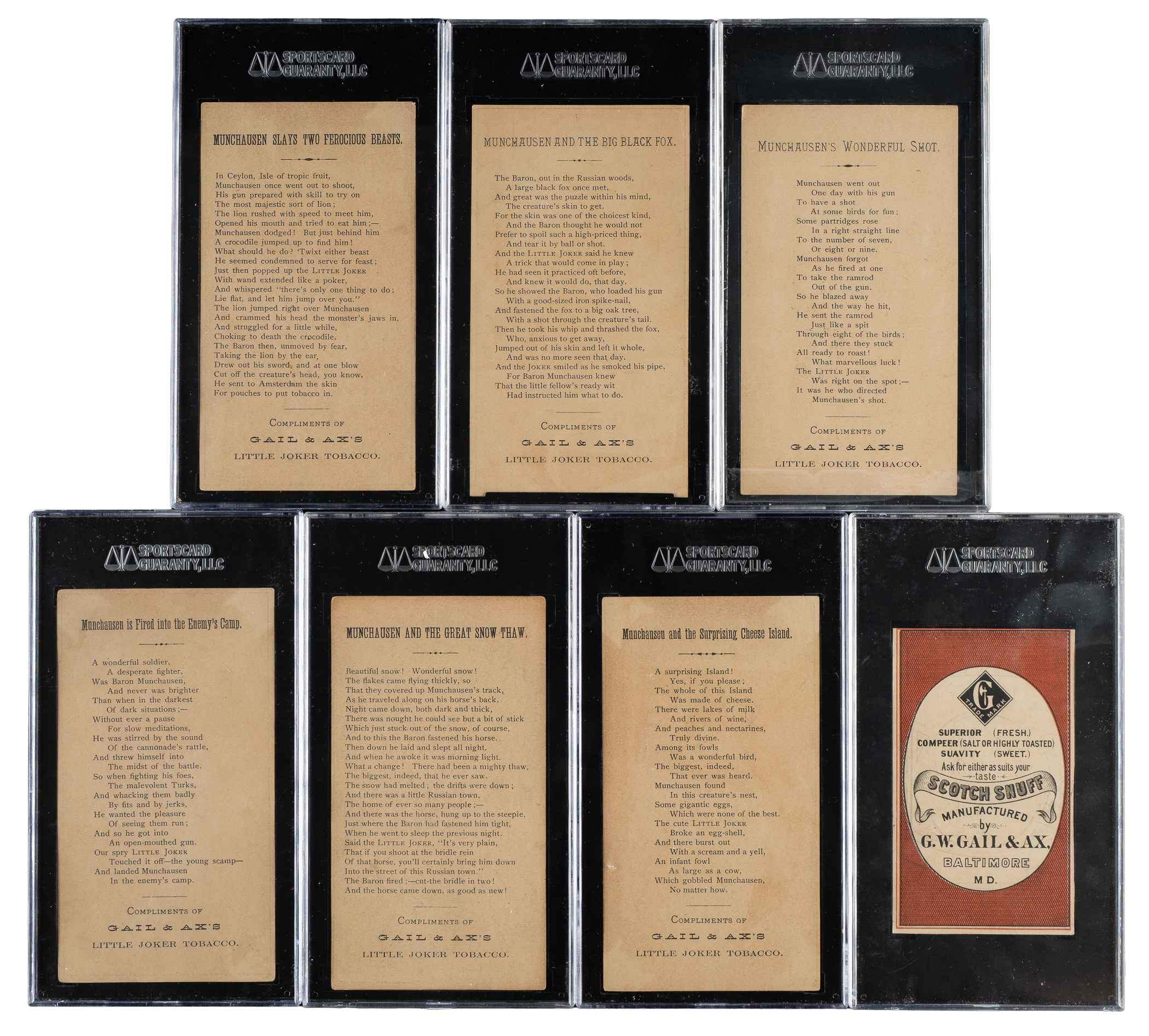 Presented is a complete 10-card set of the circa 1890 Gail & Ax Little Joker series, plus advertising trade card, each professionally graded and encapsulated by SGC. This exceptionally colorful large-card (3-1/8 x 5-3/4 inches) set was issued to promote the Little Joker tobacco brand. Each card features an extremely colorful and detailed lithographic scene relating to a fictional character named Baron Muchausen and the Gail & Ax Little Joker mascot character, with a package of Little Joker Smoking Tobacco superimposed in the foreground of the illustration. The back of each card features a poem related to the scene pictured on the front. This set consists of the following: Astonishing (EX 60), Fired into Enemy's Camp (VG 40), Great Snow Thaw (VG/EX 50), Handsome Bear (FAIR 20), Jumps into Mount Etna (EX/NM 80), Slays 2 Ferocious Beasts (VG/EX 50), Surprising Cheese Island (VG 40), The Baron Munchausen (Authentic), The Big Black Fox (VG/EX 50), Wonderful Shot (VG/EX 50), and Trade Card (Authentic). Total: 11 cards.