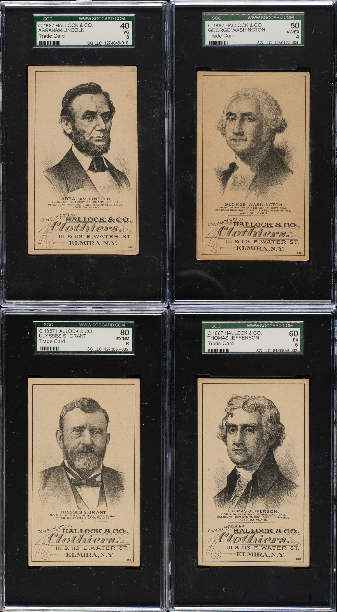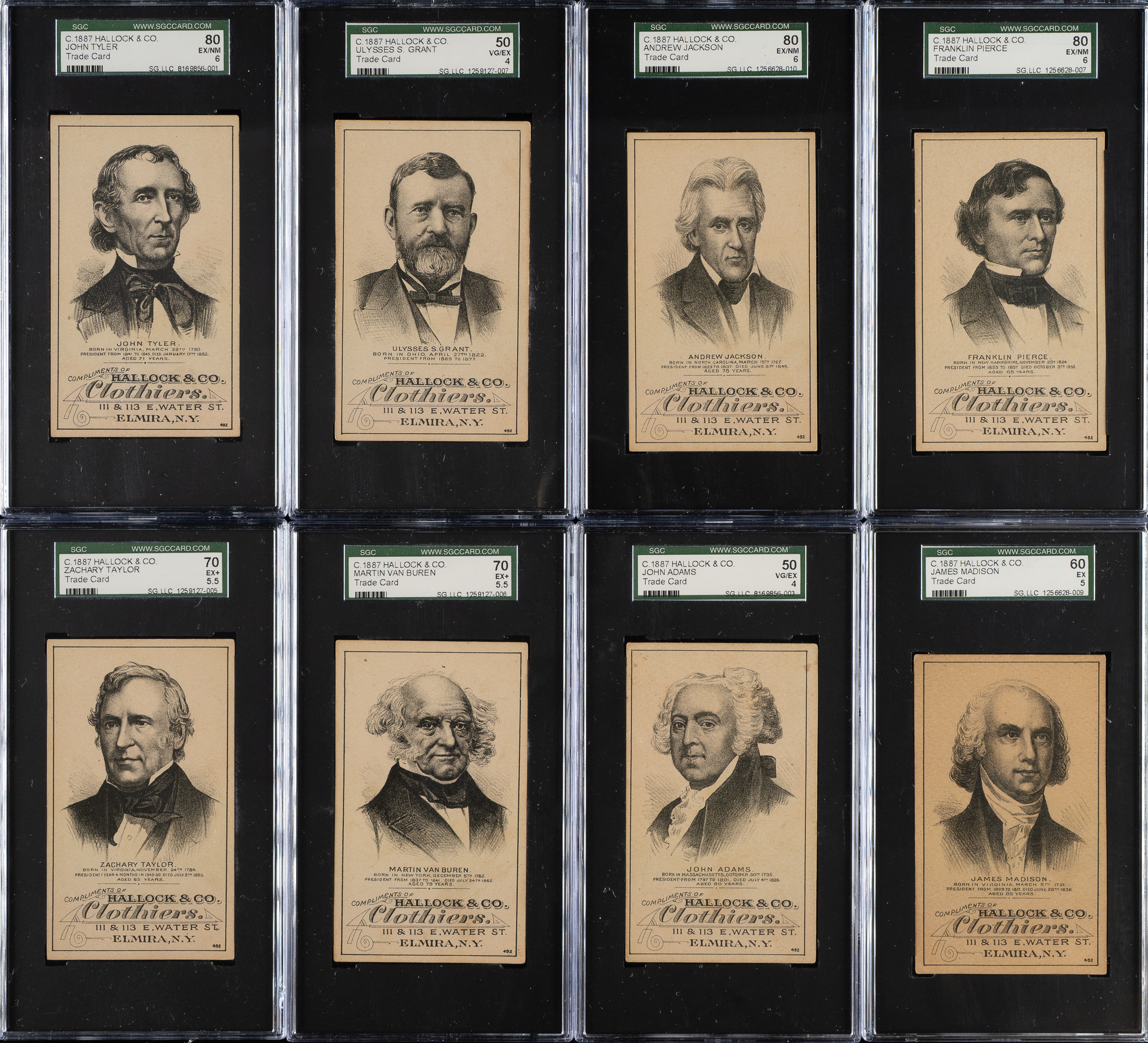 Offered is a collection of twelve circa 1887 HD2A Hallock & Co. "Presidents" trading cards, each professionally graded and encapsulated by SGC, highlighted by George Washington, Thomas Jefferson, and Abraham Lincoln. This collection consists of the following: EX/NM 80 (4 cards): Grant, Jackson, Pierce, and Tyler. EX+ 70 (2 cards): Taylor and Van Buren. EX 60 (2 cards): Jefferson and Madison. VG/EX 50 (3 cards): John Adams, Grant, and Washington. VG 40 (1 card): Lincoln. Total: 12 cards.