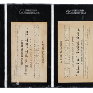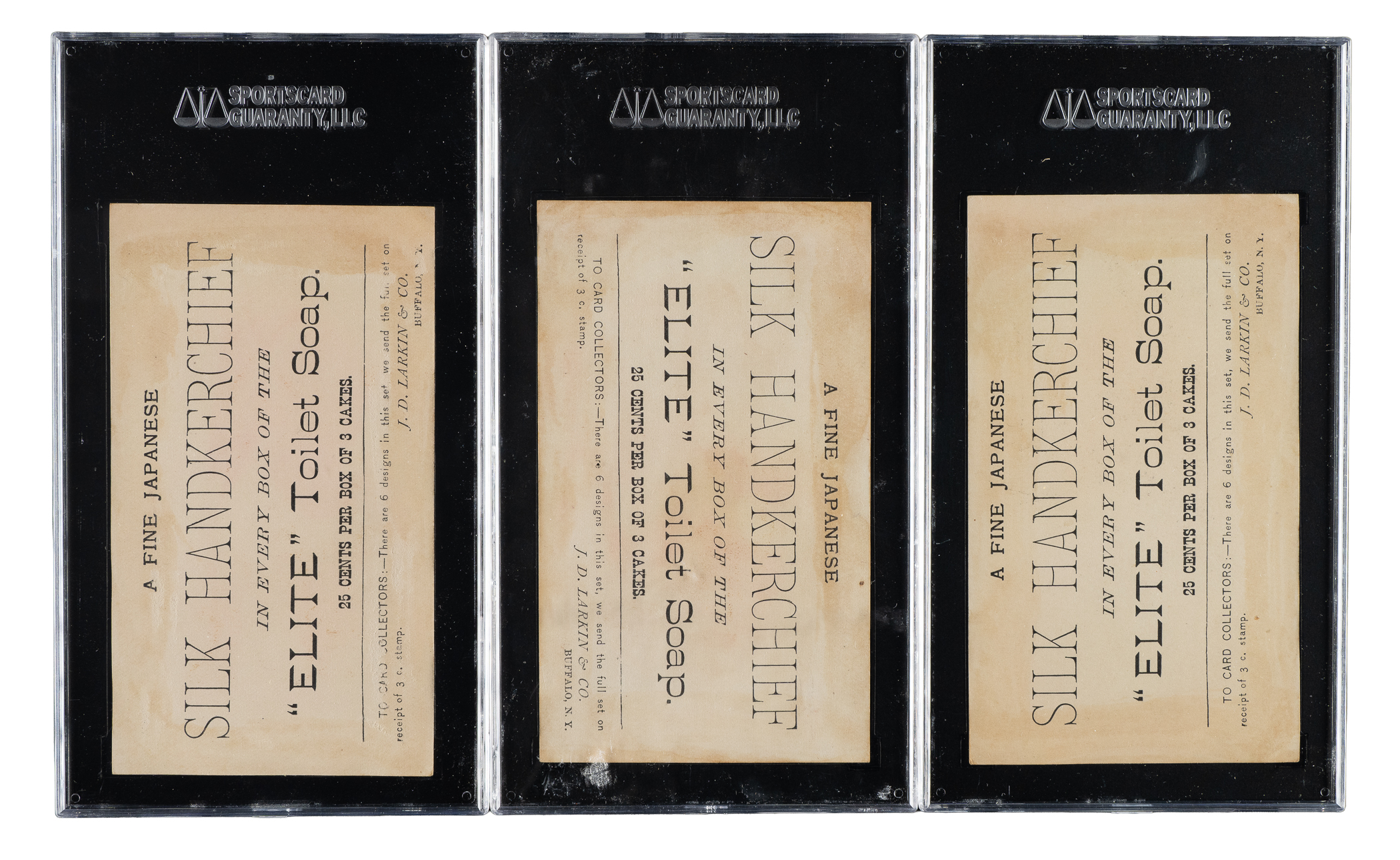 Presented is a trio of 1881 J. D. Larkin & Co. Anthropomorphic trade cards, each professionally graded and encapsulated by SGC. This trio consists of the following: Monkey Fishing (GOOD 30), Monkey Hunting (FAIR 20), and Monkey Painting (GOOD 30). Total: 3 cards.