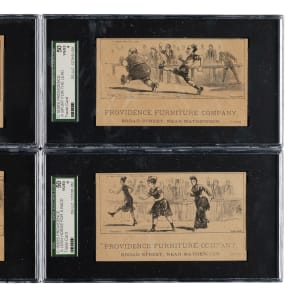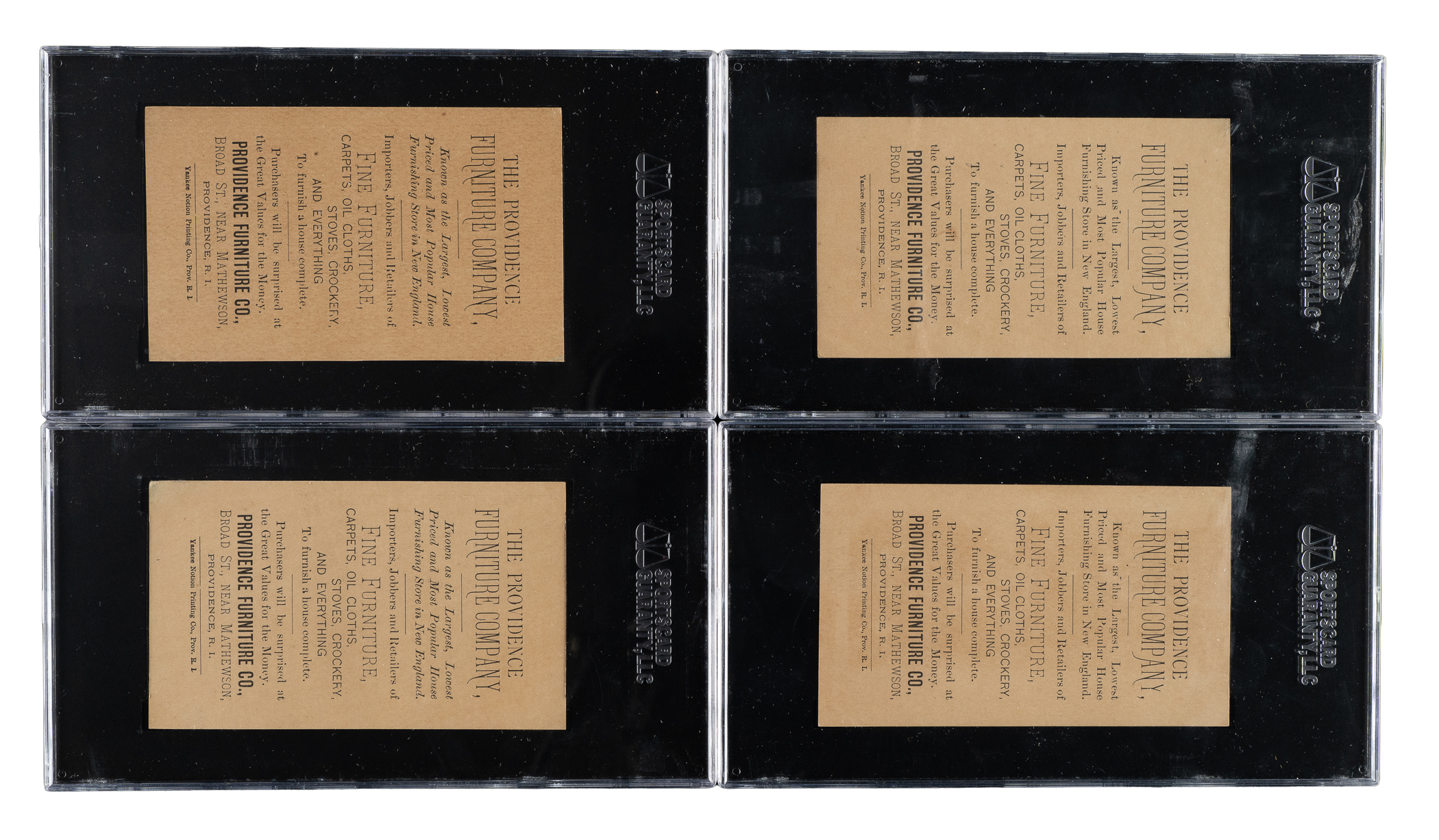 Presented is a collection of four circa 1880s Providence Furniture Company trade cards, each professionally graded and encapsulated by SGC. This collection consists of the following: A Lean Horse for a Race (VG/EX 50), A Spurt for the Lead (VG/EX 50), Depressing Effect Of (VG 40), and Three Laps (VG/EX 50). Total: 4 cards.