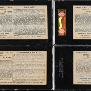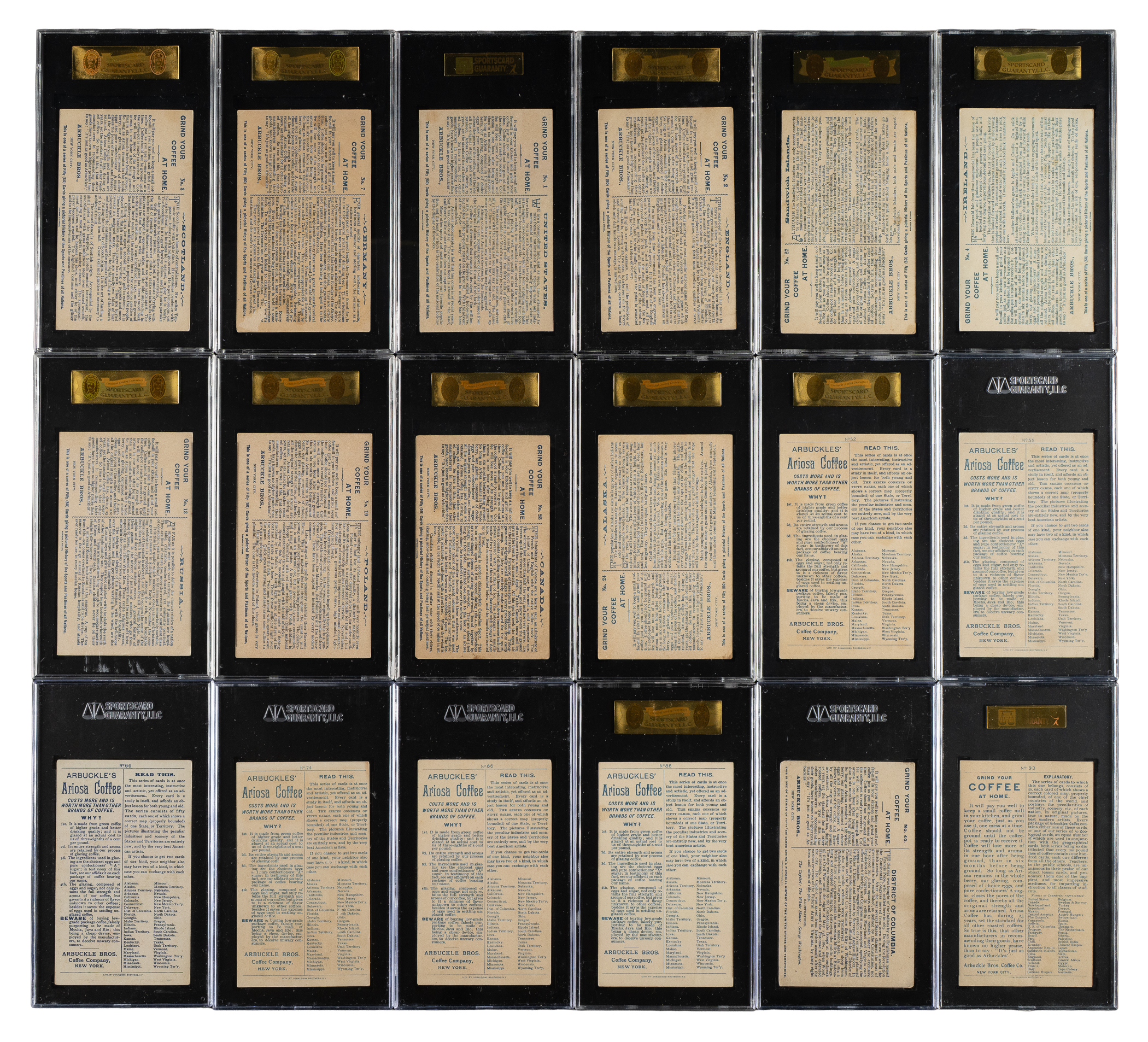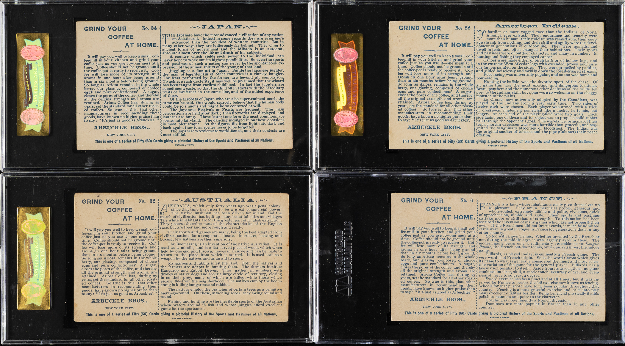 Offered is a collection of twenty-two different trade cards, representing four different sets, issued by Arbuckle Coffee in circa 1890. Each card is professionally graded and encapsulated by SGC. This collection consists of the following: 1) K4 History of Sports & Pastimes Of All Nations (14 cards): #1 U.S. (EX+ 70), 2 England (VG 40), 3 Scotland (EX 60), 6 France (VG/EX 50), 7 Germany (VG 40), 13 Russia (VG/EX 50), 19 Poland (EX 60), 22 American Indians (VG/EX 50), 23 Canada (VG/EX 50), 24 Alaska (VG/EX 50), 27 Hawaii (EX 60), 32 Australia (VG 40), 34 Japan (EX 60), and 84 Ireland (VG/EX 50). 2) K5 History of the U.S. and Territories (1 card): #40 District of Columbia (VG 40). 3) K6 Illustrated Atlas of the U.S. (6 cards): #52 Maine (EX 60), 55 Oregon (EX 60), 66 Texas (VG 40), 74 California (VG 40), and two 86 Utah (VG 40 [mislabeled as Arizona] and GOOD 30). 4) K8 Views From Around the World (1 card): #93 Sandwich Islands (VG 40). Total: 22 cards. The size/weight of this item requires that there will be an additional shipping charge for this lot.