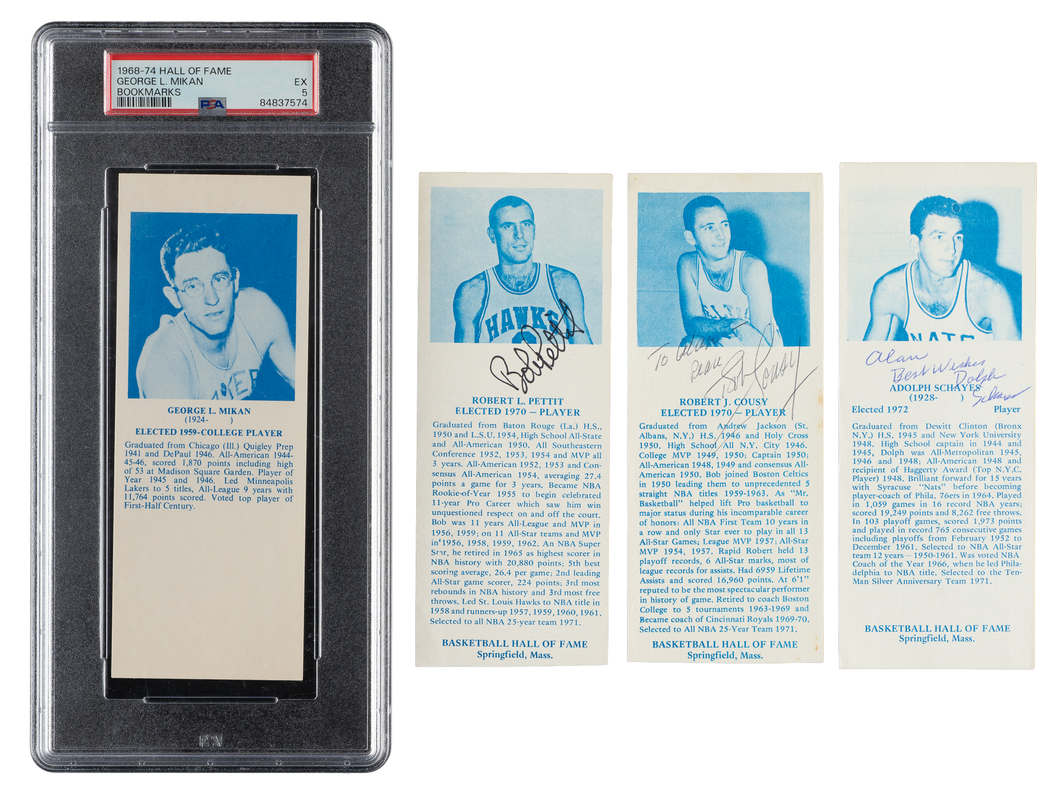 Presented is a near-complete set of forty-nine different (out of fifty-three) 1968-1974 Basketball Hall of Fame Bookmarks, highlighted by thirteen signed examples and a PSA EX 5 George Mikan. First issued in 1968 as a set of forty-six rectangular (2-7/8 x 6-3/8 inches) blue-and-white bookmarks, seven subsequent inductees to the Hall of Fame were added from 1969 to 1974. These rare short-printed additions are printed on a slightly thinner paper stock and have hand-cut top or bottom edges, indicating that they may have been produced on two-card panels. This near-complete set includes three of the seven short-prints, missing Carnevale, Davies, B. Russell, and Saperstein for completion. Included is a duplicate of Hickox. The condition of the thirty-seven unsigned bookmarks ranges from Ex to Nr/Mt-Mt (averaging Ex-Mt+), with a few slightly lesser. Unsigned Key: Mikan (EX 5). Signed Cards (13): Cousy SP (personalized, Gd+), Dehnert (personalized, Ex), Foster (Vg-Ex), Hinkle (Vg-Ex), Hobson (personalized, trimmed top edge, otherwise Vg-Ex+), Kurland (Pr, with missing corner), Macauley (trimmed bottom edge, otherwise Gd), Pettit SP (Gd+), Phillip (Ex), Schayes SP (personalized, Vg+), Thompson (Pr-Fr due to tape and small spot of paper loss on reverse), Tobey (personalized, Ex), and Wooden (personalized, trimmed bottom edge, otherwise Vg-Ex). An outstanding opportunity to acquire a mid- to high-grade near-complete set of this unusual Hall of Fame basketball issue. Total: 50 bookmarks (near set of 49 plus one duplicate). Auction LOA from James Spence/JSA.