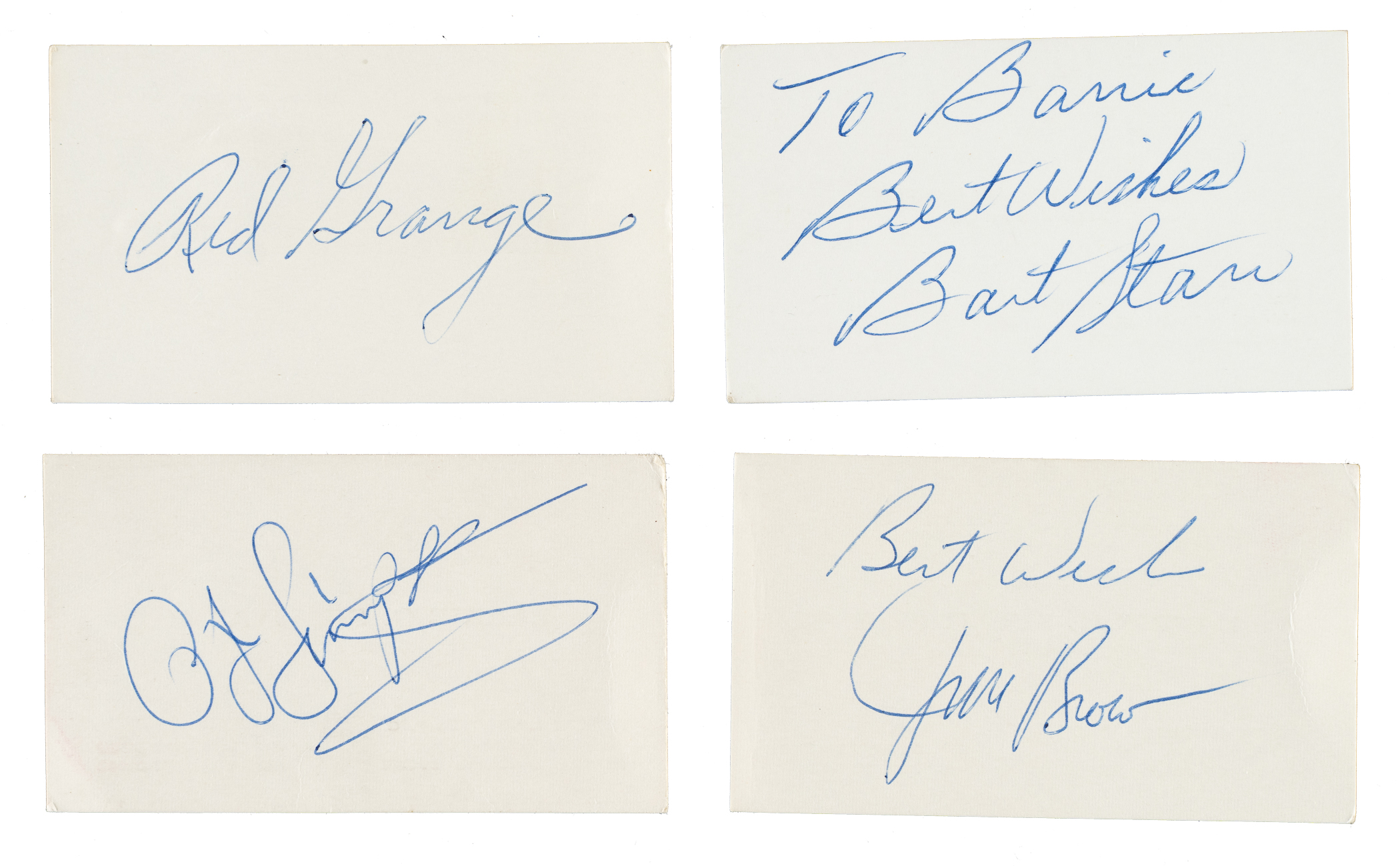 Presented is a collection of twenty-four business cards, all but two signed by members of the Pro Football Hall of Fame. The signatures are scripted on the reverse in various inks. This collection is highlighted by numerous top-tier Hall of Famers, including Jim Brown, Red Grange, Gale Sayers, and Bart Starr. The late, great collector Barrie Sullivan attended countless Super Bowls and referenced them with notations on the front side of each business card (signatures on blank reverse), in some cases specifying not just the Super Bowl but also "Fri Nite NFL Party," "Media Lounge," "Felix" Rest[aurant]," etc. The condition of the cards ranges mostly from Vg to Ex (with a couple lesser). This collection consists of the following: Sullivan Law Firm (Denver) Business Cards: Jim Brown, Nick Buoniconti, Dick Butkus, Frank Gifford (personalized), Red Grange (tape stain on front), Bob Hayes, Paul Hornung, Sam Huff (personalized), Tom Jackson, Vance Johnson, Jack Kemp (crease at bottom), Craig Morton (personalized), Anthony Munoz ("HOF 98"), Ray Nitschke (personalized), Gale Sayers (personalized), Don Shula, Phil Simms, O.J. Simpson, Bart Starr (personalized), Lynn Swann (personalized), Jim Taylor (crease at bottom), and Garo Yepremian ("17-0"). Expos Scout Business Card: Al Davis. Colorado Supreme Court Attorney Registration Card: John Elway. Total: 24 signed business cards. Auction LOA from James Spence/JSA.
