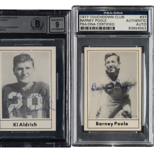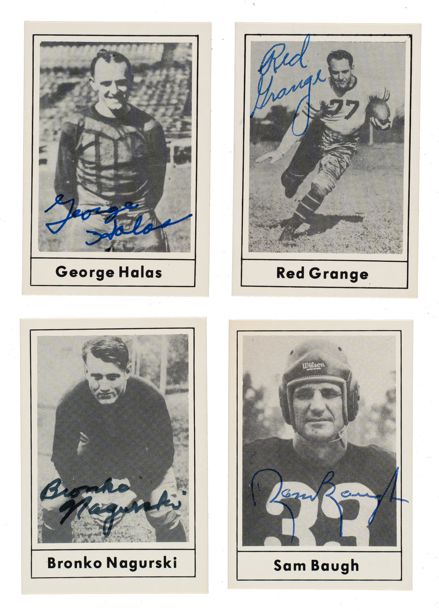 Near-complete set of 43 (out of 50) 1977 Touchdown Club photo cards, each signed on the front by the respective player. Missing seven cards (#10, 13, 23, 35, 39, 41, and 43) for completion of a signed set, with unsigned examples present for all except #35 Leemans. The signatures are boldly scripted in black or blue ink. The cards range in condition from Vg to Nr/Mt (averaging Ex+). Two cards have been professionally authenticated and encapsulated by PSA/DNA and Beckett Authentic. This is an outstanding near-complete set with 43 signatures, nearly all of the players long since deceased. The collection consists of the following: #1 Red Grange (Ex-Mt), 2 George Halas (Vg-Ex+), 3 Benny Friedman, 4 Cliff Battles, 5 Mike Michalske, 6 George McAfee, 7 Beattie Feathers, 8 Ernie Caddel, 9 George Musso, 10 Sid Luckman (unsigned), 11 Cecil Isbell, 12 Bronko Nagurski (Ex), 13 H. Anderson (unsigned), 14 Dick Farman, 15 Aldo Forte, 16 Ki Aldrich (Beckett Authentic, Auto. MINT 9), 17 Jim Lee Howell, 18 Ray Flaherty, 19 Hampton Pool, 20 Alex Wojciechowicz, 21 Bill Osmanski, 22 Hank Soar, 23 D. Clark (unsigned), 24 Joe Muha, 25 Don Hutson, 26 Jim Poole, 27 Charley Malone (personalized), 28 Charley Trippi, 29 Andy Farkas (personalized), 30 Clarke Hinkle, 31 Gary Famiglietti, 32 Bulldog Turner, 33 Sammy Baugh (Ex-Mt), 34 Pat Harder, 35 Tuffy Leemans , 36 Ken Strong, 37 Barney Poole (PSA/DNA Authentic), 38 Bruiser Kinard, 39 Buford Ray (unsigned), 40 Ace Parker, 41 Buddy Parker (unsigned), 42 Mel Hein, 43 Ed Danowski (unsigned), 44 Bill Dudley, 45 Paul Stenn, 46 George Connor, 47 George Sauer, 48 Armand Niccolai, 49 Tony Canadeo, and 50 Bill Willis (personalized). An outstanding collection of signed cards that would provide a strong foundation for the assembly of a complete set. Total: 49 cards (near set of 43 signed cards plus six unsigned cards). Auction LOA from James Spence/JSA.