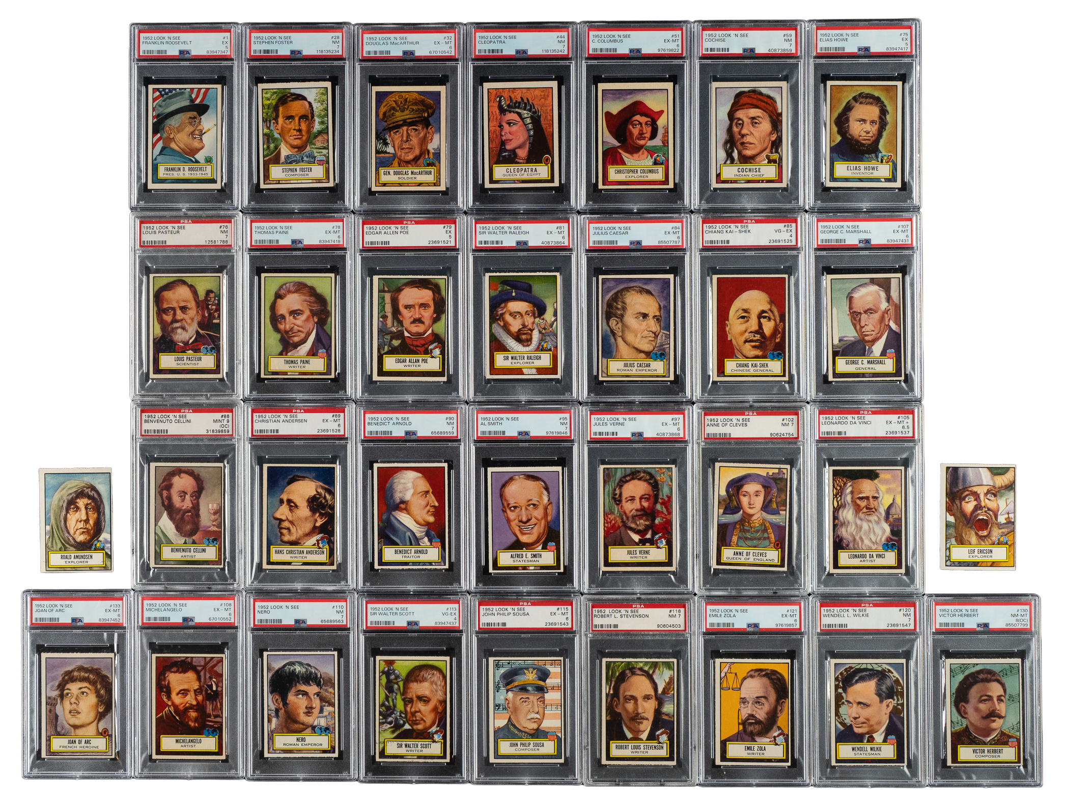 Collection of thirty-six cards from the 1952 Topps "Look 'n See" set, including thirty-four that have been professionally graded and encapsulated by PSA. "Look 'n See" is one of the great classics of early 1950s non-sport card issues and one of the earliest of all Topps sets. This was an extremely ambitious concept for a set, with strong historical and educational content. The card fronts feature full-color portraits of famous people from all eras and areas of history. The only sports figure in the set is Babe Ruth. PSA Grading Composite: MINT 9 (1 card): #86 (OC). NM-MT 8 (1 card): #130 (OC). NM 7 (13 cards): #16, 28, 29, 44 Cleopatra, 59, 76, 90, 95, 102, 110, 116, 120, 127 Galileo. EX-MT+ 6.5 (1 card): #105 DaVinci. EX-MT 6 (12 cards): #32, 51 Columbus, 78, 81, 84 Caesar, 89, 97, 107, 108 Michelangelo, 115, 121, and 133 Joan of Arc. EX 5 (3 cards): #1 Roosevelt, 75, and 79. VG-EX 4 (3 cards): #45 Earhart, 85 and 113. Also includes unencapsulated examples of #88 Amundsen (90/10 L/R and 80/20 T/B, otherwise Ex-Mt) and 126 Ericson (95/5 L/R, otherwise Ex-Mt). Total: 36 cards. The size/weight of this item requires that there will be an additional shipping charge for this lot.