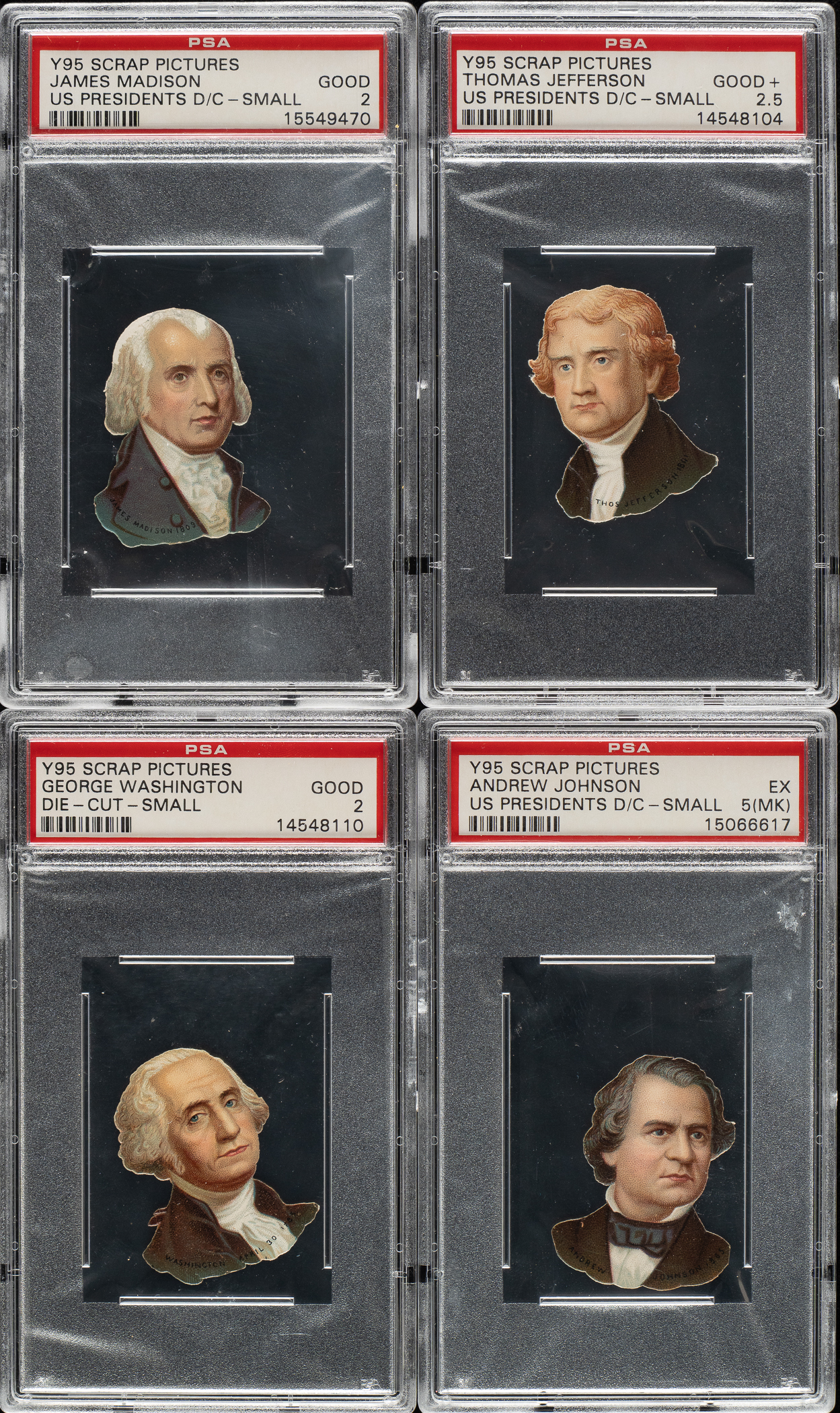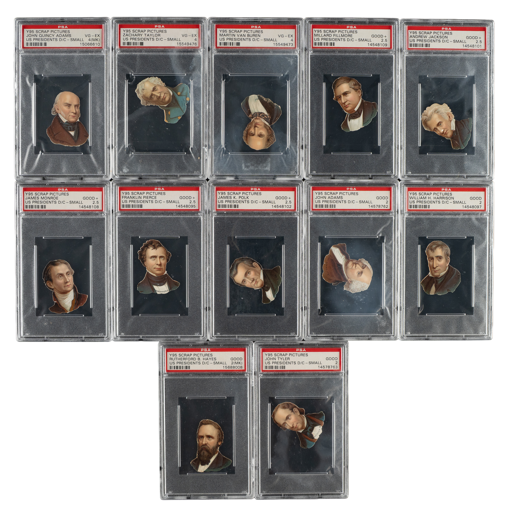 Collection of sixteen 1880s Y95 Scrap Pictures "U.S. Presidents" cards, each graded and encapsulated by PSA. PSA Grading Composite: EX 5 (1 card): Johnson (MK). VG-EX 4 (3 cards): Adams, Taylor, and Van Buren. GOOD+ 2.5 (6 cards): Fillmore, Jackson, Jefferson, Monroe, Pierce, and Polk. GOOD 2 (6 cards): Adams, Harrison, Hayes (MK), Madison, Tyler, and Washington. Total: 16 cards. The size/weight of this item requires that there will be an additional shipping charge for this lot.