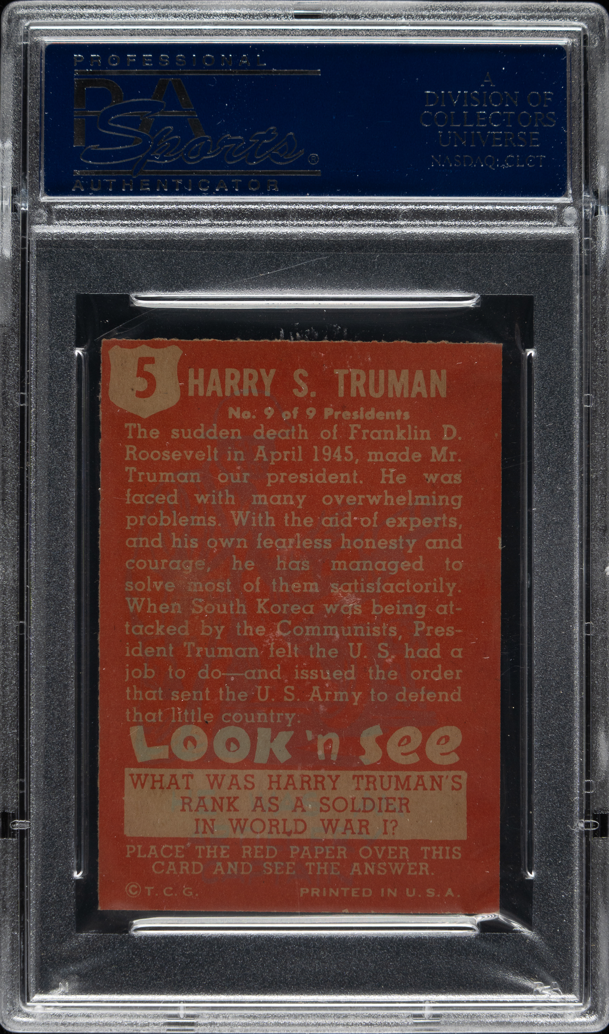Lot # 3413: 1952 Topps "Look 'n See" #5 Harry Truman PSA NM-MT 8