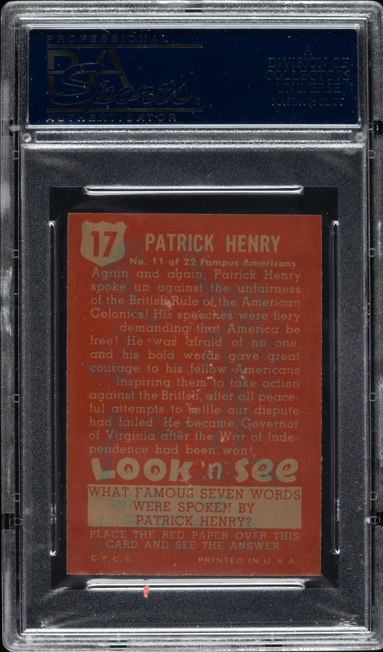 Lot # 3390: 1952 Topps "Look 'n See" #17 Patrick Henry PSA NM-MT 8