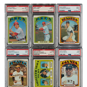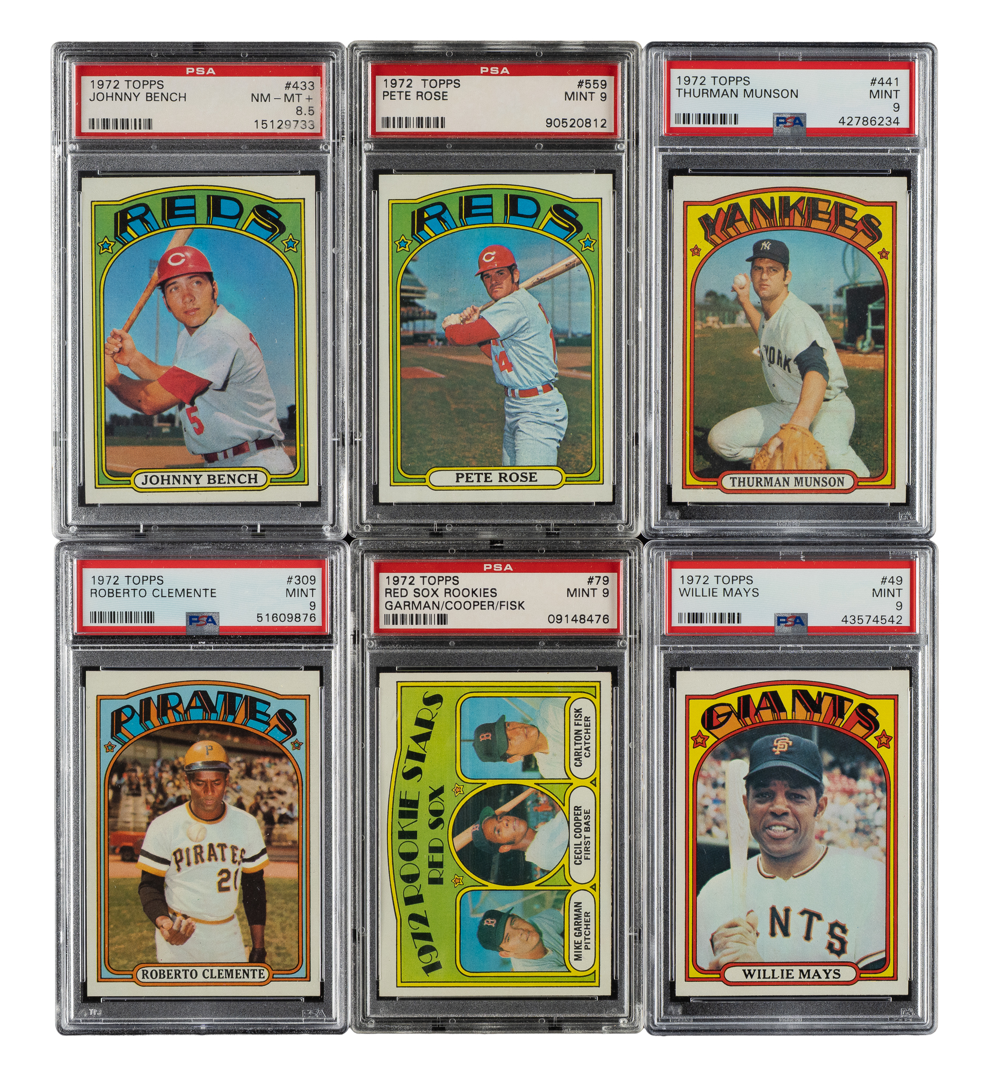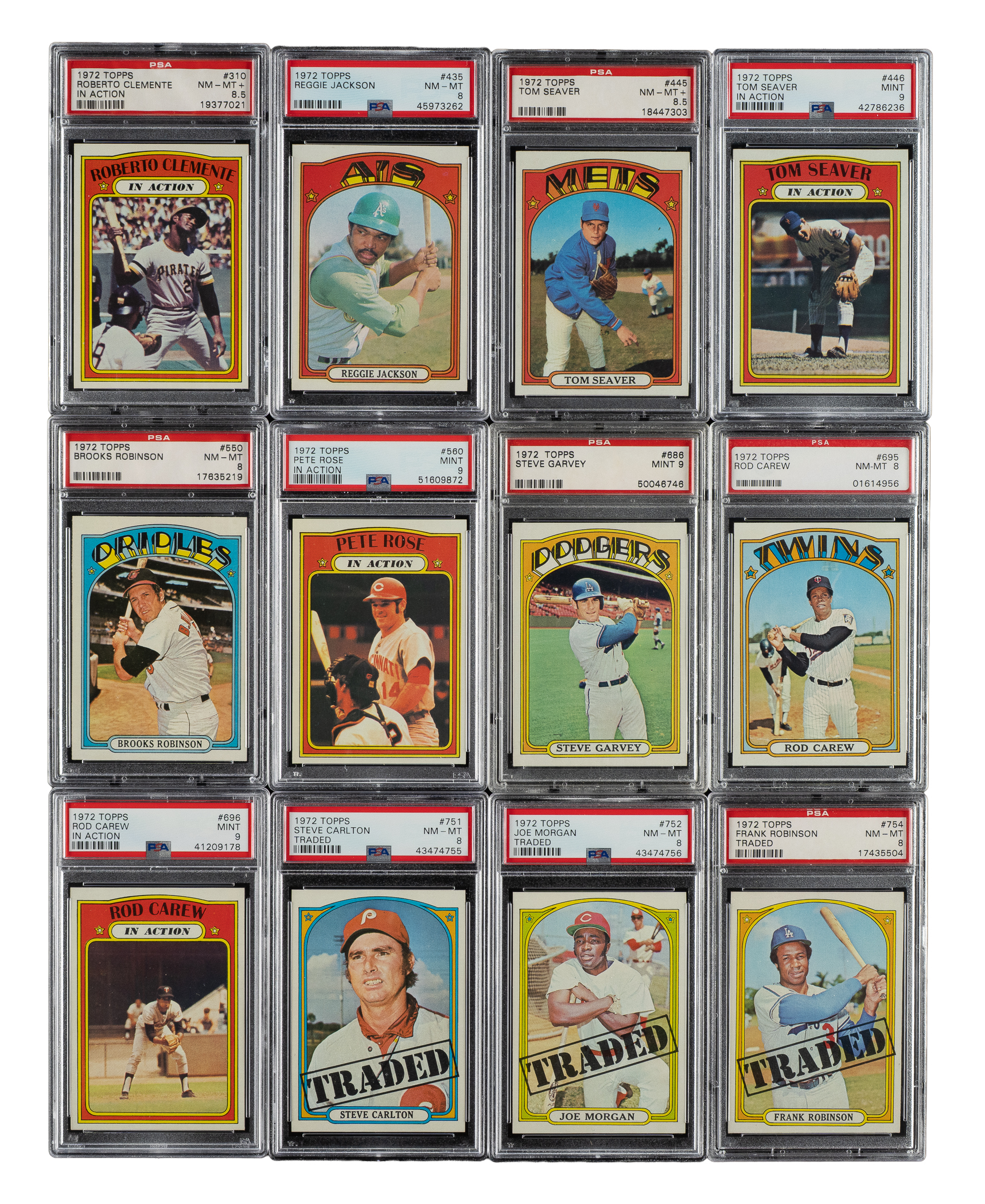 Extremely attractive, crisp, and clean near-complete set consisting of 784 cards from the 1972 Topps series. This is a beautiful near set with many high grade cards. Missing just three cards (#51 Killebrew, 299 Aaron, and 595 Ryan) for completion. Includes both variations of #29 and 117. Sixty-six cards have been professionally graded and encapsulated by PSA. PSA Grading Composite: MINT 9 (20 cards): #49 Mays, 79 Fisk RC, 80 Perez, 87, 88, 130 Gibson, 132 Morgan, 270 Palmer, 280 McCovey, 309 Clemente, 441 Munson, 446 Seaver IA, 559 Rose, 560 Rose IA, 686 Garvey, 696 Carew IA, 711 Bobby Bonds, 760 Mazeroski, 771 Giants Team, and 777 Wilhelm. NM-MT+ 8.5 (12 cards): #37 Yastrzemski, 89, 195 Cepeda, 200 Brock, 267, 330 Hunter, 310 Clemente IA, 433 Bench, 445 Seaver, 447 Stargell, 600 Kaline, and 787. NM-MT 8 (34 cards): #85, 86, 90, 91, 92, 93, 94, 95, 96, 100 F. Robinson, 147, 241 Fingers, 285 Perry, 400 Oliva, 410 Jenkins, 420 Carlton, 434 Bench IA, 435 Jackson, 436 Jackson IA, 439 B. Williams, 500 Torre, 515 Blyleven, 530 Sutton, 550 B. Robinson, 555 Santo, 567 Marichal, 620 Niekro, 695 Carew, 749 Alston, 751 Carlton Traded, 752 Morgan Traded, 754 F. Robinson Traded, 761, and 764 Baker. The condition of the 720-card unencapsulated balance is 85% Nr/Mt to Nr/Mt-Mt (including many Mint) and 15% Ex to Ex-Mt (including a few slightly lesser). Unencapsulated Keys: 50 Mays IA (Ex-Mt) and 300 Aaron IA (Nr/Mt-Mt). This is a beautifully preserved, high-grade near-complete set (minus three cards) of one of the great classic Topps sets of the era! The SMR value for just the 66 PSA-graded cards (factoring in the 12 half grades at the lower whole-grade level) is $12,597. Total: 786 cards (near set of 784 plus two variations). The size/weight of this item requires that there will be an additional shipping charge for this lot.