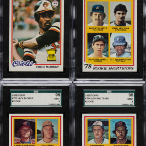 Presented is an outstanding high-grade complete set of 1978 Topps baseball highlighted by the rookie cards of Eddie Murray, Jack Morris, and Paul Molitor. Condition is 59% Nr/Mt to Nr/Mt-Mt (including some Mint), 30% Ex to Ex-Mt, and 11% Vg to Vg-Ex. Four cards have been professionally graded and encapsulated by SGC. Keys: #20 Rose (Ex+), 36 Murray RC (NM/MT+ 92), 400 Ryan (Ex-Mt), 703 Morris RC (MINT 96), 704 Whitaker (MINT 96), and 707 Molitor/Trammell RC (MINT 96). This is an extremely attractive high-grade complete set. Total: 726 cards.