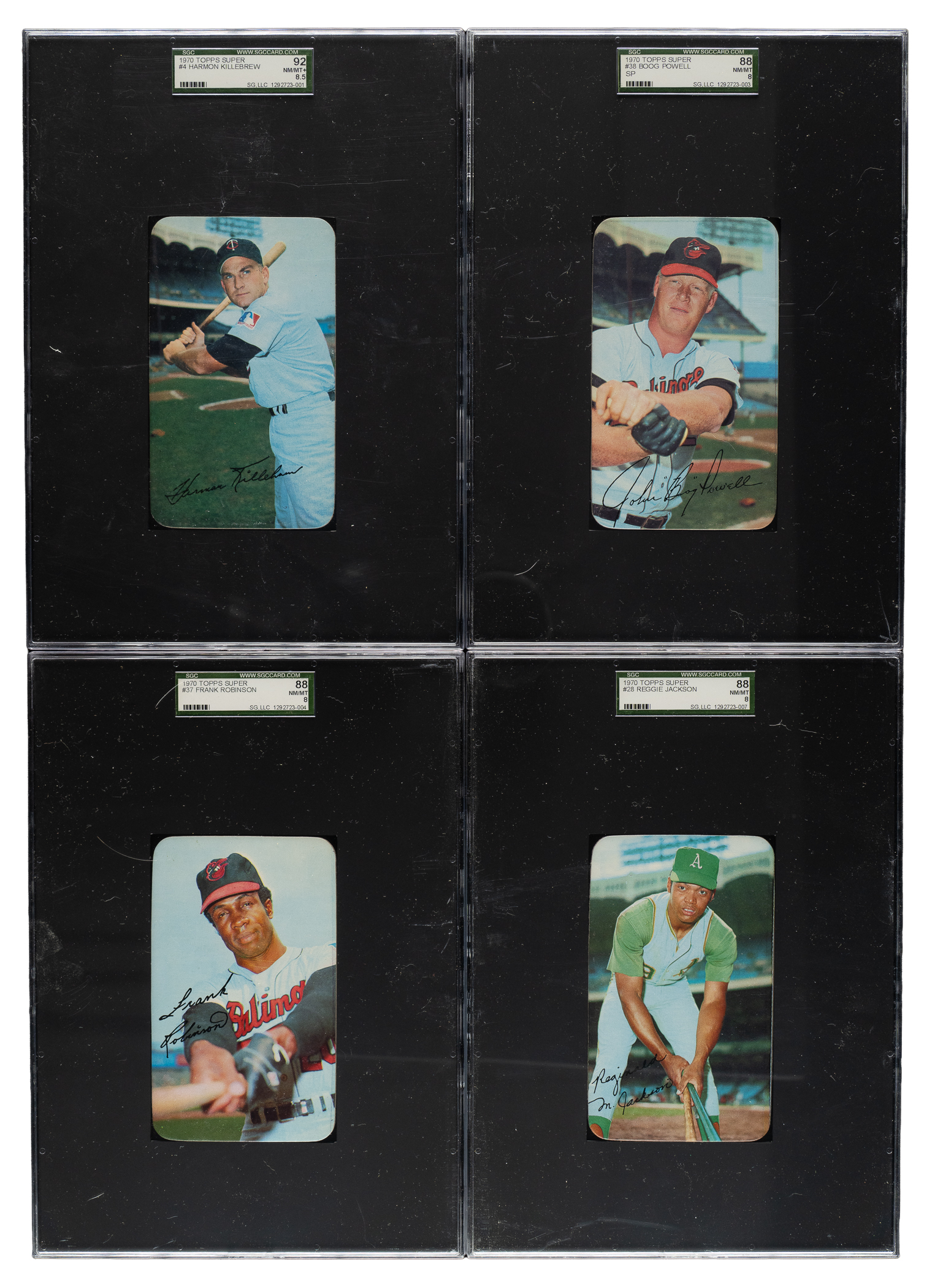 Presented is a complete 42-card set of 1970 Topps Super highlighted by many Hall of Famers and stars including Willie Mays, Hank Aaron, and Roberto Clemente. Condition of the set is 45% Nr/Mt-Mt, 31% Nr/Mt, and 24% Ex to Ex-Mt (including a couple slightly lesser and one that measures small). Nine cards have been professionally graded and encapsulated by SGC. Keys: #4 Killebrew (NM/MT+ 92), 7 (NM/MT 88), 8 Bench (Nr/Mt), 9 (NM/MT 88), 12 Clemente (Nr/Mt-Mt), 18 Mays (Nr/Mt-Mt), 24 Aaron (Ex), 27 (NM/MT 88), 28 Jackson (NM/MT 88), 30 (NM/MT 88), 34 Rose (Nr/Mt+), 35 (NM/MT 88), 37 F. Robinson SP (NM/MT 88), and 38 Powell SP (NM/MT 88). Because of their scarcity relative to other Topps sets of the era, it is a little surprising that this issue has not received more attention from collectors. This is primarily because, for many years, grading companies did not have holders for this large-format issue. This is no longer the case, and collectors can now build sets of these cards in graded form just like they've done for many years with standard-sized cards. An extremely attractive and mostly high-grade complete set with several notable highlights. Total: 42 cards.