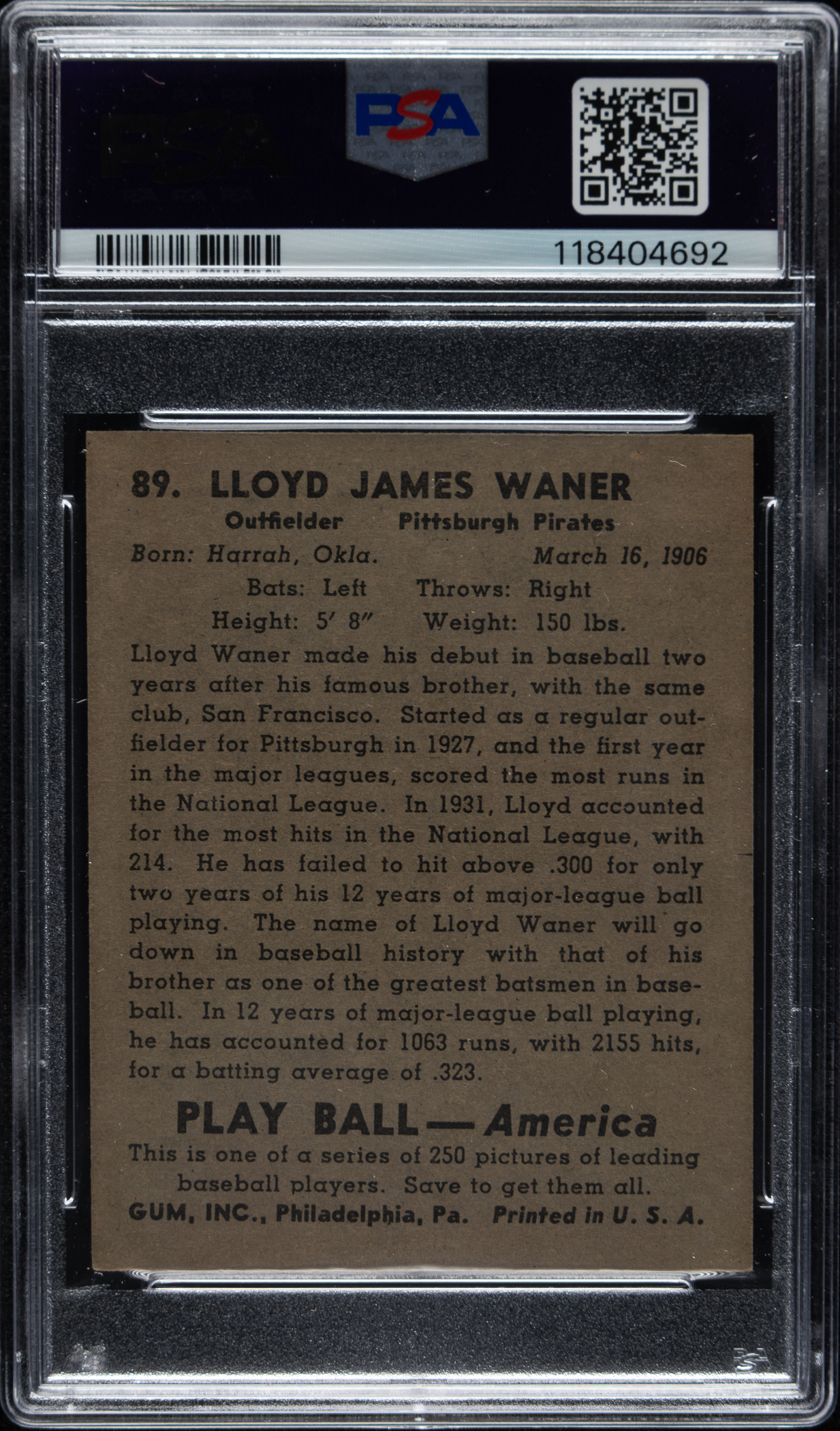 Graded NM 7 by PSA. Pittsburgh Pirates Hall of Famer Llyod Waner.