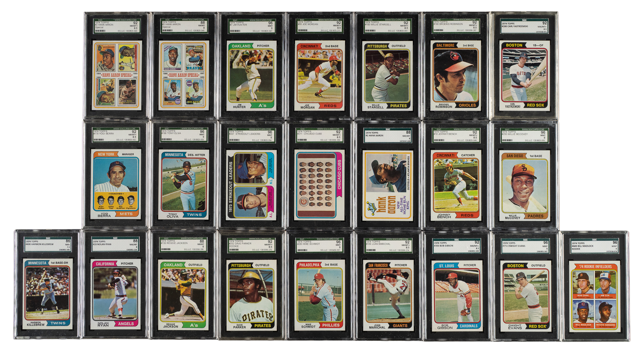 Crisp and clean complete 1974 Topps set. This is a beautiful set with many high-grade cards, highlighted by a PSA MINT 9 example of the #456 Dave Winfield rookie card. Included are all 15 "Washington, Nat'l" variations, and variations for cards #608 and 654. Condition is 67% Nr/Mt to Nr/Mt-Mt (including some Mint) and 33% Ex to Ex-Mt (including a few slightly lesser). Twenty-six cards have been professionally graded and encapsulated by SGC (25) and PSA (1). SGC Grading Composite: MINT 96 (10 cards): #7 Hunter, 190 Oliva, 207 K Ldrs w/ Ryan and Seaver, 250 McCovey, 283 Schmidt, 300 Rose, 340 Munson, 351 Evans, 456 Winfield RC (PSA MINT 9), and 600. NM/MT+ 92 (11 cards): #2 Aaron Special, 10 Bench, 85 Morgan, 100 Stargell, 160 B. Robinson, 179 Berra, 211 Cubs, 252 Parker RC, 280 Yastrzemski, 330 Marichal, and 350 Gibson. NM/MT 88 (4 cards): #1 Aaron, 5 Aaron Special, 20 Ryan, and 130 Jackson. NM+ 86 (1 card): #400 Killebrew. Unencapsulated Key: #250a McCovey/Washington (Nr/Mt+). This is a superior high-grade 1974 Topps complete set with numerous highlights. The equivalent SMR value for just the 26 graded cards (factoring in the 12 half grades at the lower whole-grade level) is $5,650. Total: 677 cards (set of 660 plus 17 variations). The size/weight of this item requires that there will be an additional shipping charge for this lot.