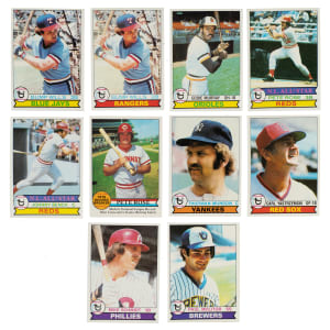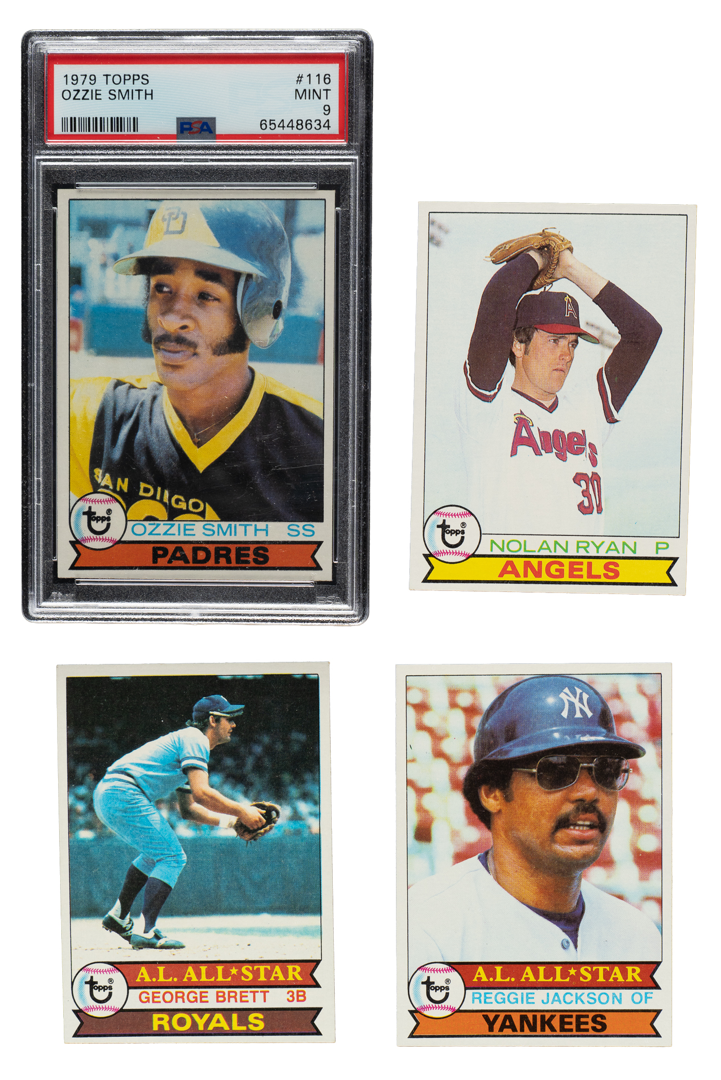 The rookie card of Ozzie Smith highlights the 1979 Topps issue, one of the very popular sets of the 1970s. Includes both variations of #369 Bump Wills. Condition is 66% Nr/Mt to Nr/Mt-Mt (including a few Mint) and 34% Ex to Ex-Mt (including 4% lesser due to light factory surface wrinkles). Keys: #115 Ryan (Nr/Mt+), 116 Smith RC (PSA MINT 9), 330 Brett (Nr/Mt+ due to centering), and 640 Murray (Mint). This is an extremely attractive high-grade complete set of this classic 1970s Topps issue highlighted by a PSA-graded MINT 9 example of the key Ozzie Smith rookie. Total: 727 cards.