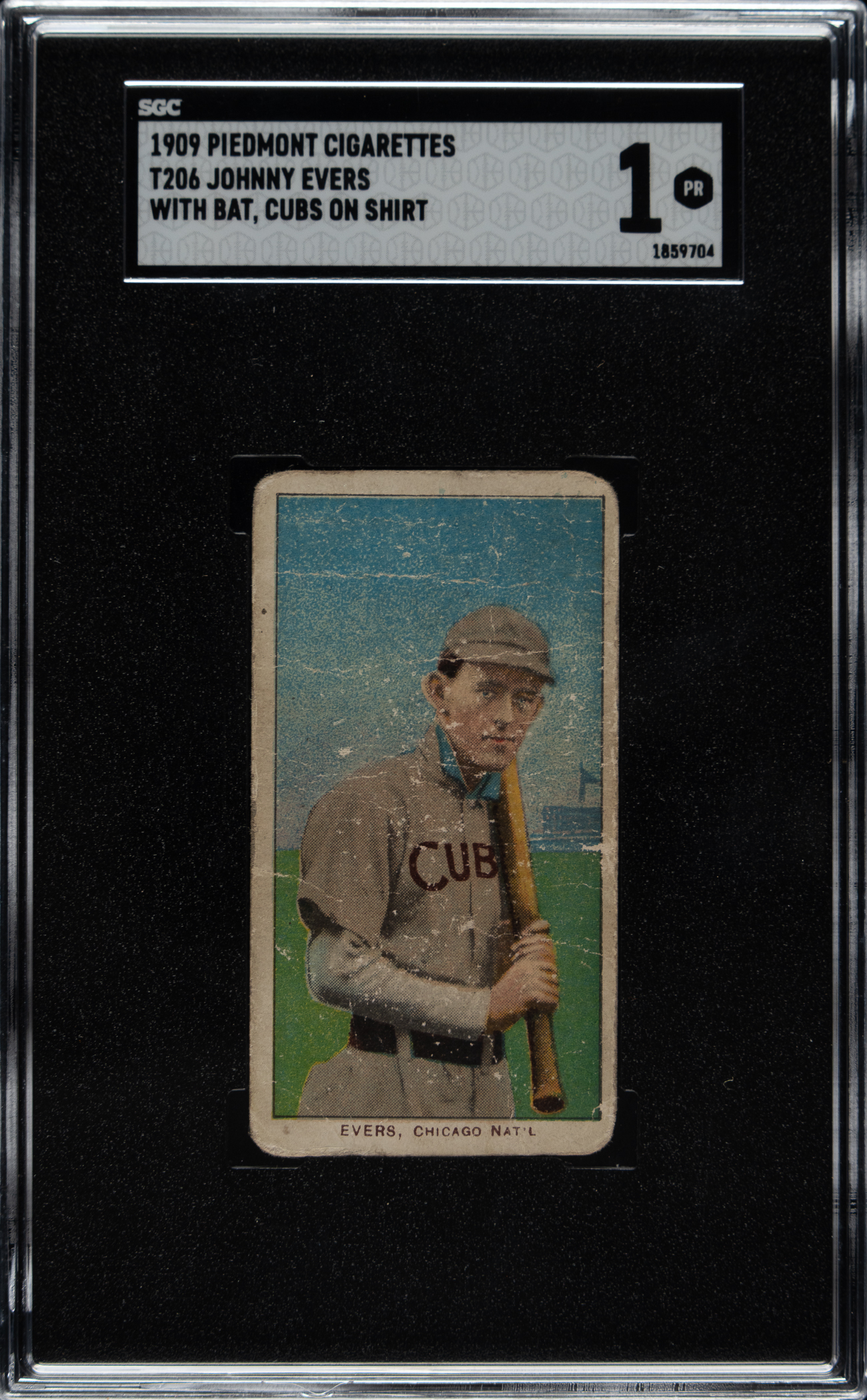 Lot # 308: 1909-1911 T206 White Border Johnny Evers with Bat, Cubs on Shirt SGC POOR 1