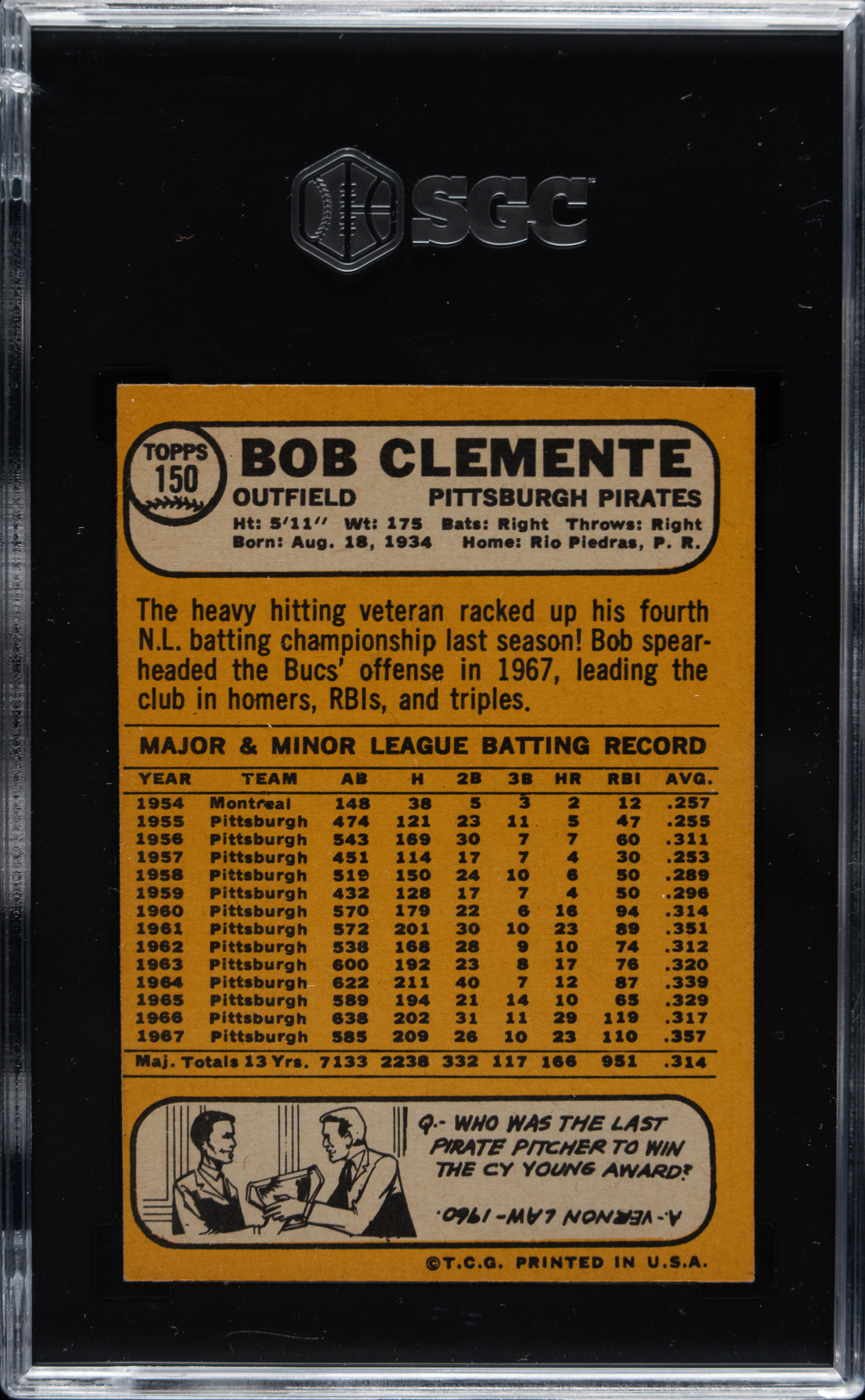 Graded EX/NM 6 by SGC. Pittsburgh Pirates Hall of Famer Roberto Clemente. Please note that this card is currently being reholdered with SGC. SGC turnaround times may delay the post-auction shipping of this item.