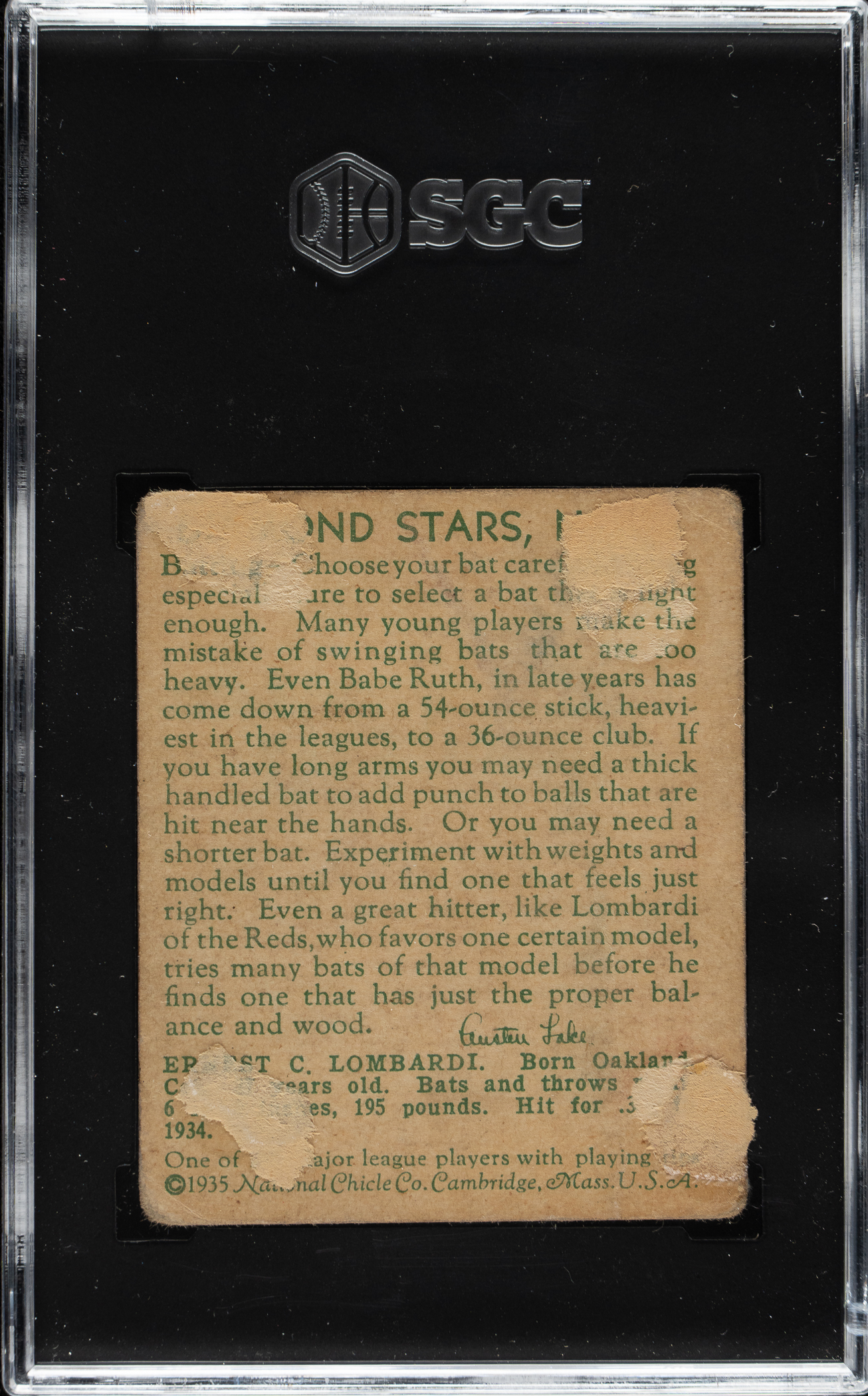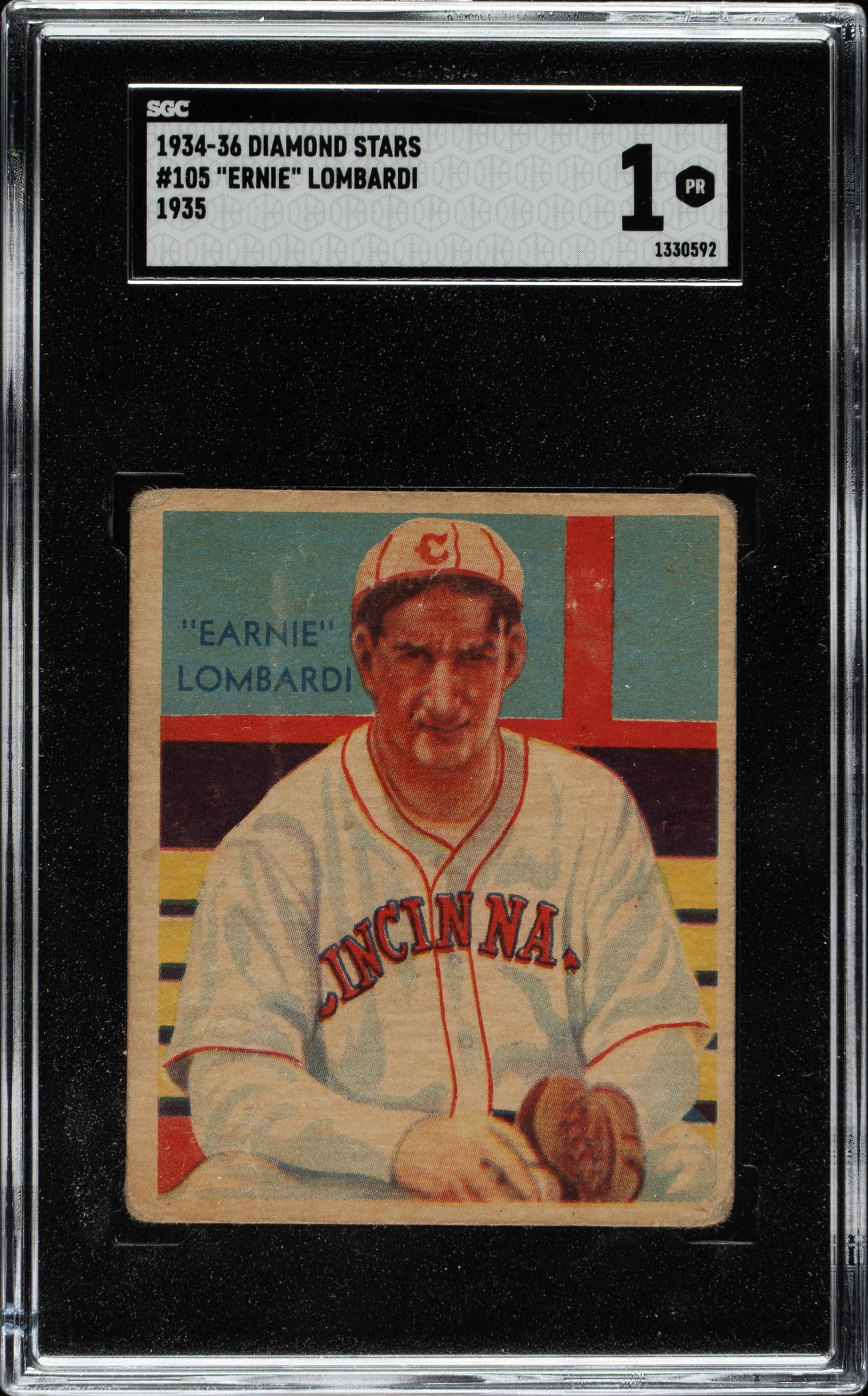 Lot # 1151: 1934-1936 R327 Diamond Stars #36 Ernie Lombardi - "Earnie" Error Card (1935 Green Back) SGC POOR 1