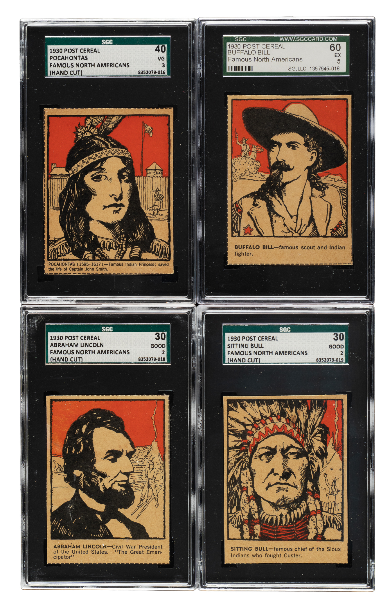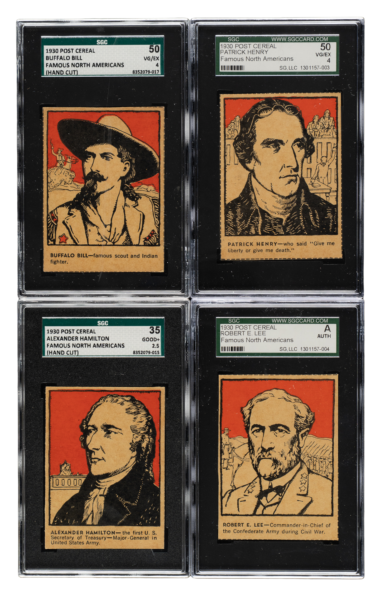 Collection of eight 1930 Post Cereal "Famous North Americans" cards, each graded and encapsulated by SGC. SGC Grading Composite: EX 60 (1 card): Buffalo Bill. VG/EX 50 (2 cards): Buffalo Bill and Patrick Henry. VG 40 (1 card): Pocahontas. GOOD+ 35 (1 card): Alexander Hamilton. GOOD 30 (2 cards): Abraham Lincoln and Sitting Bull. Authentic (1 card): Robert E. Lee. Total: 8 cards. The size/weight of this item requires that there will be an additional shipping charge for this lot.