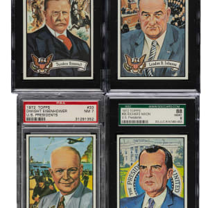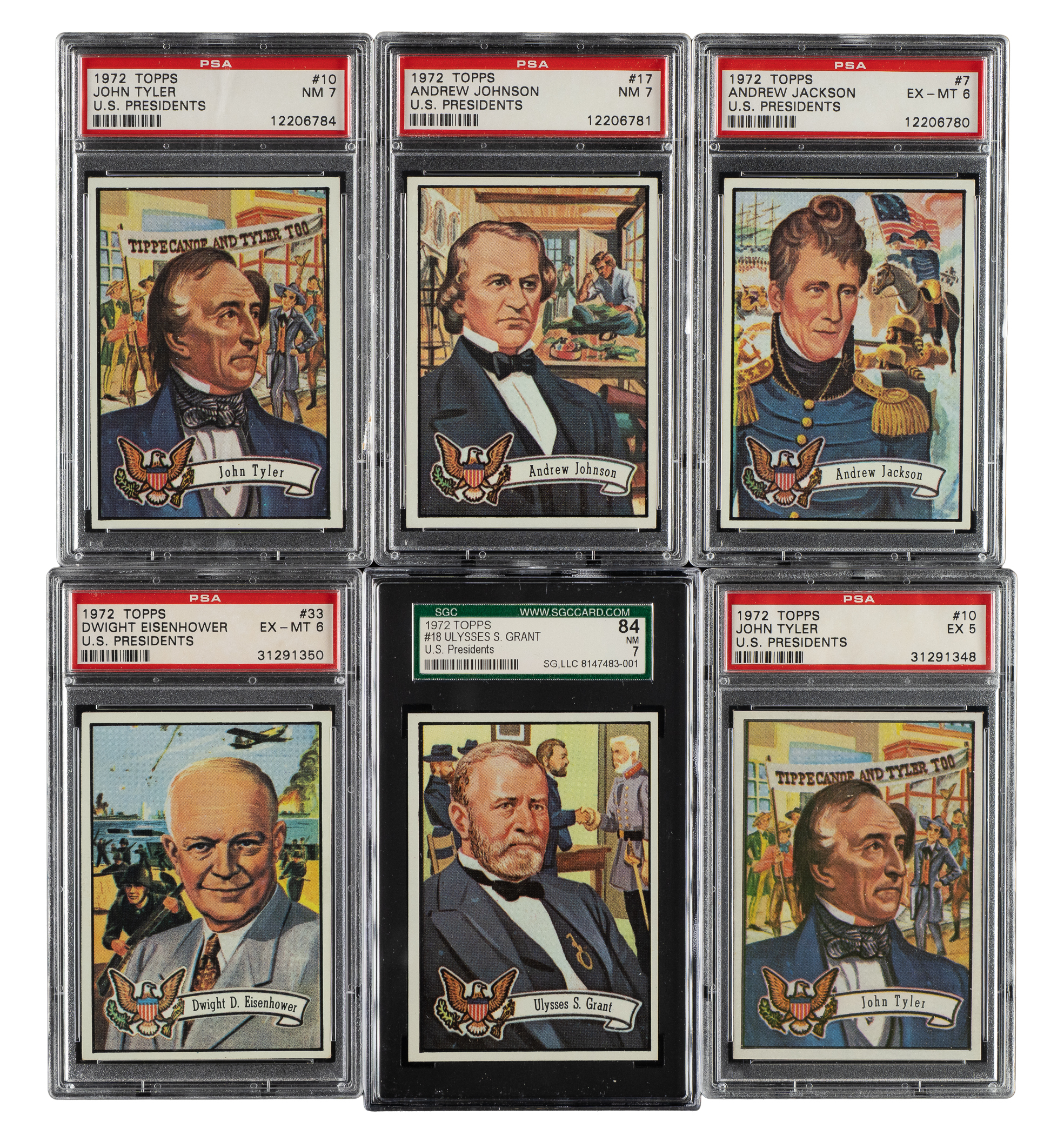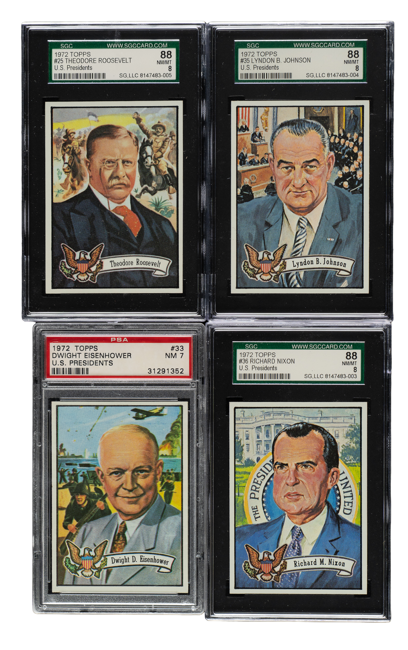 Collection of ten 1972 Topps "U.S. Presidents" cards, each graded and encapsulated by PSA or SGC. SGC Grading Composite: NM/MT 88 (3 cards): #25, 35, and 36. NM 84 (4 cards): #10 (PSA), 17 (PSA), 18, and 33 (PSA). EX/MT 80 (2 cards): #7 (PSA) and 33 (PSA). EX 60 (1 card): #10 (PSA). Total: 10 cards.