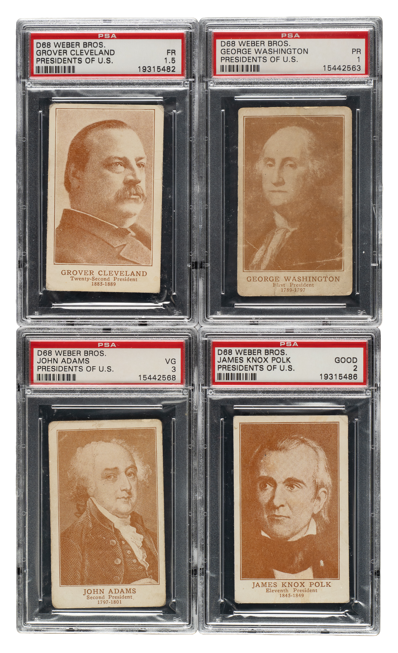 Collection of ten 1920s D68 Weber Bros. "Presidents of the United States" cards, each graded and encapsulated by PSA. PSA Grading Composite: VG 3 (2 cards): Adams and Wilson (MK). GOOD 2 (1 card): Polk. FAIR 1.5 (5 cards): Cleveland (Twenty-Second), Harrison (MK), McKinley, Monroe (MK), and Wilson. POOR 1 (2 cards): Hayes and Washington. Total: 10 cards.