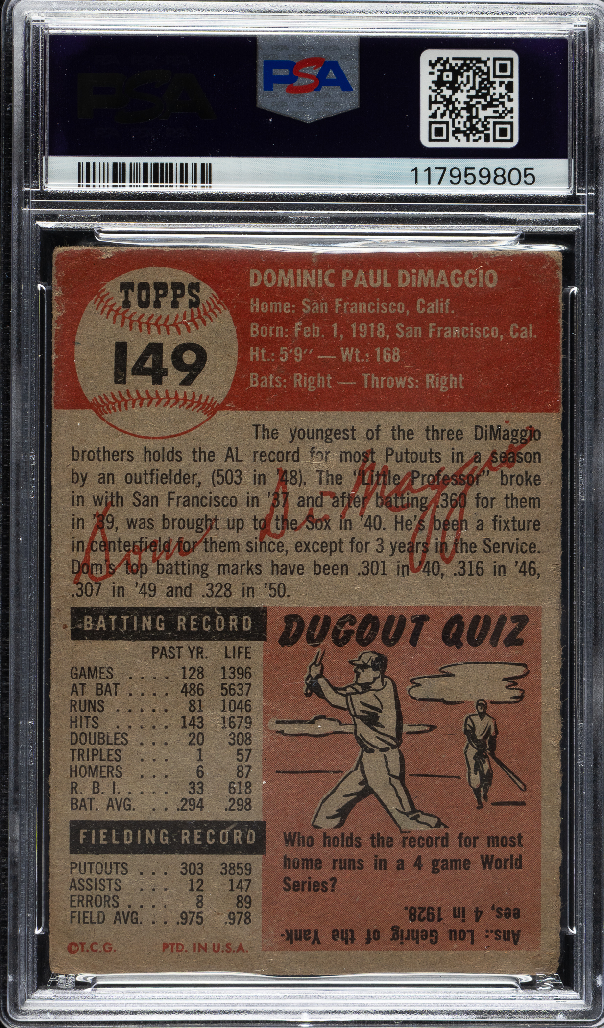 PSA/DNA has encapsulated the card, grading the signature GEM MINT 10 and the card POOR 1. Boston Red Sox.