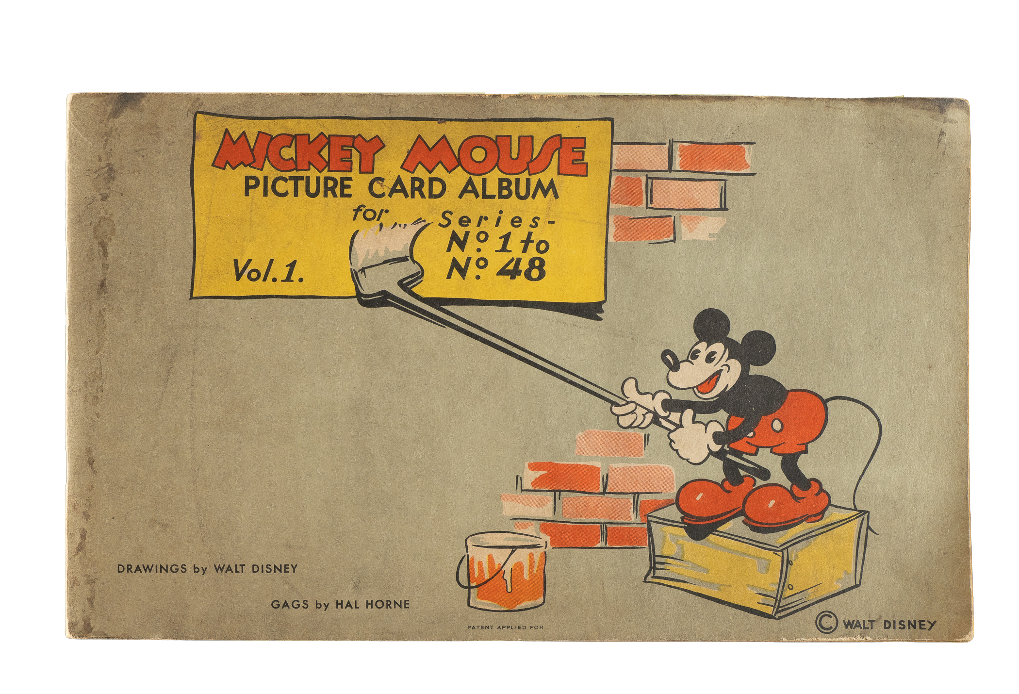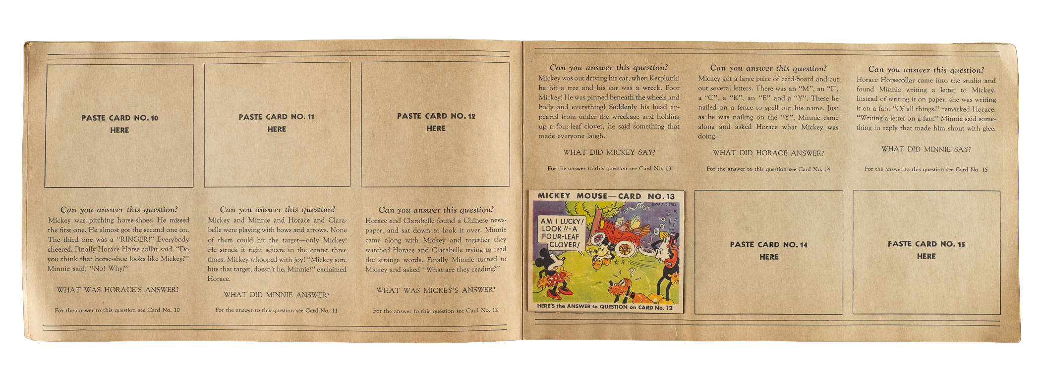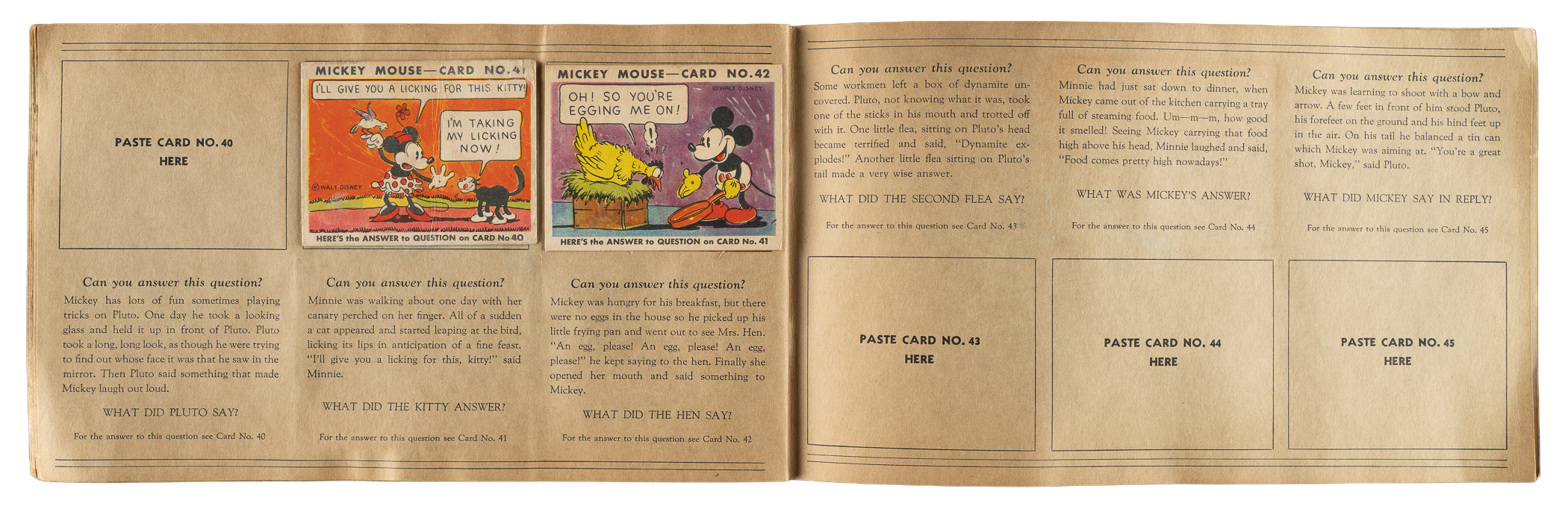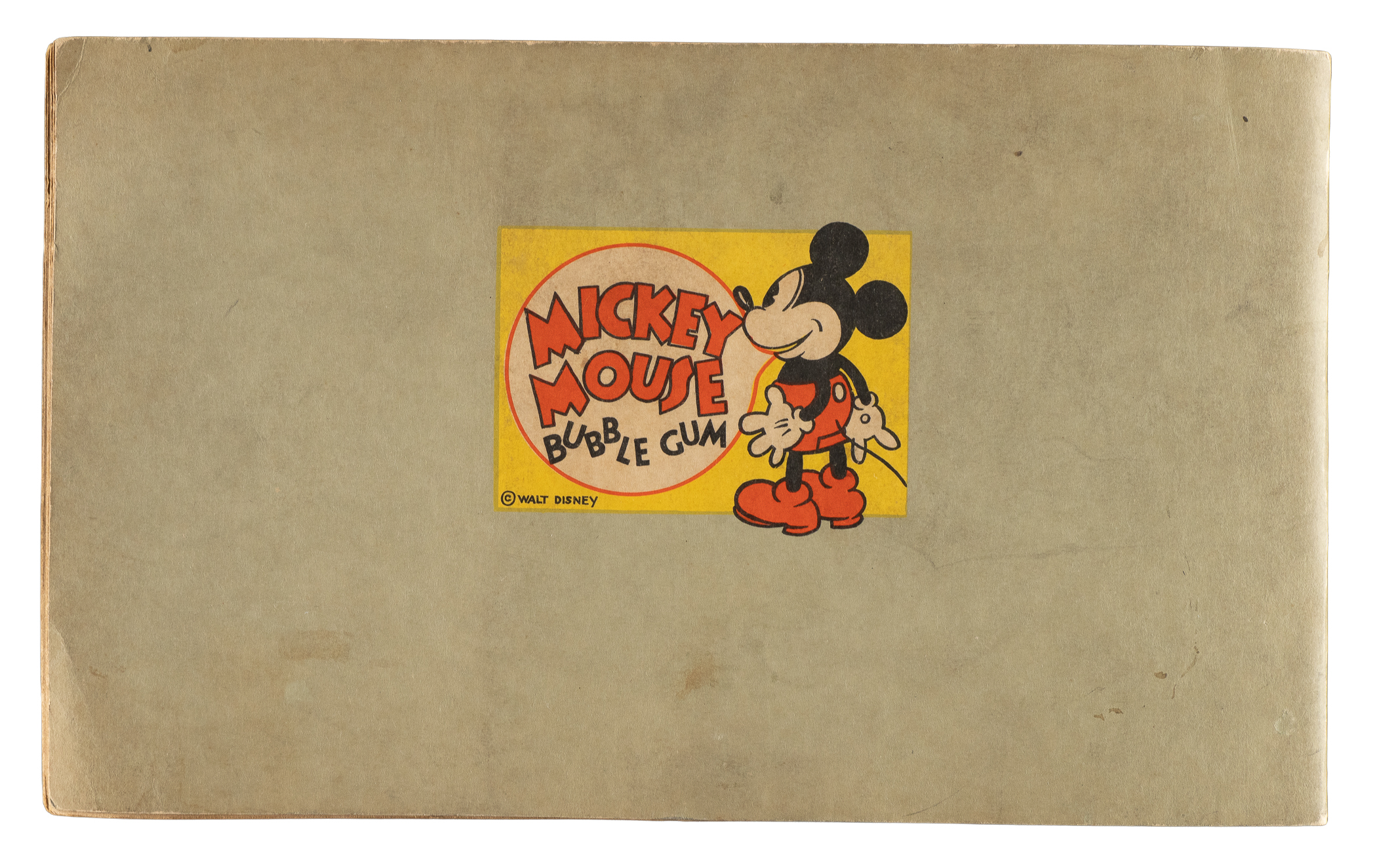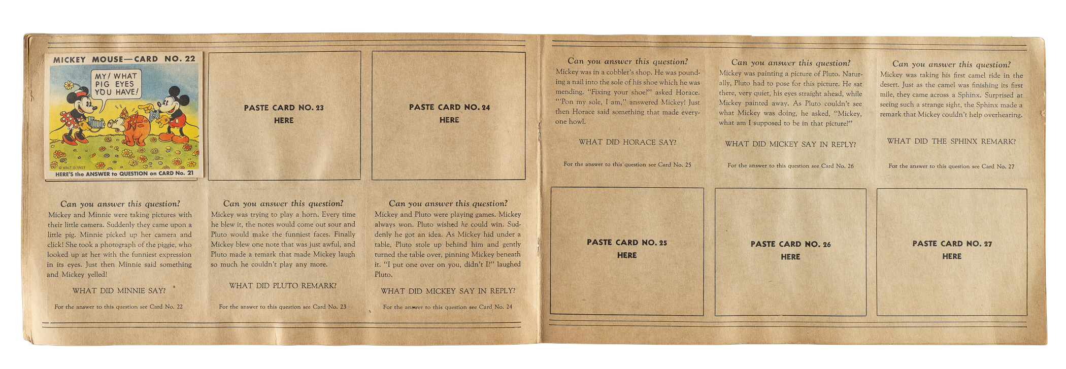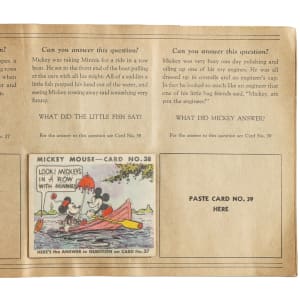 Rarely offered collection of nine different 1935 R89 "Mickey Mouse" Bubble Gum cards issued by Gum, Inc. Each card is housed in the original album (affixed with glue), with six cards presenting from Vg to Ex and three lesser. This collection consists of the following #13, 20, 22, 29, 30, 36, 38, 41, and 42. The original "Vol. 1" album in which the cards are mounted is in Very Good condition, with some soiling to the front cover. Mickey Mouse Bubble Gum cards are an iconic 1930s nonsport bubble-gum card set. The brilliant colors, high-quality artwork, and popular subject matter make this set a favorite with collectors. It is worth noting that cards from this set are much scarcer than most collectors realize and far more difficult to find than most baseball cards of the era. This is a relatively affordable yet still attractive group of one of the most popular of all 1930s gum-card sets with tremendous crossover appeal to both card collectors and Mickey Mouse collectors. Total: 9 cards mounted in original album.