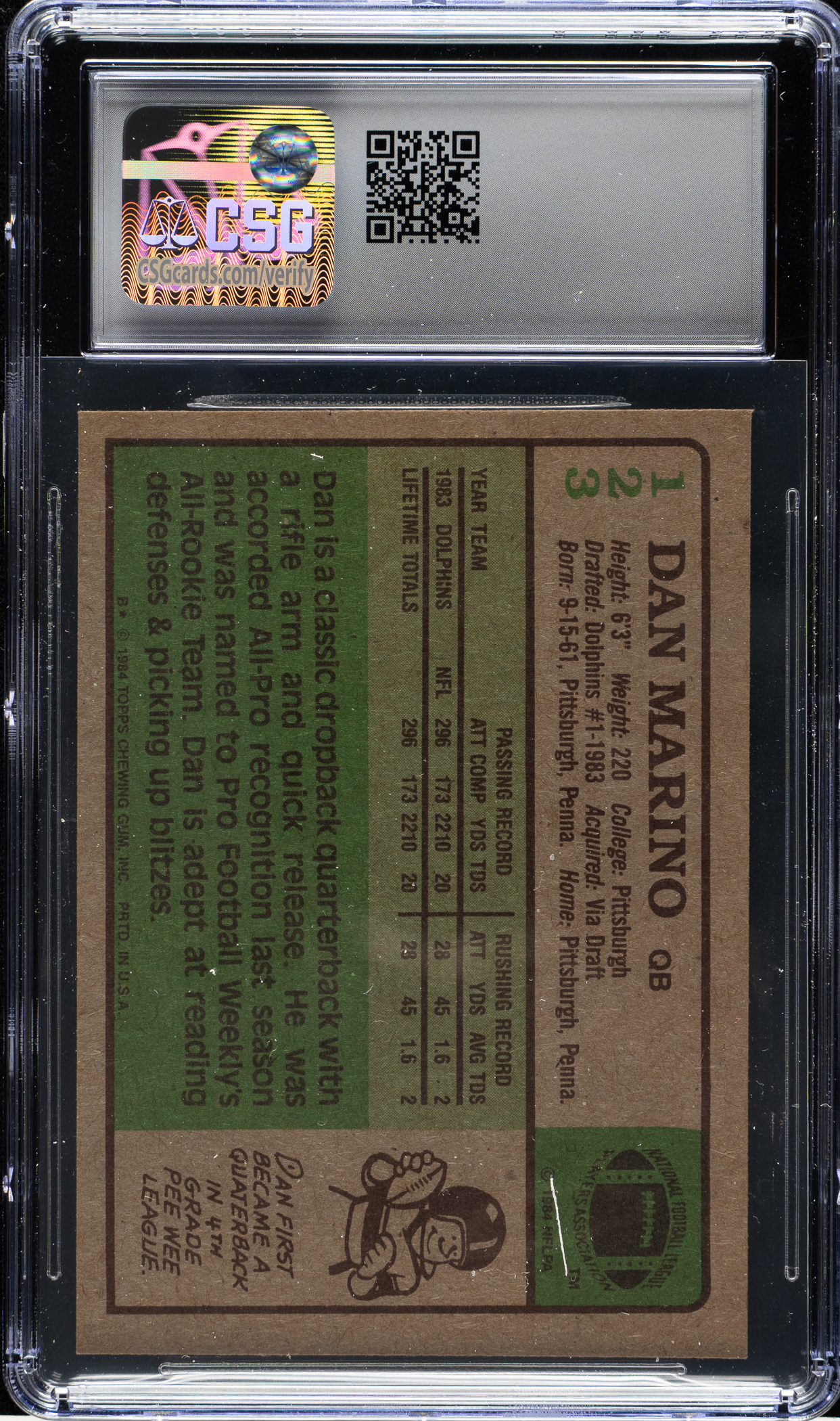 Graded NM/MT+ 9.5 by CSG. Miami Dolphins football Hall of Famer Dan Marino.