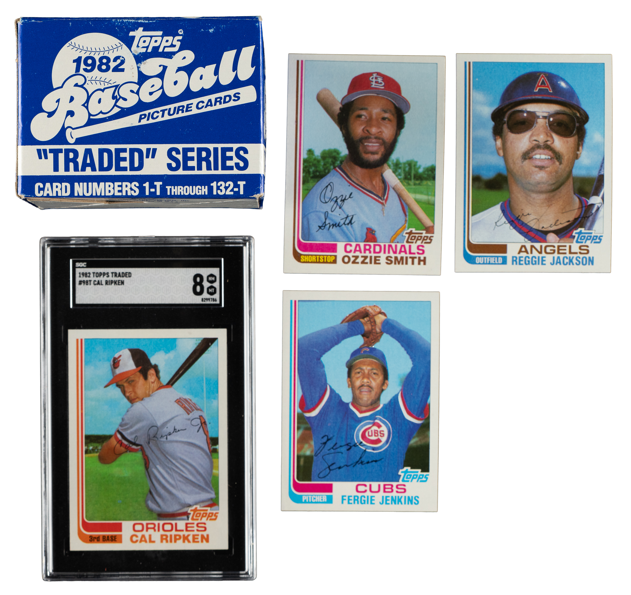 Complete 132-card set of 1982 Topps Traded baseball cards. Condition is 55% Nr/Mt to Nr/Mt-Mt, 30% Ex to Ex-Mt, 10% Vg to Vg Ex, and 5% lesser (due to extreme miscuts). Keys: #47T Jackson (Vg-Ex), 98T Ripken (SGC NM/MT 8), and 109T Smith (Nr/Mt). Total: 132 cards. The size/weight of this item requires that there will be an additional shipping charge for this lot.