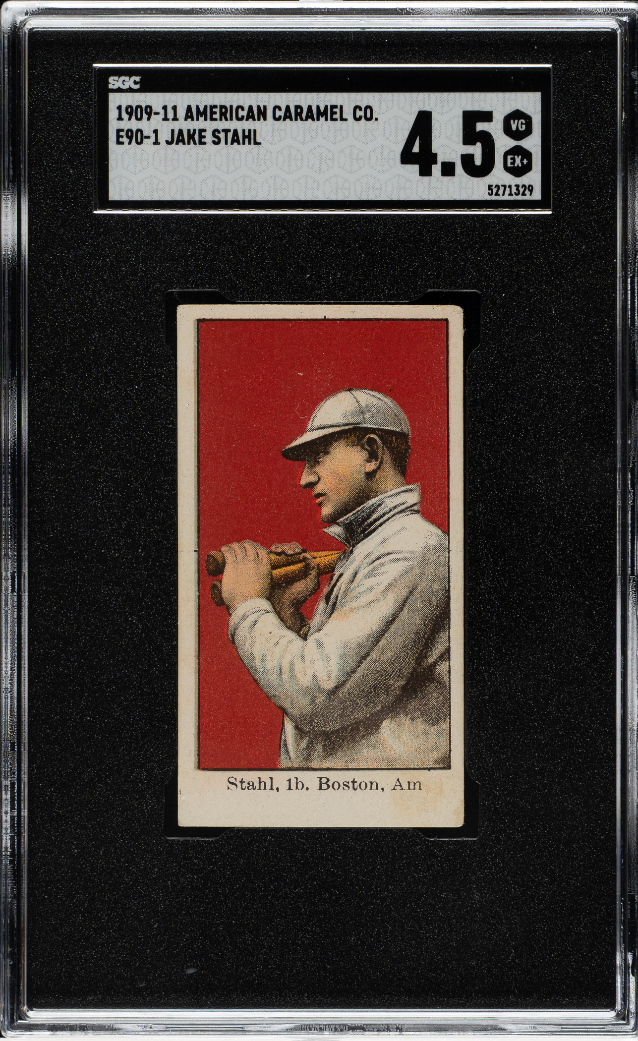 Graded VG/EX+ 4.5 by SGC. This is the ONLY example graded at this level by SGC with none higher! Extremely attractive example of Boston Red Sox first baseman Jake Stahl from the E90-1 American Caramel series. Stahl is consistently recognized as one of the toughest "commons" within the set, often eluding set builders in any condition, let alone an example as nice as the one offered.
