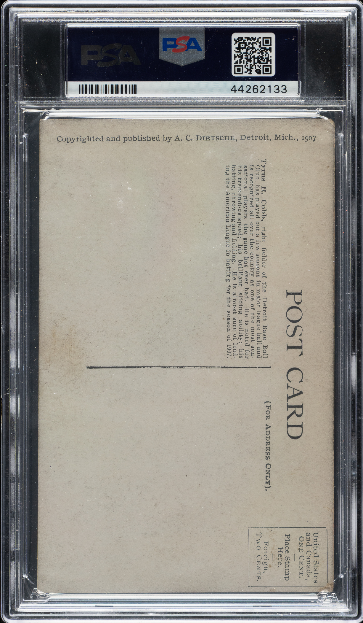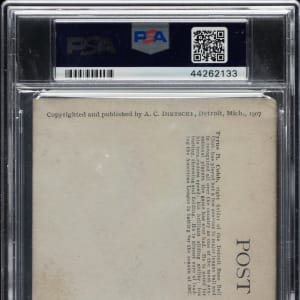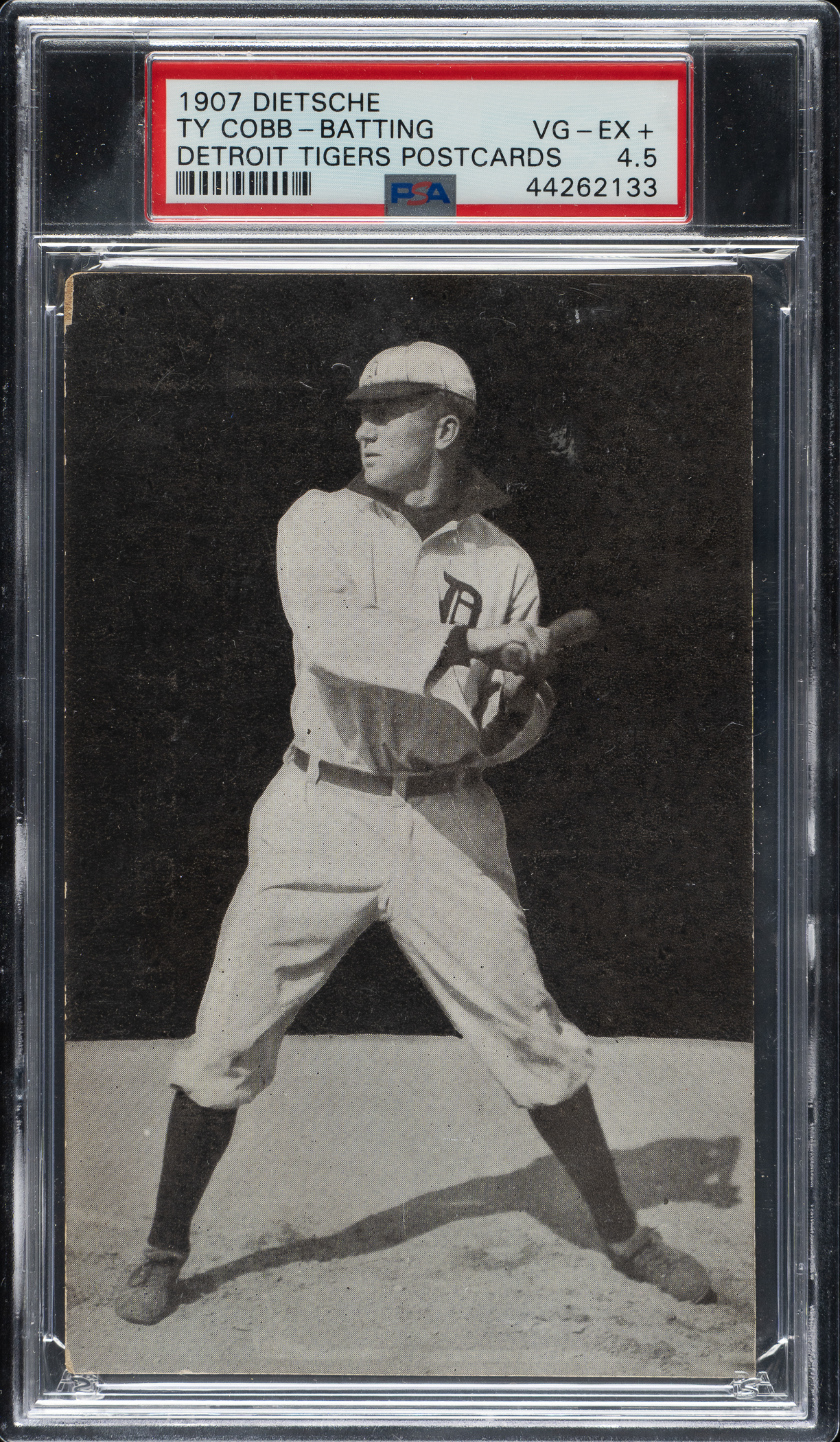 Graded VG-EX+ 4.5 by PSA. Extremely attractive example of Ty Cobb's "batting" pose variation card from the highly regarded A. C. Dietsche Detroit Tigers postcard set, issued in 1907. This issue was produced by the Dietsche Postcard Company of Detroit to commemorate the Tigers' participation in the 1907 World Series. This card is considered by many collectors to be Cobb's true rookie card, though a number of other issues can also claim that important distinction. (We realize that the definition of what is a player's rookie card can sometimes be very controversial and vary from collector to collector.) The fact that the Dietsche postcard set features a short biography of the player on the back makes this postcard even more "card-like" than many more traditional issues. The card features a crisp black-and-white image of Cobb batting, with moderate wear on both the upper and lower left corners, and very light soiling on the reverse. The Dietsche postcard of Ty Cobb represents an outstanding overlooked value compared to most other early Cobb cards, including those issued a couple of years later that are widely recognized by many collectors as Cobb's rookie cards. This is an outstanding example of what many collectors think reasonably qualifies as Cobb's true rookie card.