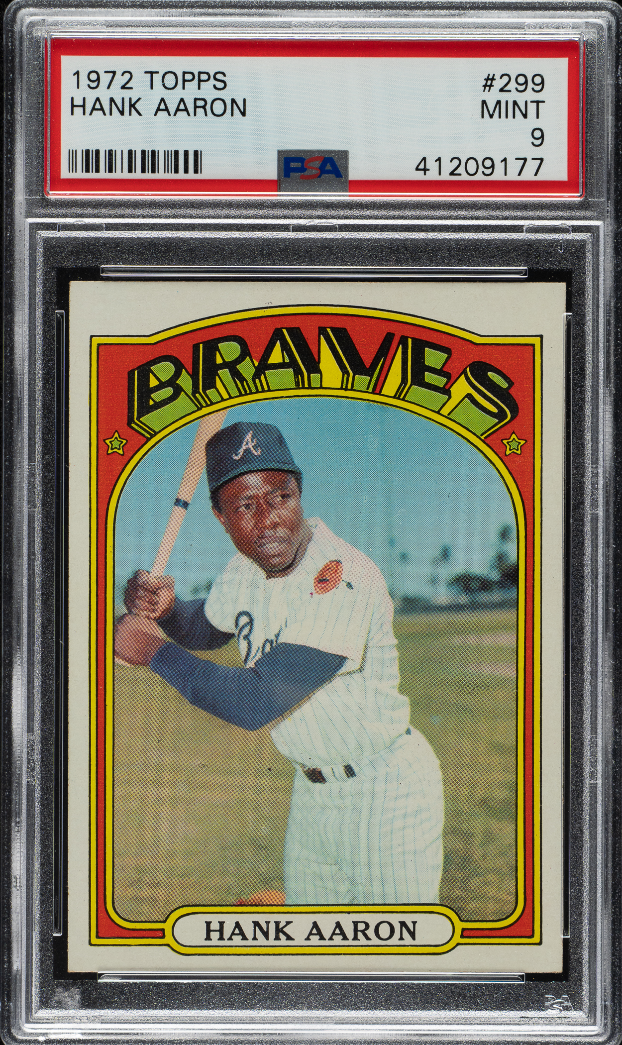 Graded MINT 9 by PSA. Stunning example of Atlanta Braves Hall of Famer Hank Aaron from the 1972 Topps set. One of the key cards to the extremely popular 1970s Topps set, the offered card is bright, crisp and clean, both front and back, with sharp corners and brilliant colors. An ideal example worthy of the finest 1972 Topps set or Hank Aaron collection.