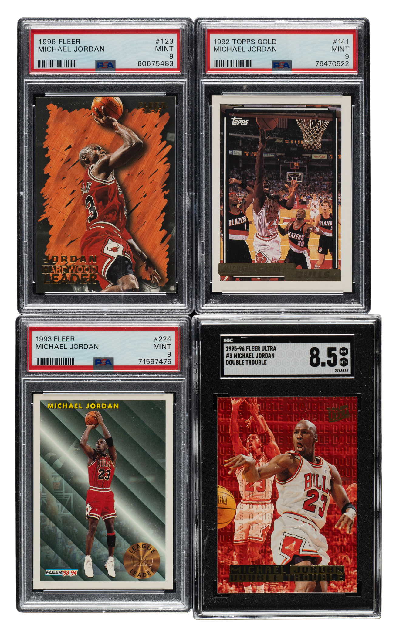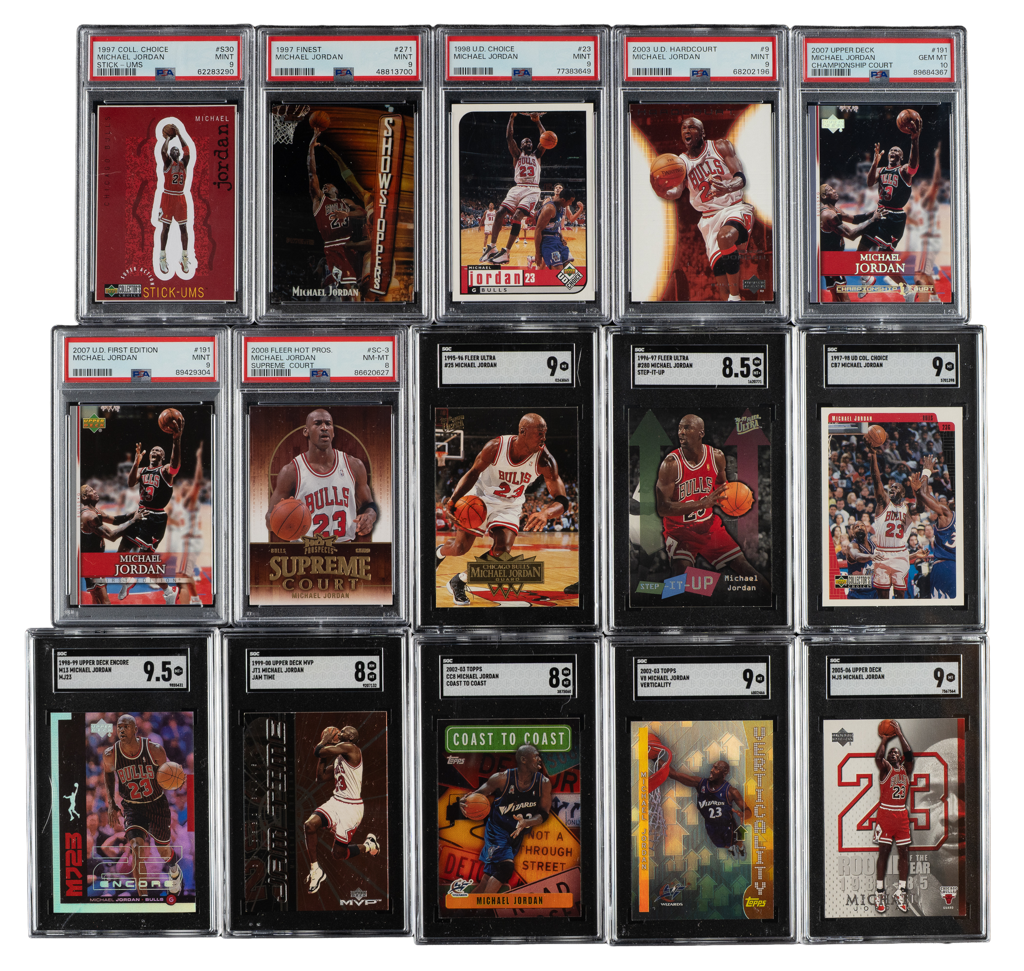 Collection of nineteen 1992 to 2008 Topps, Fleer, and Upper Deck basketball cards, featuring Chicago Bulls basketball Hall of Famer Michael Jordan. Each card has been graded and encapsulated by PSA (10) or SGC (9). This collection consists of the following: 1) 1992-1993 Topps Gold (1 card): #141 Jordan (MINT 9). 2) 1993-1994 Fleer (1 card): #224 Jordan (MINT 9). 3) 1995-1996 Fleer Ultra (1 card): #25 Jordan (SGC MINT 9). 4) 1995-1996 Fleer Ultra Double Trouble (1 card): #3 Jordan (SGC NM/MT+ 8.5). 5) 1996-1997 Fleer (1 card): #123 Jordan (MINT 9). 6) 1996-1997 Fleer Ultra Step-It-Up (1 card): #280 Jordan (SGC NM/MT+ 8.5). 7) 1997-1998 Upper Deck Collector's Choice (1 card): #23 Jordan (SGC MINT 9). 8) 1997-1998 Upper Deck Collector's Choice Stick-Ums (1 card): #S30 Jordan (MINT 9). 9) 1997-1998 Finest (1 card): #271 Jordan (MINT 9). 10) 1998-1999 Upper Deck Encore MJ23 (1 card): #M13 Jordan (SGC MINT+ 9.5). 11) 1998-1999 Upper Deck Choice (1 card): #23 Jordan (MINT 9). 12) 1999-2000 Upper Deck MVP Jam Time (1 card): #JT1 Jordan (SGC NM/MT 8). 13) 2002-2003 Topps Coast to Coast (1 card): #CC8 Jordan (SGC NM/MT 8). 14) 2002-2003 Topps Verticality (1 card): #V8 Jordan (SGC MINT 9). 15) 2003-2004 Upper Deck Hardcourt (1 card): #9 Jordan (MINT 9). 16) 2005-2006 Upper Deck (1 card): #MJ5 Jordan (SGC MINT 9). 17) 2007-2008 Upper Deck Championship Court (1 card): #191 Jordan (GEM MINT 10). 18) 2007-2008 Upper Deck First Edition (1 card): #191 Jordan (MINT 9). 19) 2008-2009 Fleer Hot Prospects Supreme Court (1 card): #SC-3 Jordan (NM-MT 8). Total: 19 cards. The size/weight of this item requires that there will be an additional shipping charge for this lot.