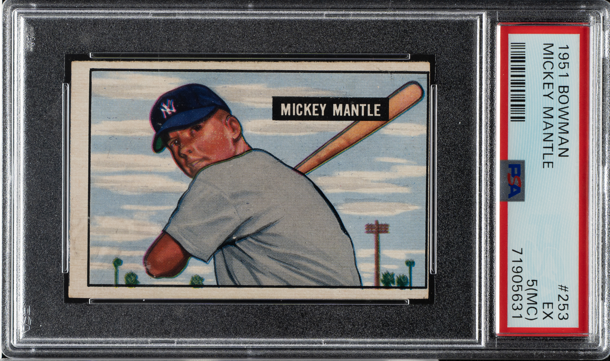 Graded EX 5 (MC) by PSA. One of card collecting's classics, Mickey Mantle's Bowman rookie card is the key to the 1951 set and is one of the most popular of all postwar baseball cards. This card has bold colors, light corner wear, and centering toward the extreme right (hence the qualifier). Clean reverse. This is an appealing mid-grade example of this legendary card.